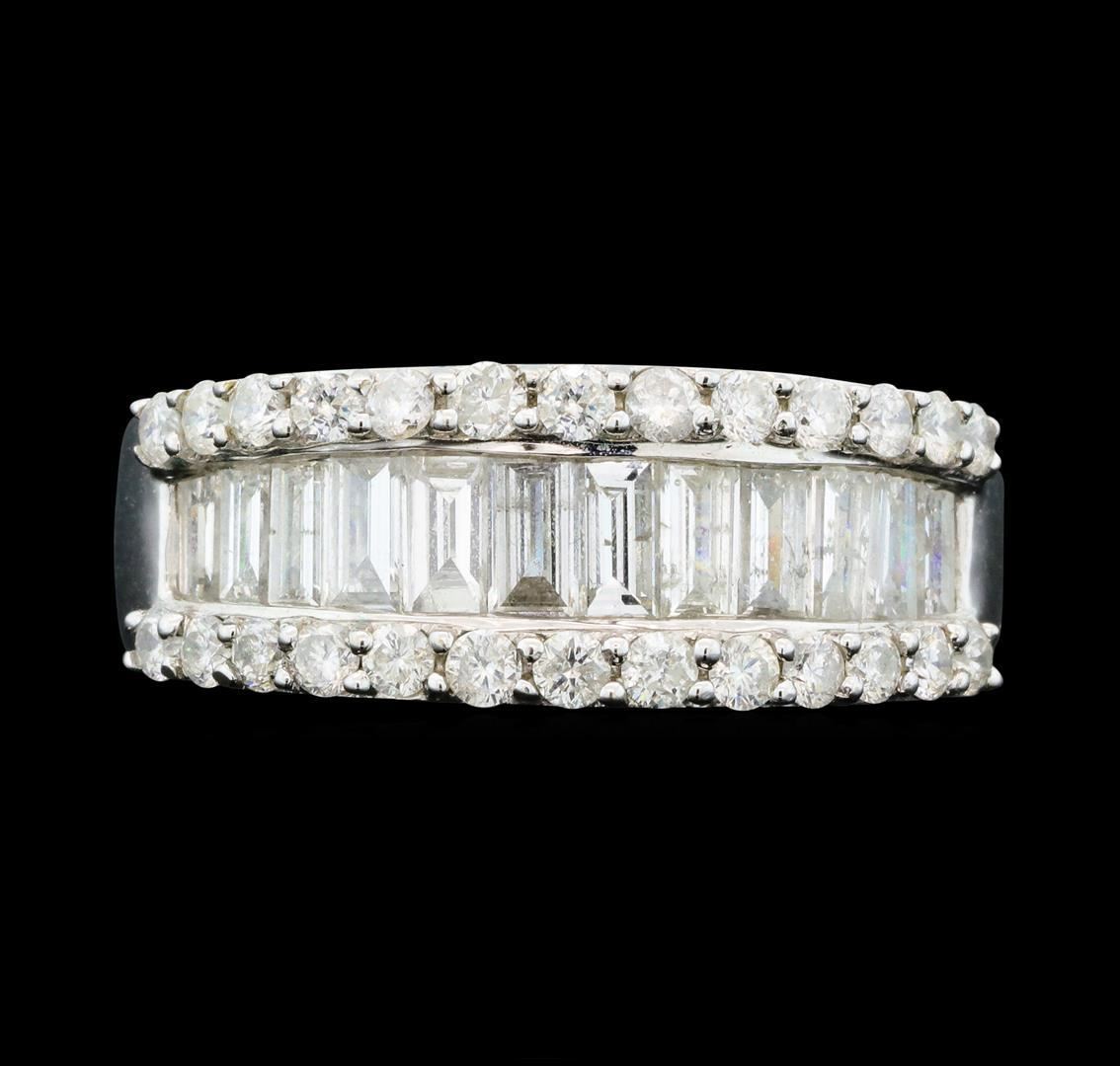 One electronically tested 14KT white gold lady's cast wedding band with a tapered shank with a bright polish finish. The featured lady's ring has a shank measuring 3.65 millimeters wide. Identified with markings of '14K'. Condition is like new, good workmanship. Containing: Twelve channel set baguette cut diamonds, measuring from 3.00 x 2.00 x 1.70mm (depth est.) to 3.90 x 2.20 x 1.87mm (depth est.) approximate total weight of 12 Stones = 1.42ct. Graded in the setting. Clarity SI-1 to I-1. Color: H - I Cut Good Twenty-Six prong set round brilliant cut diamonds, measuring 1.80 - 1.70 x 1.09mm (depth est.) approximate total weight of 26 Stones = 0.53ct. Graded in the setting. Clarity SI-2 to I-2. Color: H - I Cut Good. Total Weight of Diamonds 1.95ct.. Total Weight of Band 6.60gm. GAS Appraised.