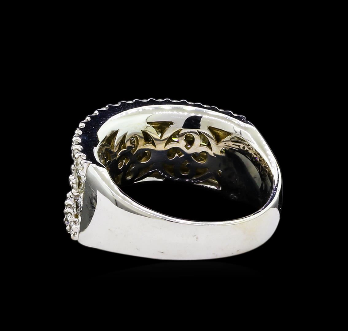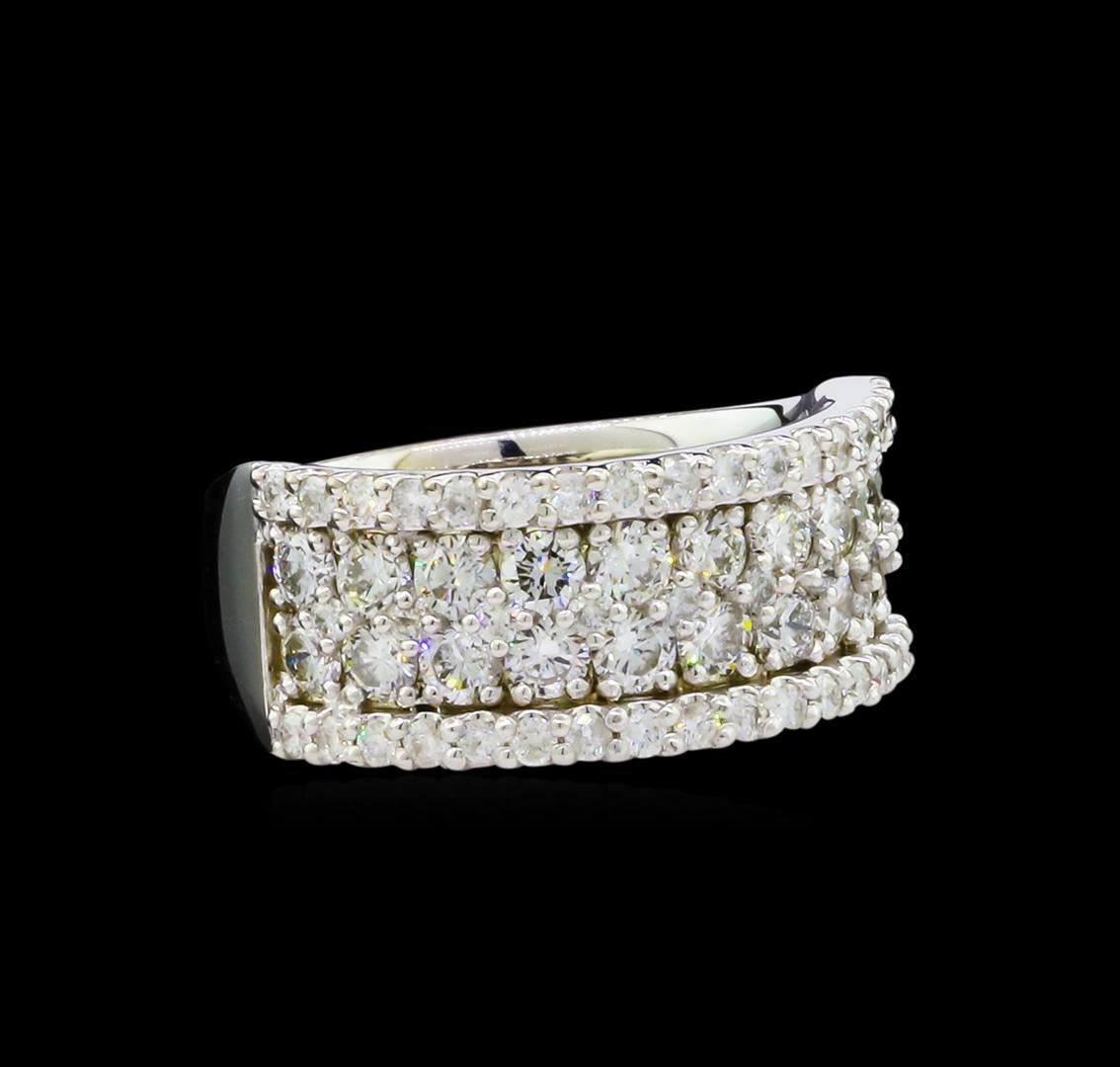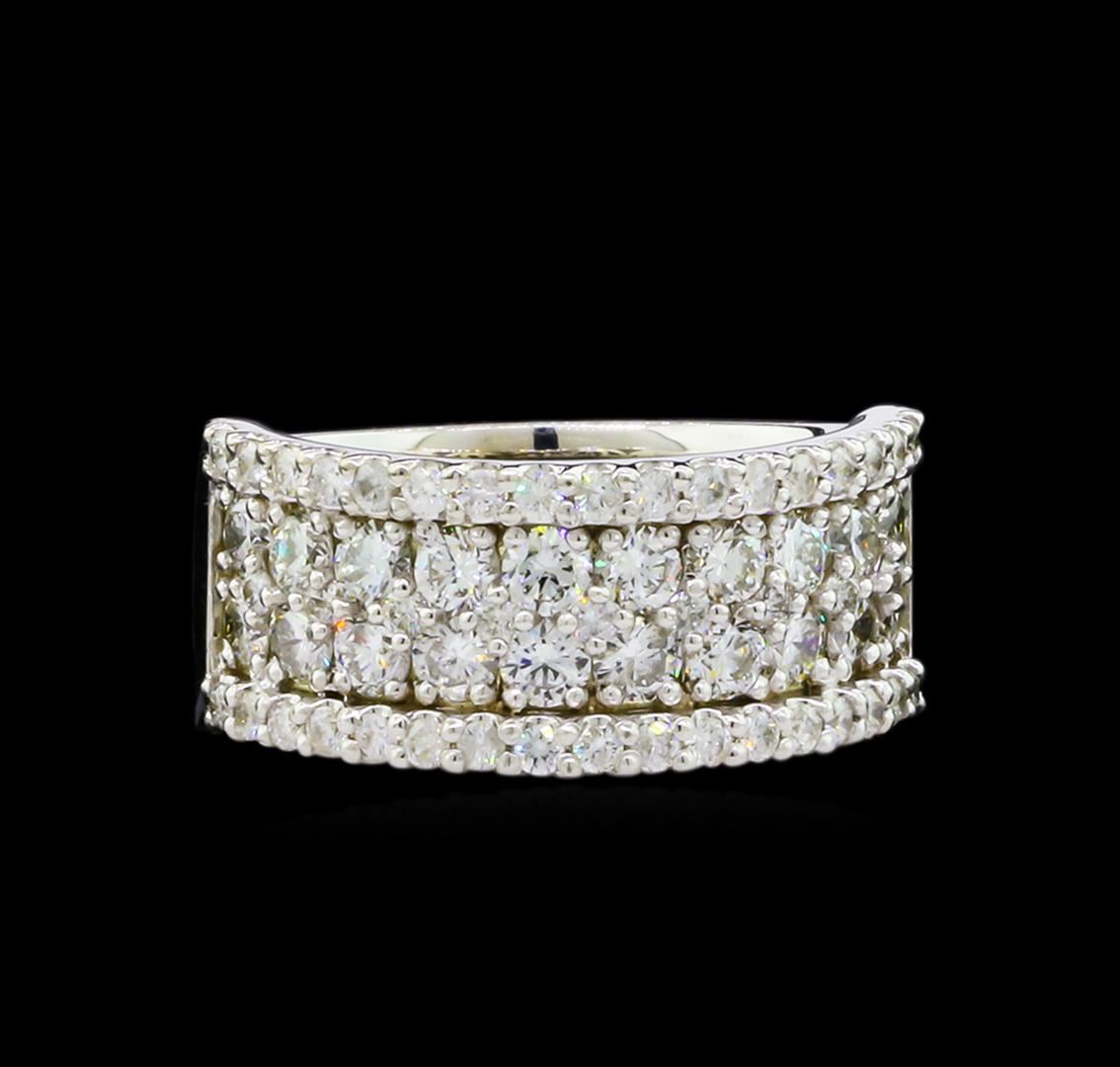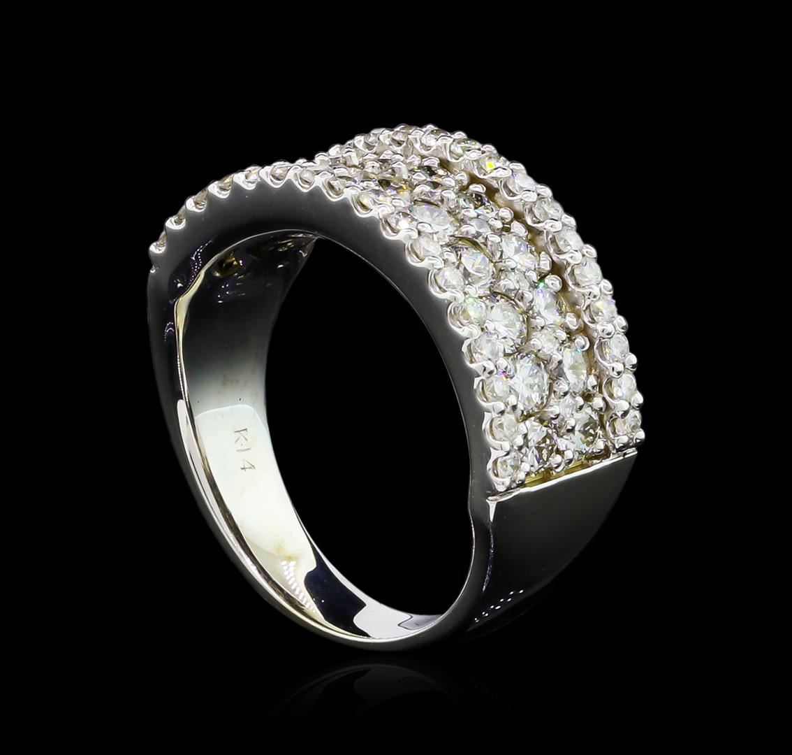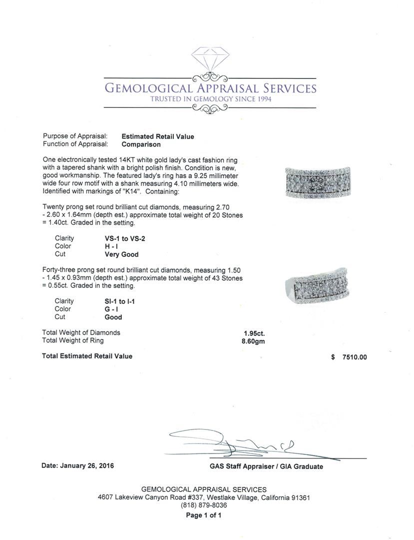 One electronically tested 14KT white gold lady's cast fashion ring with a tapered shank with a bright polish finish. The featured lady's ring has a 9.25 millimeter wide four row motif with a shank measuring 4.10 millimeters wide. Identified with markings of "K14". Condition is new, good workmanship. Containing: Twenty prong set round brilliant cut diamonds, measuring 2.70 - 2.60 x 1.64mm (depth est.) approximate total weight of 20 Stones = 1.40ct. Graded in the setting. Clarity: VS-1 to VS-2. Color: H - I. Cut Very Good Forty-Three prong set round brilliant cut diamonds, measuring 1.50 - 1.45 x 0.93mm (depth est.) approximate total weight of 43 Stones = 0.55ct. Graded in the setting. Clarity: SI-1 to I-1. Color: G - I. Cut Good. Total Weight of Diamonds 1.95ct. Total Weight of Ring 8.60gm. GAS Appraised at $7,510.00.