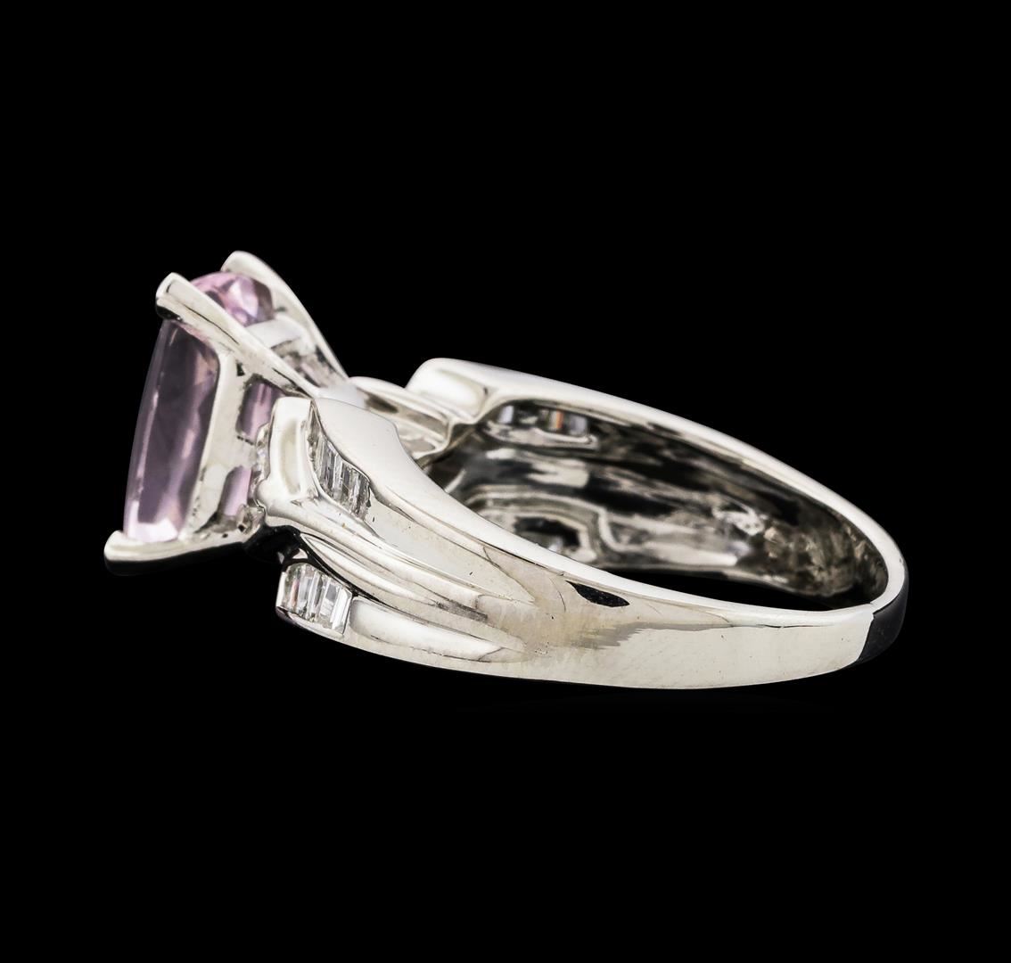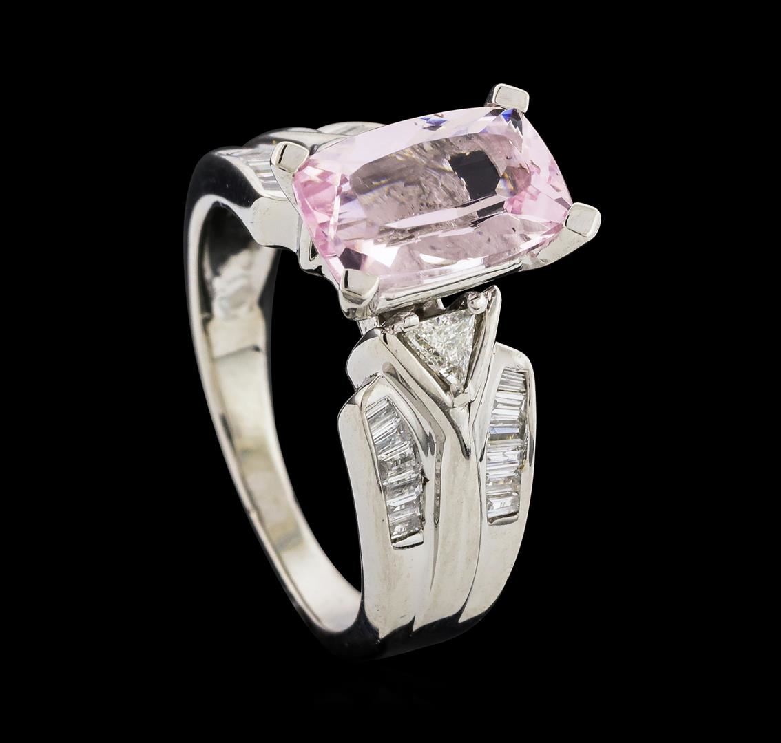 One Morganite and Diamond Ring featuring: 14KT White Gold with a total weight of 5.81 grams, Morganite with a total weight of 1.95ct, and side diamonds with a total weight of 0.50ctw.