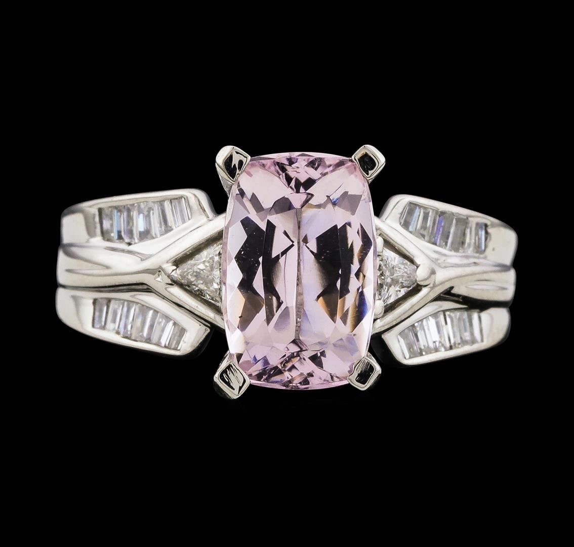 One Morganite and Diamond Ring featuring: 14KT White Gold with a total weight of 5.81 grams, Morganite with a total weight of 1.95ct, and side diamonds with a total weight of 0.50ctw.