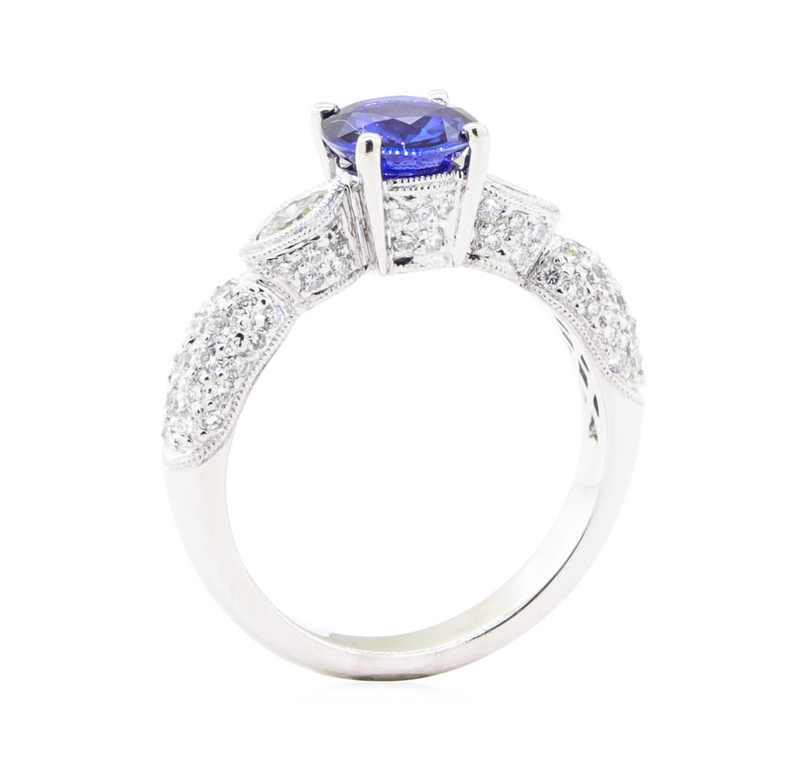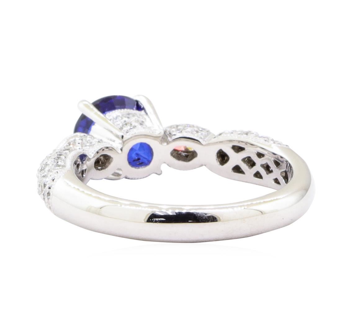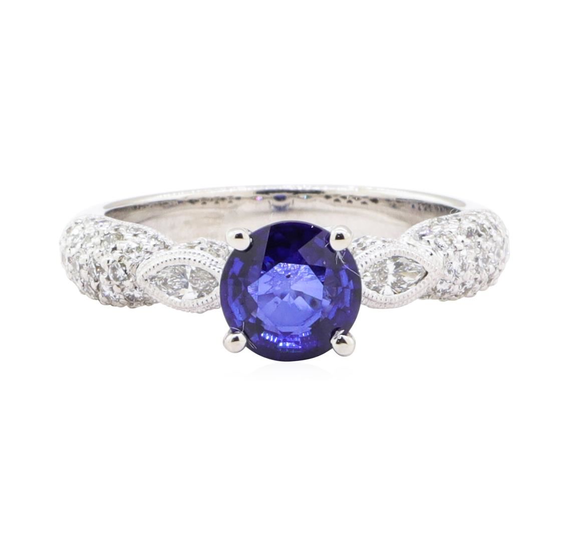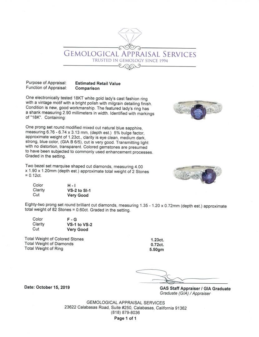One electronically tested 18KT white gold lady's cast fashion ring with a vintage motif with a bright polish with milgrain detailing finish. The featured lady's ring has a shank measuring 2.90 millimeters in width. Identified with markings of '18K'. Condition is new, good workmanship. Containing: One prong set round modified mixed cut natural blue sapphire, measuring 6.76 - 6.74 x 3.13 mm, (depth est.) 5%. bulge factor, approximate weight of 1.23ct., clarity is eye clean, medium dark, strong, blue color, (GIA B 6/5), cut is very good. Transmitting light with no distortion, transparent. Colored gemstones are presumed to have been subjected to commonly used enhancement processes. Graded in the setting. Two bezel set marquise shaped cut diamonds, measuring 4.00 x 1.90 x 1.20mm (depth est.) approximate total weight of 2 Stones = 0.12ct. Color H - I Clarity VS-2 to SI-1 Cut Very Good Eighty-Two prong set round brilliant cut diamonds, measuring 1.35 - 1.20 x 0.72mm (depth est.) approximate total weight of 82 Stones = 0.60ct. Graded in the setting. Color F - G Clarity VS-1 to VS-2 Cut Very Good. Total Weight of Colored Stones 1.23ct.. Total Weight of Diamonds 0.72ct.. Total Weight of Ring 5.50gm GAS Appraised at $4965.00. GAS Appraised.