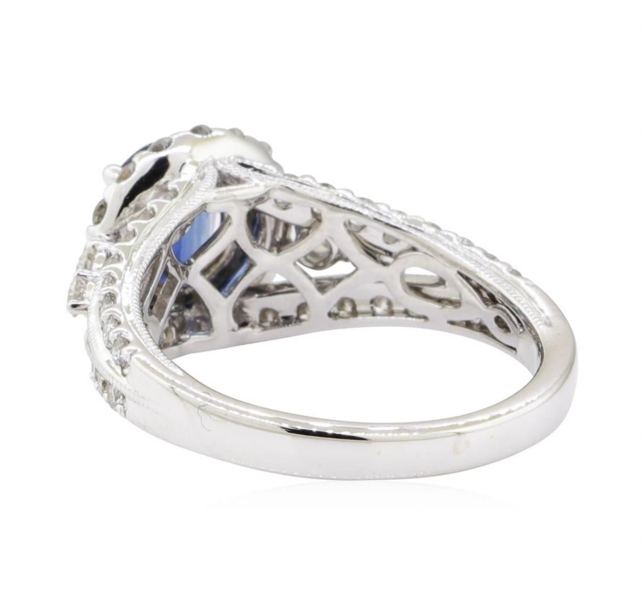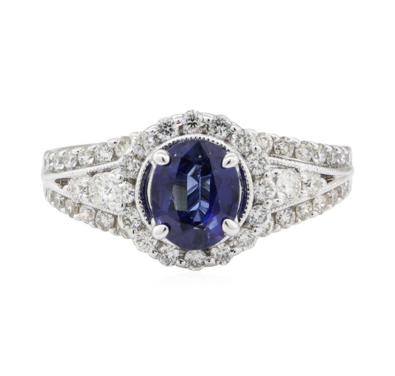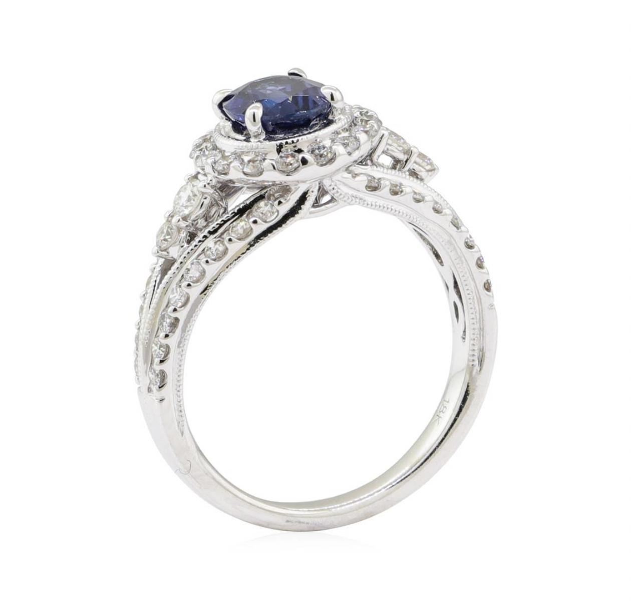 One electronically tested 18KT white gold lady's combination cast & assembled fashion ring with a tapered split shank halo with a bright polish with milgrain detailing finish. The featured lady's ring has a shank measuring 2.30 millimeters wide. Identified with markings of '18K'. Condition is new, good workmanship. Containing: One prong set oval modified mixed cut natural blue sapphire, measuring 7.12 x 5.70 x 3.12mm, (depth est.) approximate weight of 1.12ct., clarity is eye clean, medium dark, moderately strong, blue color, (GIA B 6/4), cut is good. Transmitting light with no distortion, transparent. Colored gemstones are presumed to have been subjected to commonly used enhancement processes. Graded in the setting. Two prong set round brilliant cut diamonds, measuring 2.26 - 2.25 x 1.40mm (depth est.) approximate total weight of 2 Stones = 0.09ct. Graded in the setting. Color H - I Clarity SI-1 to SI-2 Cut Very Good Fifty prong set round brilliant cut diamonds, measuring 1.70 - 1.40 x 0.96mm (depth est.) approximate total weight of 50 Stones = 0.74ct. Graded in the setting. Color H - I Clarity VS-2 to SI-1 Cut Very Good. Total Weight of Colored Stones 1.12ct.. Total Weight of Diamonds 0.83ct.. Total Weight of Ring 5.30gm GAS Appraised at $5205.00. GAS Appraised.