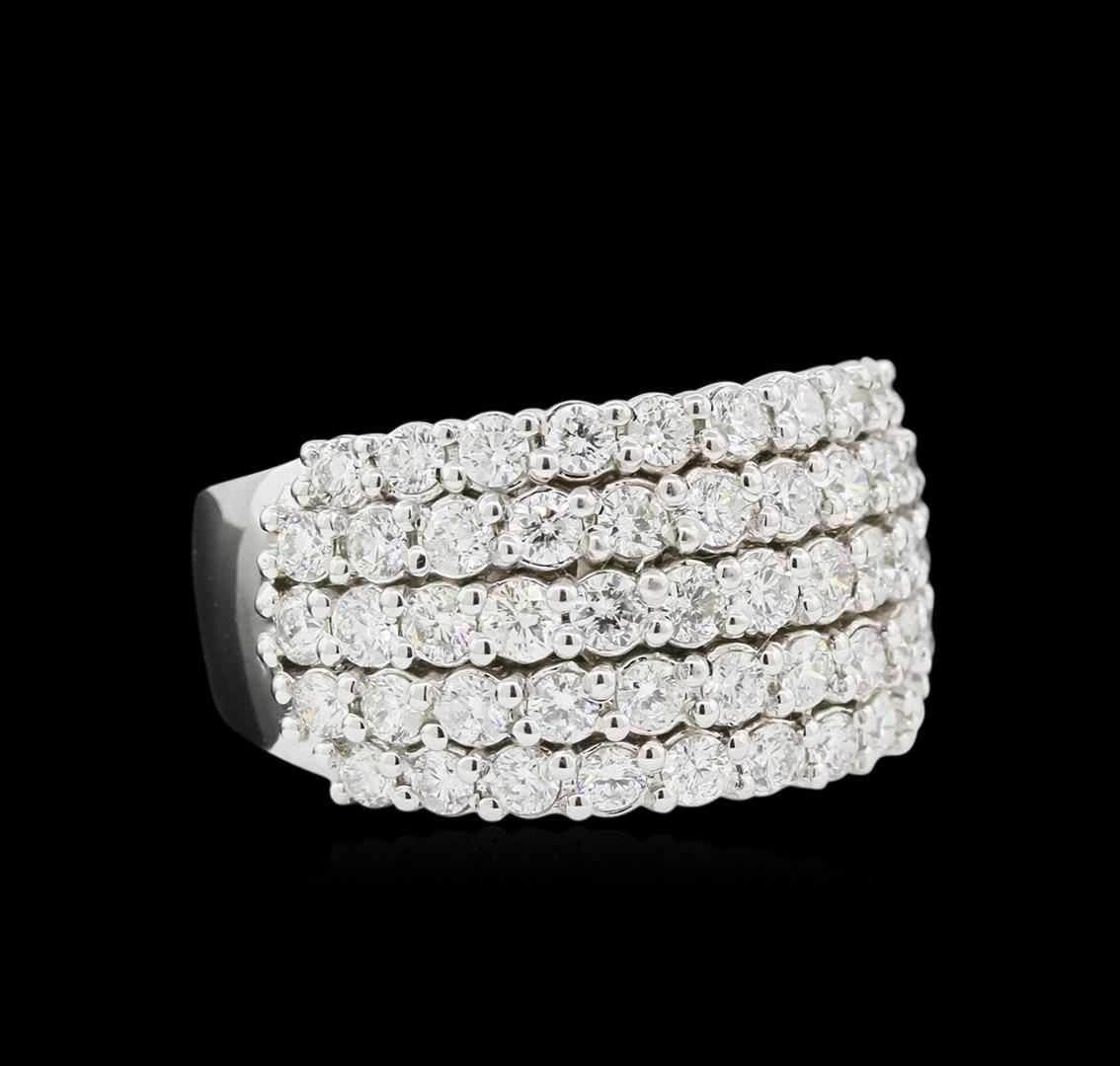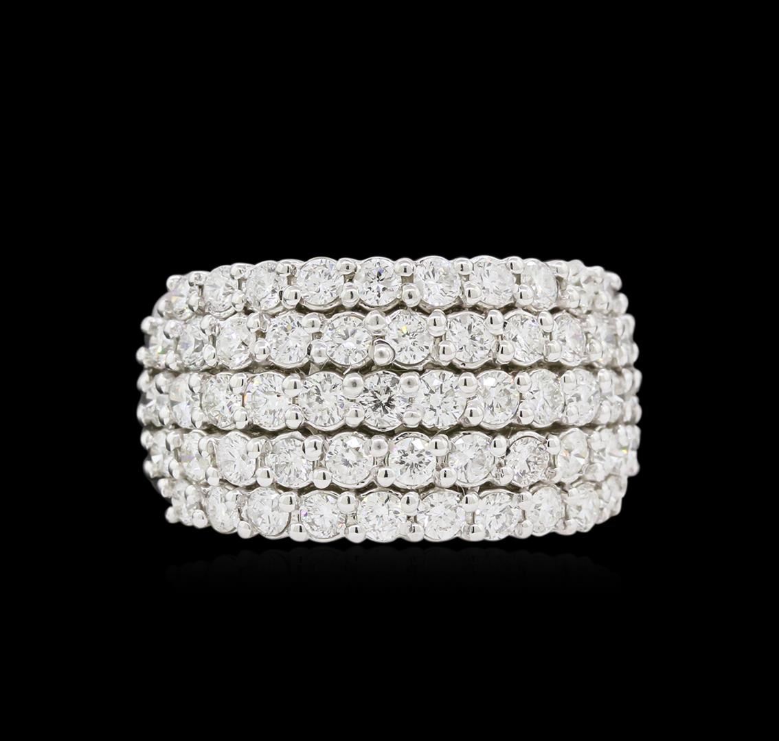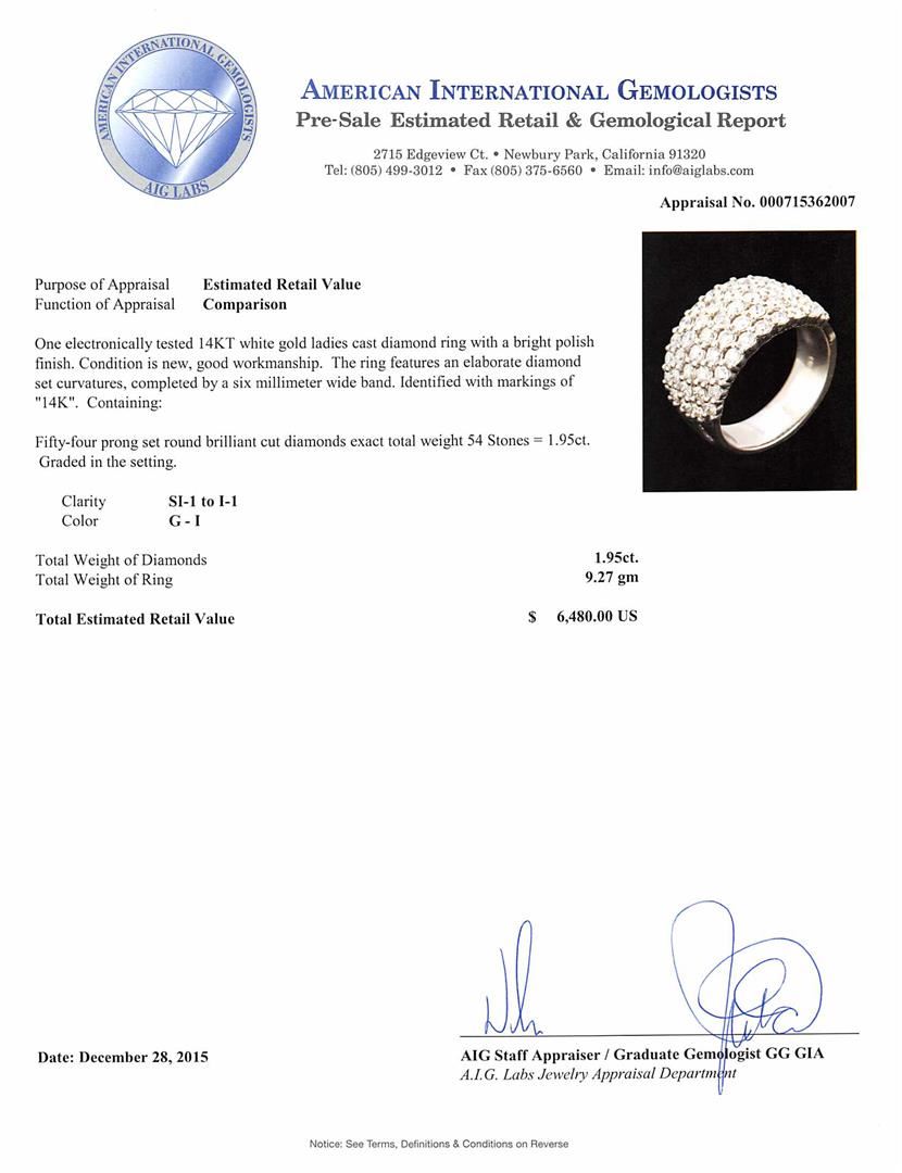 One electronically tested 14KT white gold ladies cast diamond ring with a bright polish finish. The ring features an elaborate diamond set curvatures, completed by a six millimeter wide band. Identified with markings of "14K". Condition is new, good workmanship. Containing: Fifty-Four prong set round brilliant cut diamonds exact total weight 54 Stones = 1.95ct. Graded in the setting. Clarity: SI-1 to I-1. Color: G - I. Total Weight of Diamonds 1.95ct. Total Weight of Ring 9.27gm. AIG Appraised at $6,480.00.