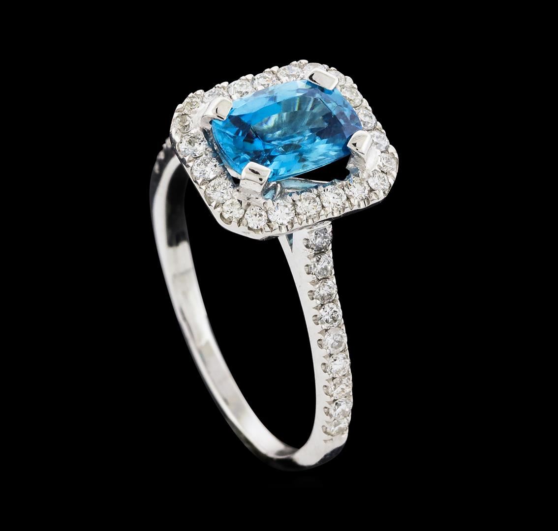 One electronically tested platinum lady's cast fashion ring with a cathedral shank with a basket halo with a bright polish finish. The featured lady's ring has a shank measuring 1.49 millimeters wide. Identified with markings of 'PLAT'. Condition is new, good workmanship. Containing: One prong set rectangular cushion modified mixed cut natural blue zircon, measuring 7.95 x 5.76 x 4.00mm, (depth est.) approximate weight of 1.96ct., clarity is eye clean, medium, moderately strong, green blue color, (GIA GB 5/4), cut is good. Transmitting light with no distortion, transparent. Colored gemstones are presumed to have been subjected to commonly used enhancement processes. Graded in the setting. Forty prong set round brilliant cut diamonds, measuring 1.70 - 1.60 x 0.99mm (depth est.) approximate total weight of 40 Stones = 0.66ct. Graded in the setting. Clarity SI-1 to SI-2. Color: G - H Cut Good. Total Weight of Colored Stones 1.96ct.. Total Weight of Diamonds 0.66ct.. Total Weight of Ring 5.40gm. GAS Appraised at $3,635.00.
