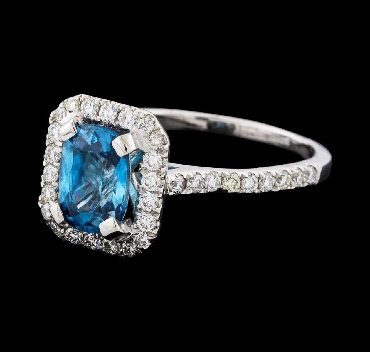 One electronically tested platinum lady's cast fashion ring with a cathedral shank with a basket halo with a bright polish finish. The featured lady's ring has a shank measuring 1.49 millimeters wide. Identified with markings of 'PLAT'. Condition is new, good workmanship. Containing: One prong set rectangular cushion modified mixed cut natural blue zircon, measuring 7.95 x 5.76 x 4.00mm, (depth est.) approximate weight of 1.96ct., clarity is eye clean, medium, moderately strong, green blue color, (GIA GB 5/4), cut is good. Transmitting light with no distortion, transparent. Colored gemstones are presumed to have been subjected to commonly used enhancement processes. Graded in the setting. Forty prong set round brilliant cut diamonds, measuring 1.70 - 1.60 x 0.99mm (depth est.) approximate total weight of 40 Stones = 0.66ct. Graded in the setting. Clarity SI-1 to SI-2. Color: G - H Cut Good. Total Weight of Colored Stones 1.96ct.. Total Weight of Diamonds 0.66ct.. Total Weight of Ring 5.40gm. GAS Appraised.