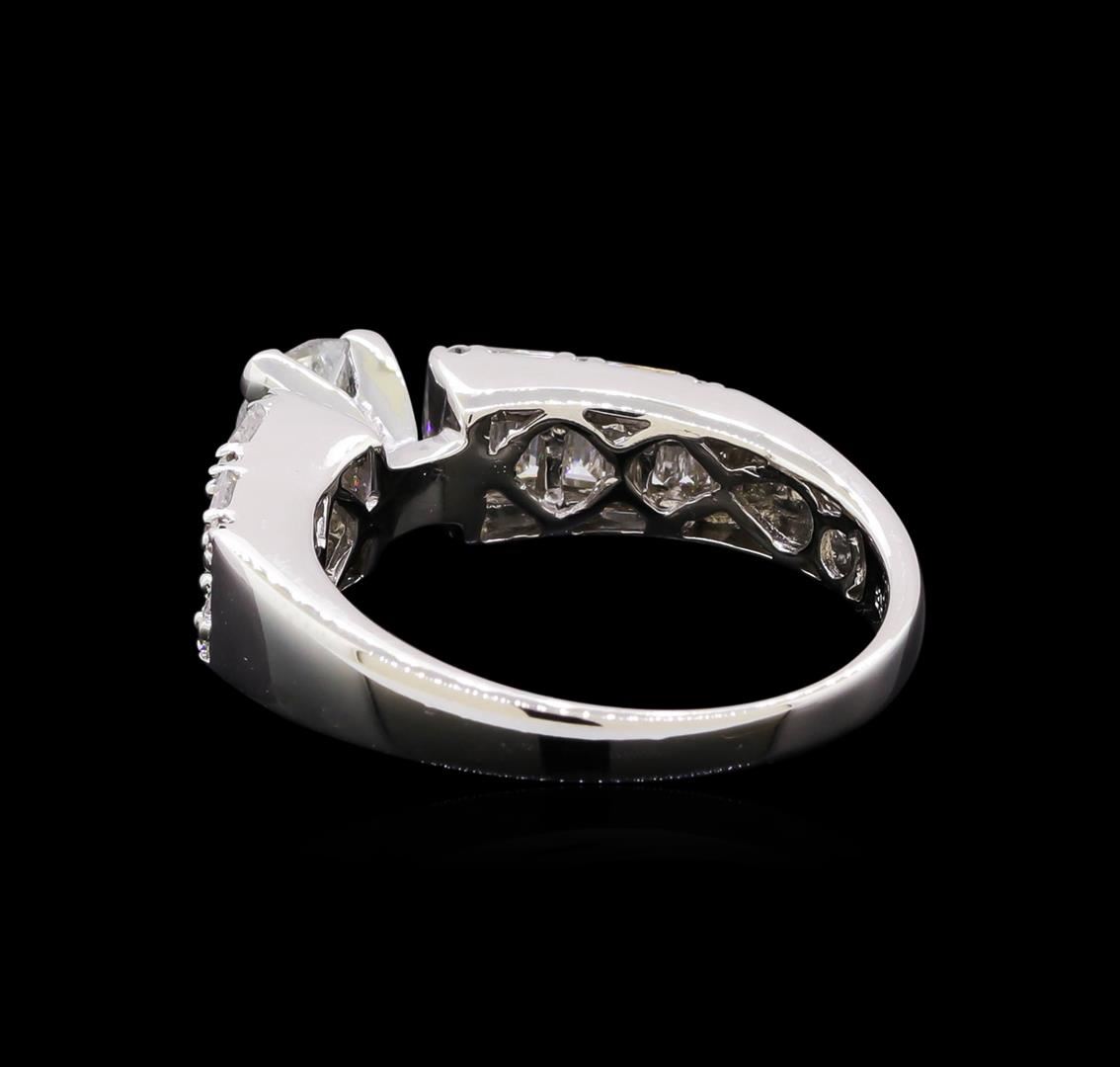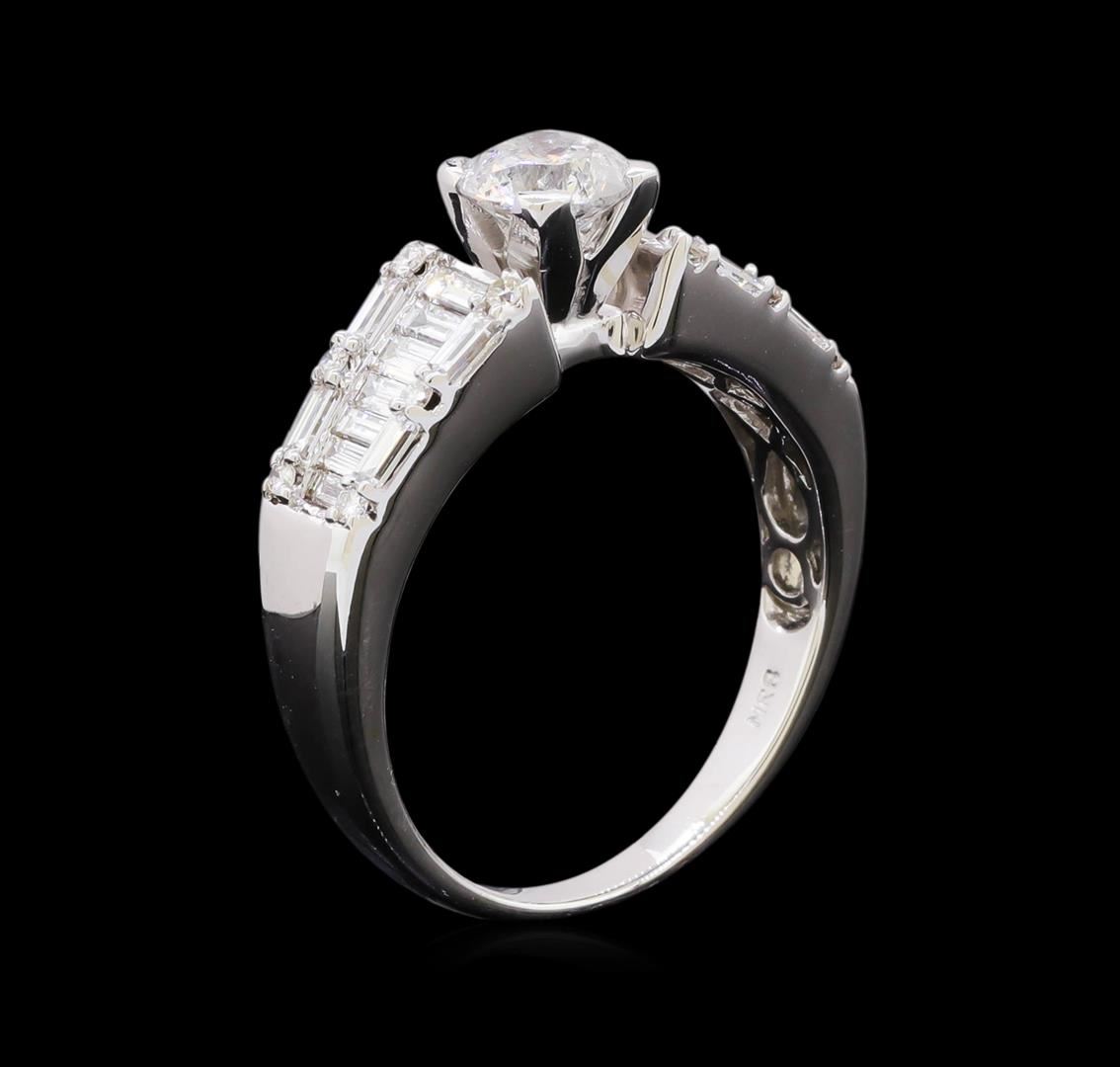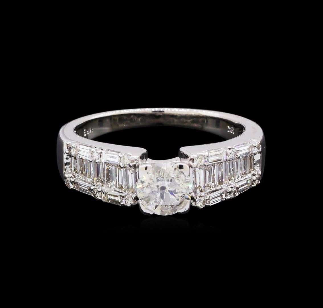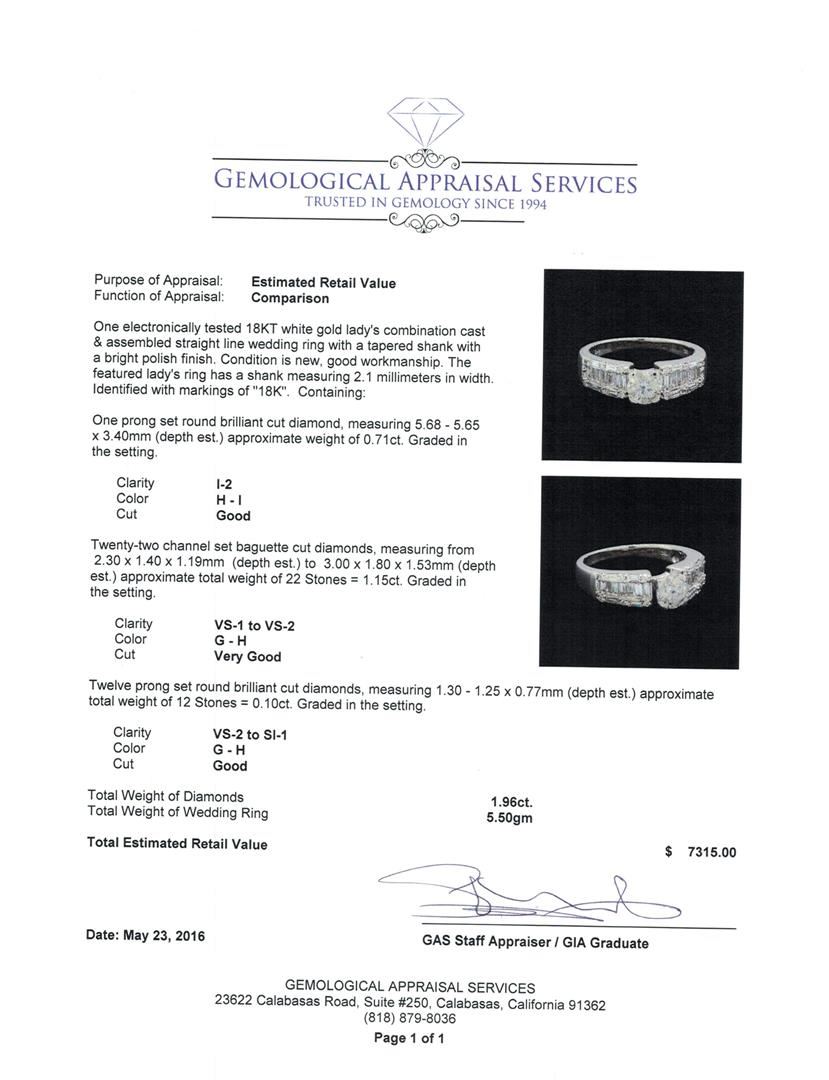 One electronically tested 18KT white gold lady's combination cast & assembled straight line wedding ring with a tapered shank with a bright polish finish. The featured lady's ring has a shank measuring 2.1 millimeters in width. Identified with markings of "18K". Condition is new, good workmanship. Containing: One prong set round brilliant cut diamond, measuring 5.68 - 5.65 x 3.40mm (depth est.) approximate weight of 0.71ct. Graded in the setting. Clarity: I-2. Color: H - I. Cut Good Twenty-Two channel set baguette cut diamonds, measuring from 2.30 x 1.40 x 1.19mm (depth est.) to 3.00 x 1.80 x 1.53mm (depth est.) approximate total weight of 22 Stones = 1.15ct. Graded in the setting. Clarity: VS-1 to VS-2. Color: G - Very Good Twelve prong set round brilliant cut diamonds, measuring 1.30 - 1.25 x 0.77mm (depth est.) approximate total weight of 12 Stones = 0.10ct. Graded in the setting. Clarity: VS-2 to SI-1. Color: G - Good. Total Weight of Diamonds 1.96ct. Total Weight of Wedding Ring 5.50gm. GAS Appraised at $7,315.00.