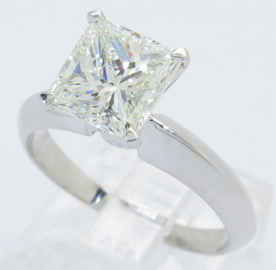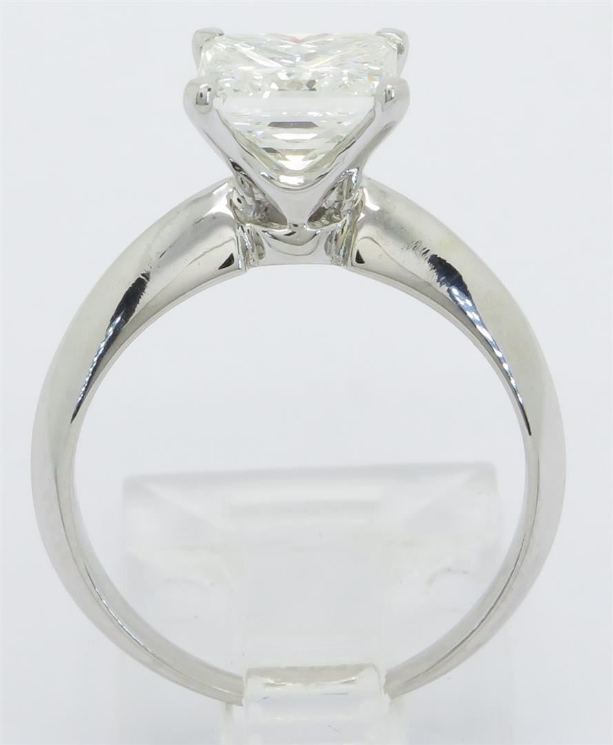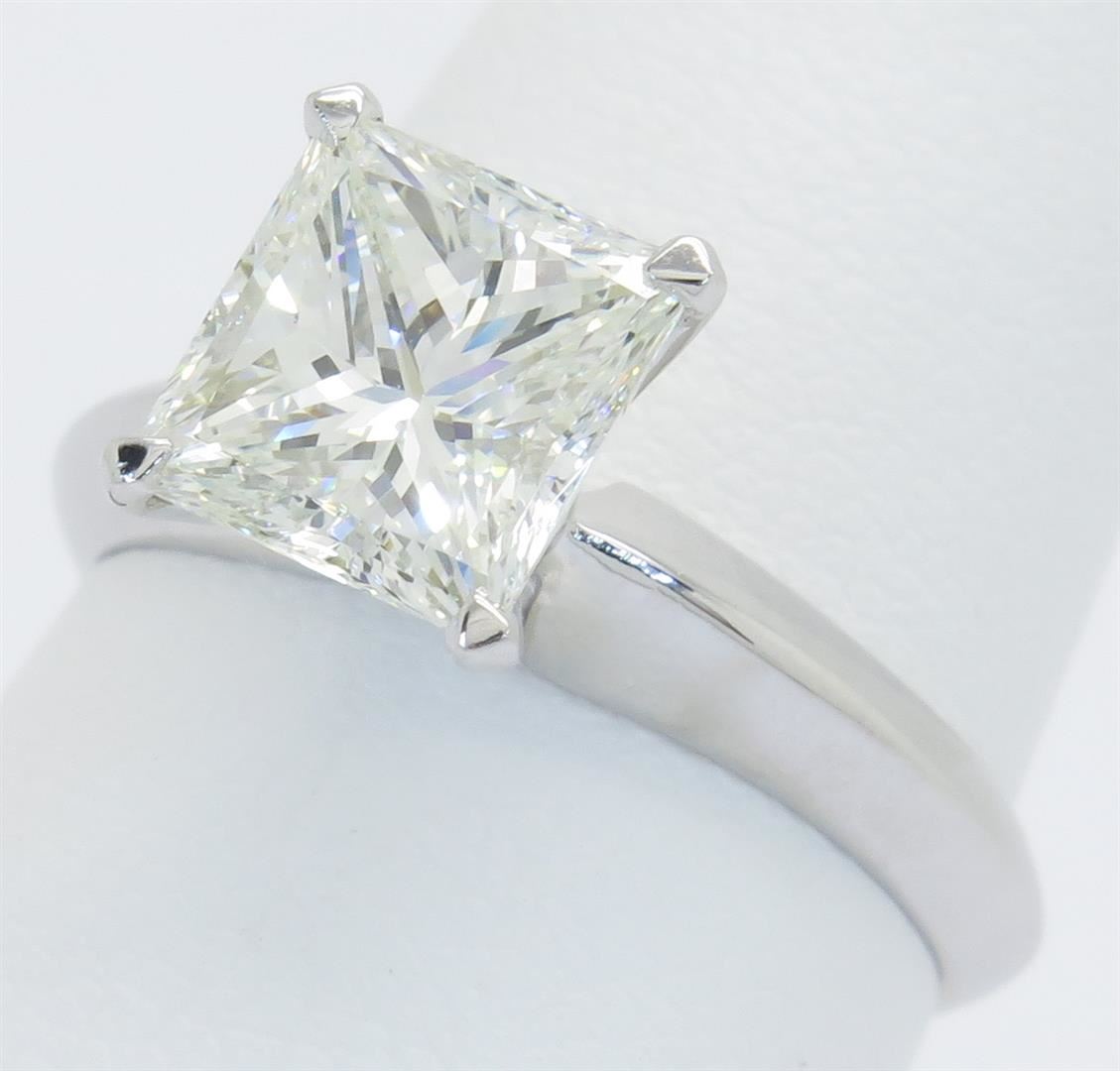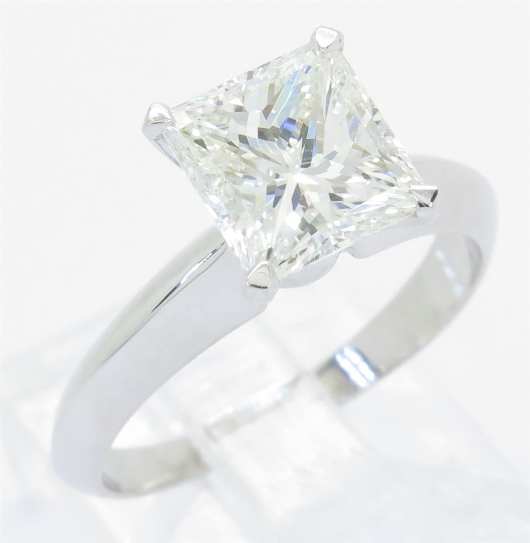 One tested 18K white Gold certified diamond ring. Containing: One IGI Certified Princess Cut Diamond. Size: 1.96CT, Clarity: VVS1, Color: H. Diamonds are graded in the mounting, unless otherwise stated. Weight of ring: 3.4 grams. Size: 5.5. IGI Appraised.