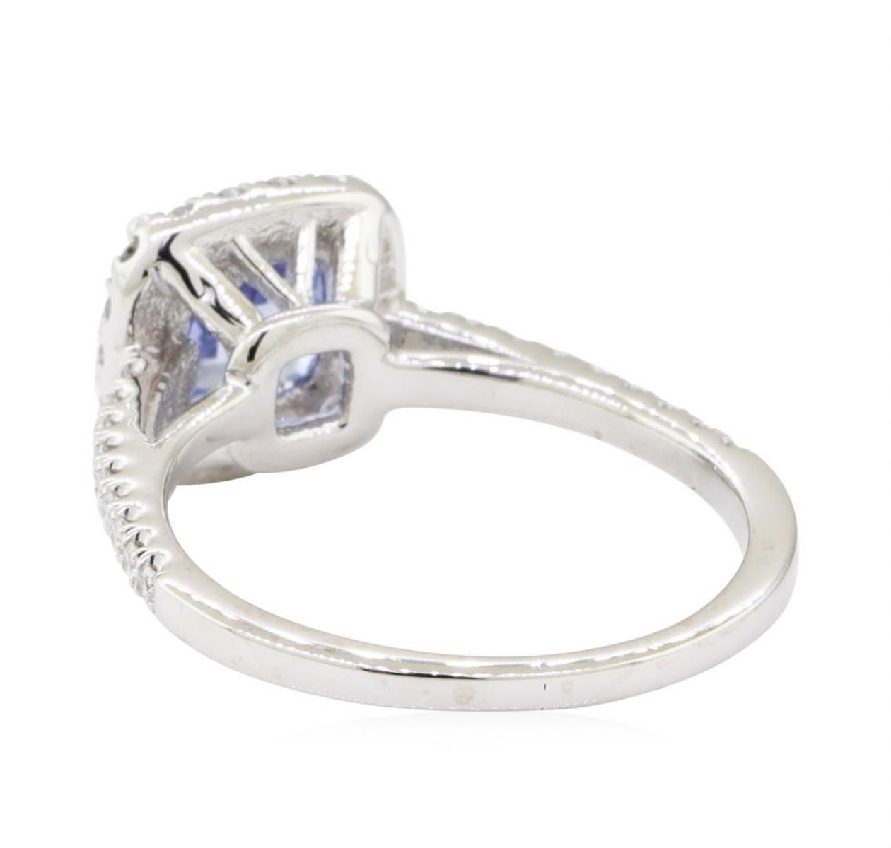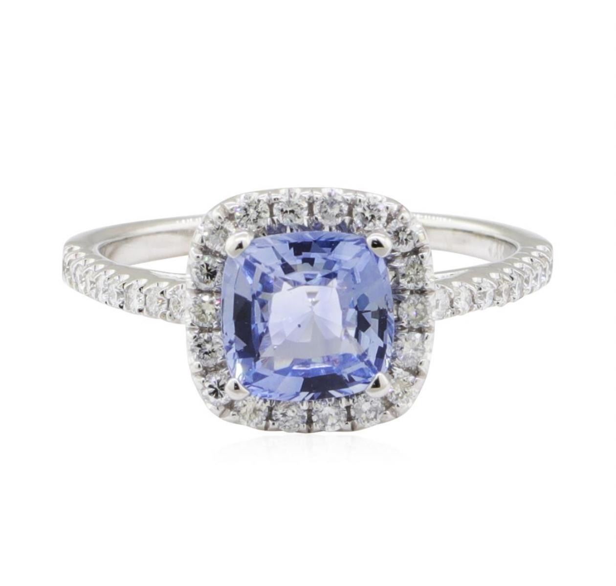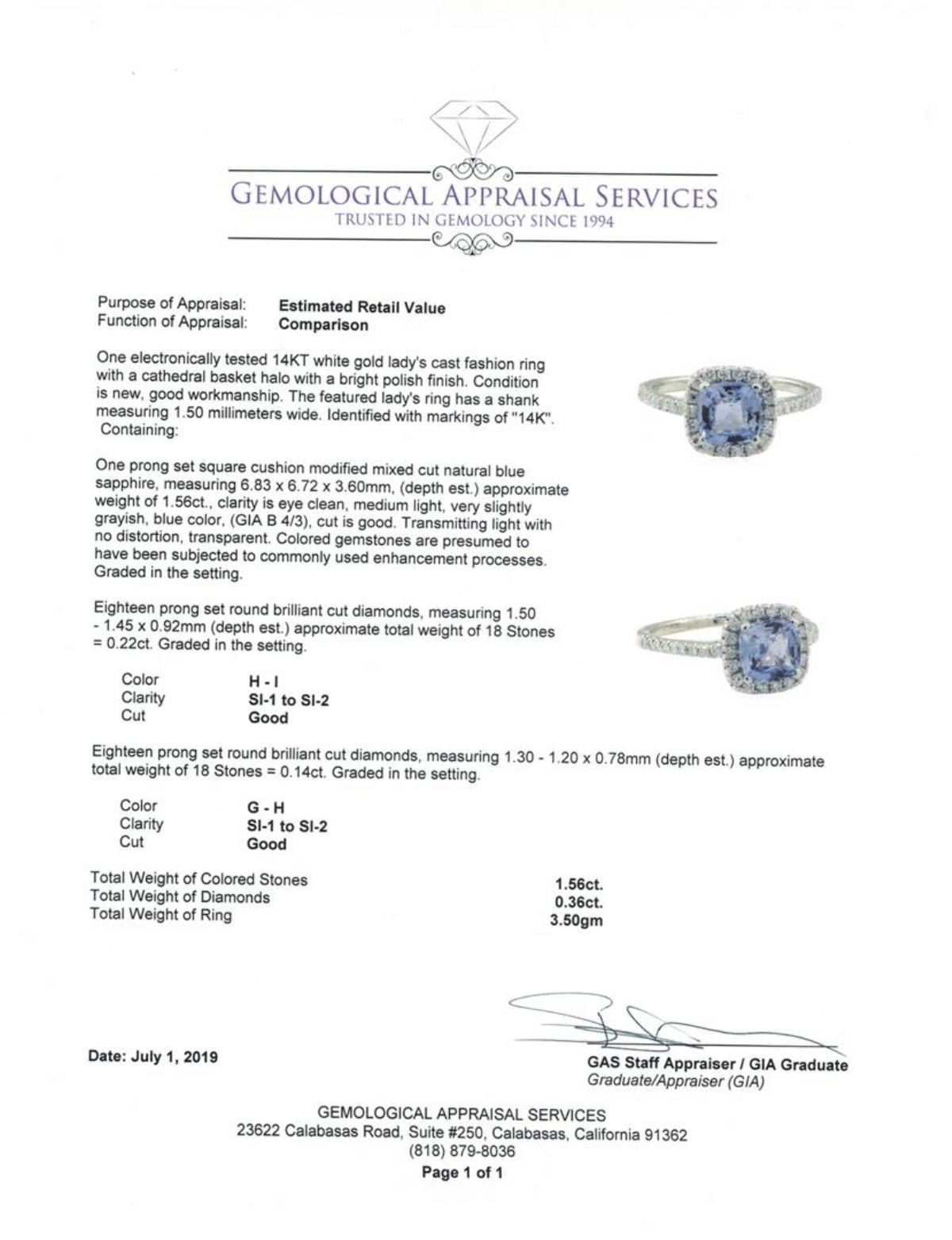 One electronically tested 14KT white gold lady's cast fashion ring with a cathedral basket halo with a bright polish finish. The featured lady's ring has a shank measuring 1.50 millimeters wide. Identified with markings of '14K'. Condition is new, good workmanship. Containing: One prong set square cushion modified mixed cut natural blue sapphire, measuring 6.83 x 6.72 x 3.60mm, (depth est.) approximate weight of 1.56ct., clarity is eye clean, medium light, very slightly grayish, blue color, (GIA B 4/3), cut is good. Transmitting light with no distortion, transparent. Colored gemstones are presumed to have been subjected to commonly used enhancement processes. Graded in the setting. Eighteen prong set round brilliant cut diamonds, measuring 1.50 - 1.45 x 0.92mm (depth est.) approximate total weight of 18 Stones = 0.22ct. Graded in the setting. Color H - I Clarity SI-1 to SI-2 Cut Good Eighteen prong set round brilliant cut diamonds, measuring 1.30 - 1.20 x 0.78mm (depth est.) approximate total weight of 18 Stones = 0.14ct. Graded in the setting. Color G - H Clarity SI-1 to SI-2 Cut Good. Total Weight of Colored Stones 1.56ct.. Total Weight of Diamonds 0.36ct.. Total Weight of Ring 3.50gm GAS Appraised at $3080.00. GAS Appraised.