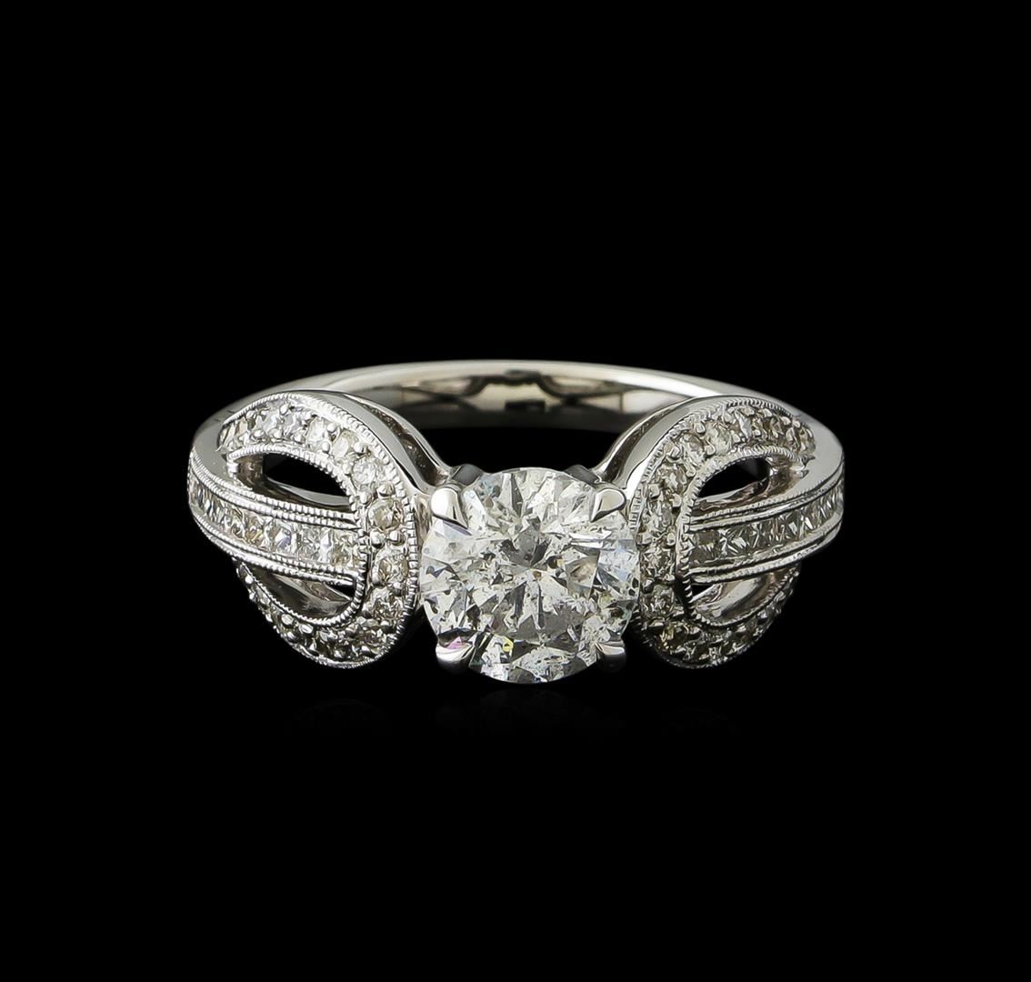 One electronically tested 14KT white gold ladies cast diamond unity ring. The featured diamond is supported by mirroring stylized diamond set shoulders, completed by a two millimeter wide band. Bright polish finish with milgrain detailing. Identified with markings of "14K 585". Condition is new, good workmanship. Containing: One prong set round brilliant cut diamond, measuring 7.23 - 7.14 x 4.60mm (depth est.) approximate weight of 1.50ct. Graded in the GSI Laboratory, Report # 11753800101. Clarity: I-2. Color: F. Depth 64.0%. Table 56.3%. Thirty-Eight prong set round brilliant cut diamonds, measuring 1.30 - 1.20 x 0.75mm (depth est.) approximate total weight of 38 Stones = 0.30ct. Graded in the setting. Clarity: SI-1 to I-1. Color: G - I Eighteen prong set princess cut diamonds, measuring 1.20 x 1.15 x 0.81mm (depth est.) approximate total weight of 18 Stones = 0.17ct. Graded in the setting. Clarity: VS-1 to SI-1. Color: F - H. Total Weight of Diamonds 1.97ct. Total Weight of Ring 6.01gm. AIG Appraised at $11,650.00.