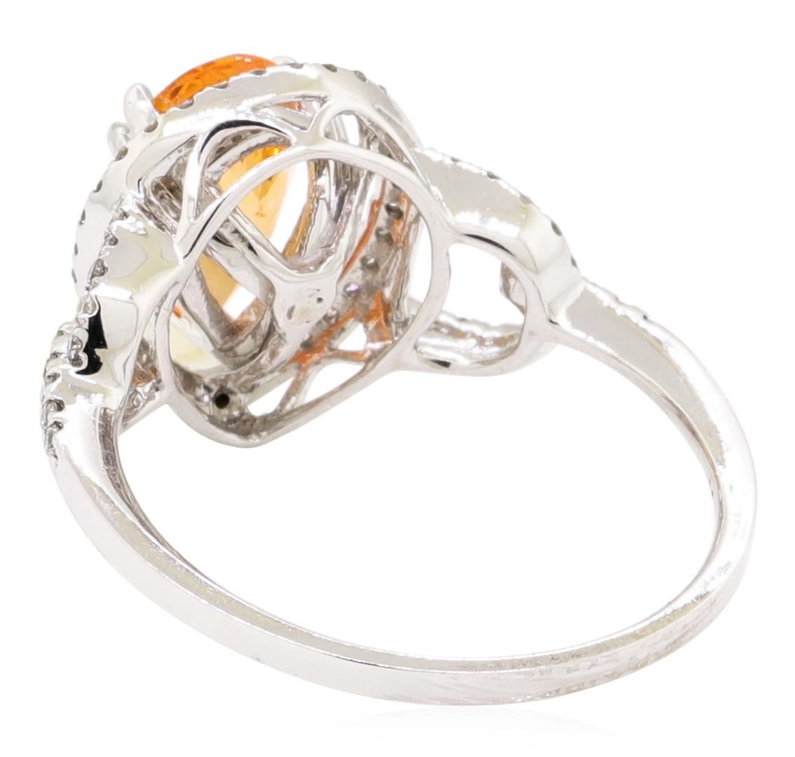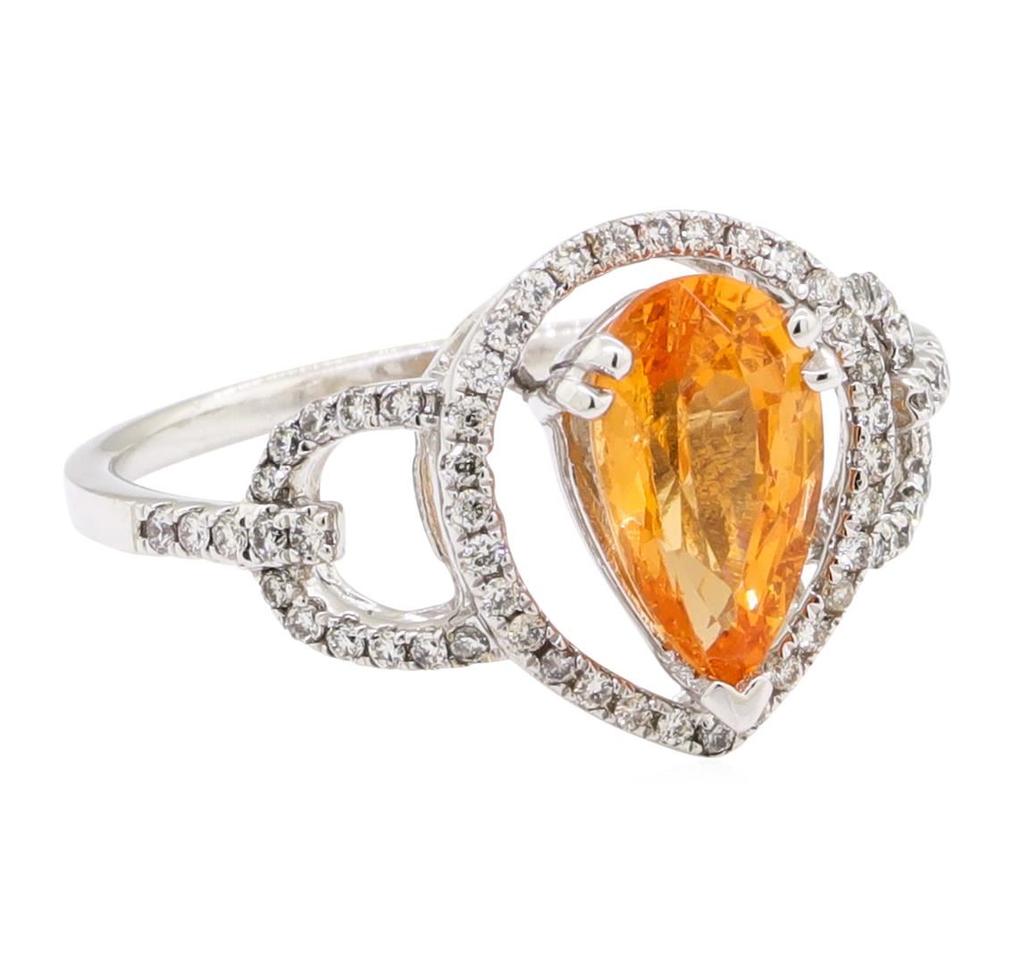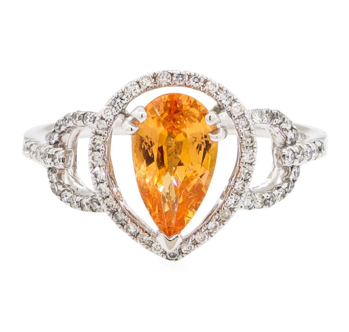 One electronically tested 14KT white gold lady's cast fashion ring with a split shank halo with a bright polish finish. The featured lady's ring has a shank measuring 1.35 millimeters wide. Identified with markings of '14K'. Condition is new, good workmanship. Containing: One prong set pear modified mixed cut natural spessartite garnet, measuring 9.85 x 5.70 x 3.90mm, (depth est.) approximate weight of 1.71ct., clarity is eye clean, medium, moderately strong, reddish orange color, (GIA rO 5/4), cut is very good. Transmitting light with no distortion, transparent. Colored gemstones are presumed to have been subjected to commonly used enhancement processes. Graded in the setting. Sixty-Five prong set round brilliant cut diamonds, measuring 1.00 - 0.95 x 0.61mm (depth est.) approximate total weight of 65 Stones = 0.26ct. Graded in the setting. Color H - I Clarity SI-1 to SI-2 Cut Good. Total Weight of Colored Stones 1.71ct.. Total Weight of Diamonds 0.26ct.. Total Weight of Ring 2.80gm GAS Appraised at $2060.00. GAS Appraised.