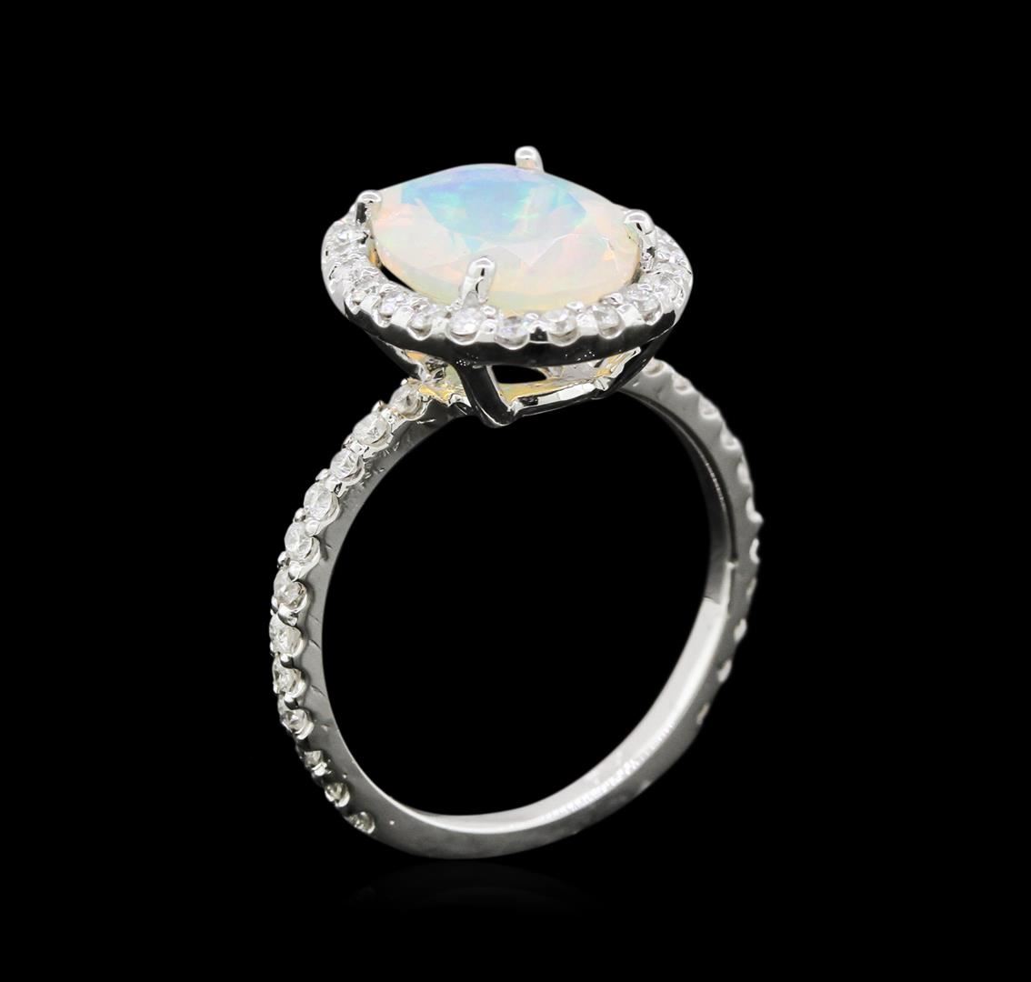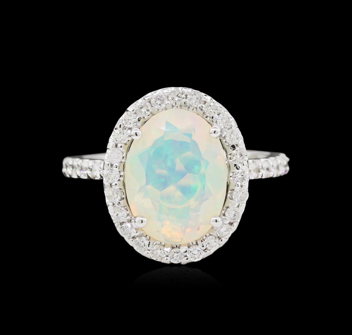 One 14K White Gold Lady's Ring. 3.56 GR. Containing: Main Gemstones: Identity: Opal. Carat Weight 1.97 CTS TW. Shape & Measurement: Oval Faceted. Quality: Fine Color. Adjacent Gemstones: Identity: Natural Diamond. Shape: Round Cut. Carat Weight: 0.58 CTS TW. Quality: SI Clarity, G-H Color. All Fine Cutting And Proportions. Total Gemstones Weight: 2.55 CTW TW. RBGS Appraised.