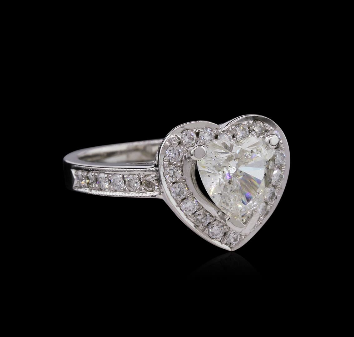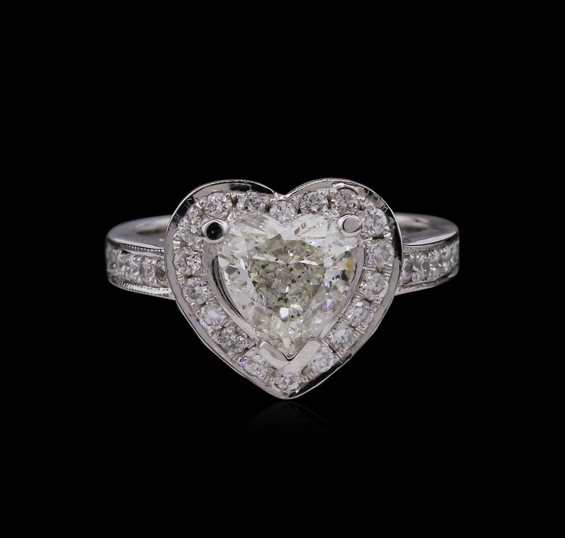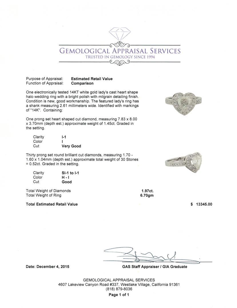 One electronically tested 14KT white gold lady's cast heart shape halo wedding ring with a bright polish with milgrain detailing finish. The featured lady's ring has a shank measuring 2.61 millimeters wide. Identified with markings of "14K". Condition is new, good workmanship. Containing: One prong set heart shaped cut diamond, measuring 7.83 x 8.00 x 3.70mm (depth est.) approximate weight of 1.45ct. Graded in the setting. Clarity: I-1. Color: I. Cut Very Good Thirty prong set round brilliant cut diamonds, measuring 1.70 - 1.60 x 1.04mm (depth est.) approximate total weight of 30 Stones = 0.52ct. Graded in the setting. Clarity: SI-1 to I-1. Color: H - I. Cut Good. Total Weight of Diamonds 1.97ct. Total Weight of Ring 6.70gm. GAS Appraised.
