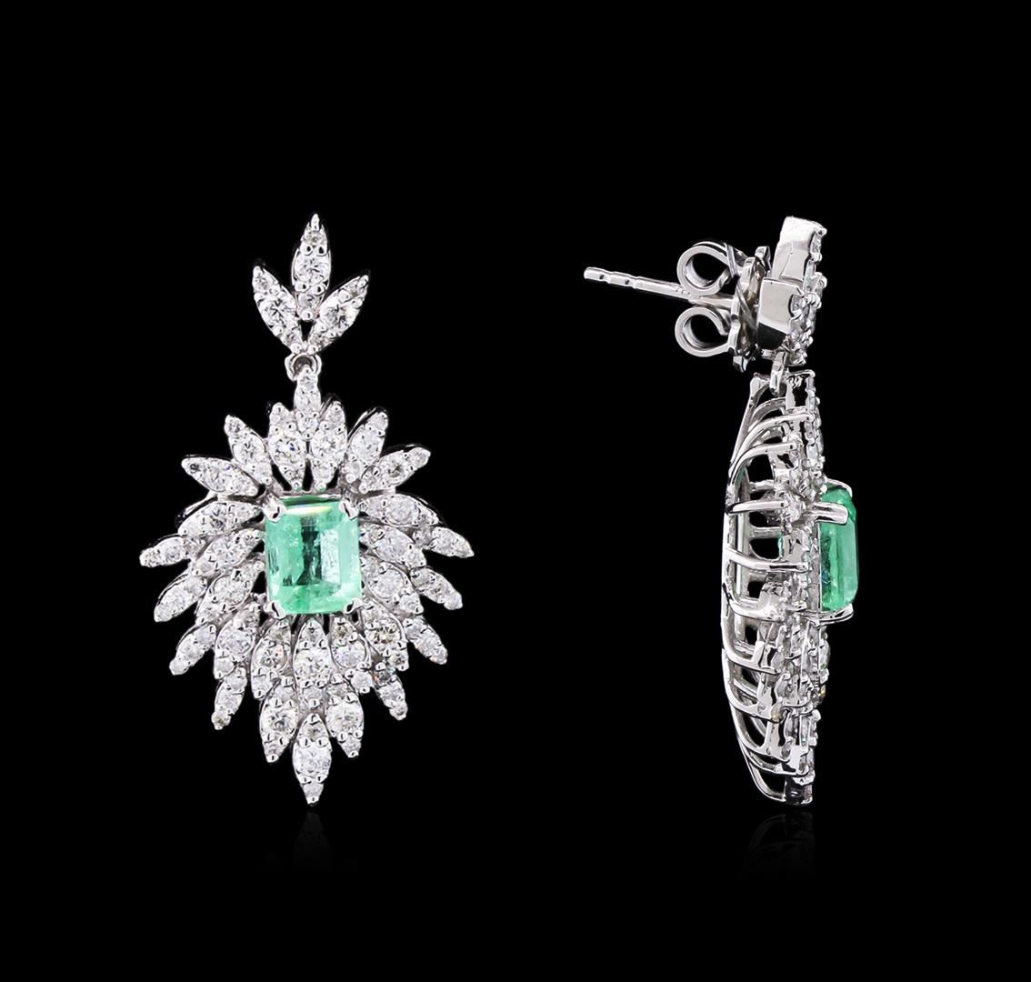 One pair electronically tested 14KT white gold lady's combination cast & assembled fashion earring with friction posts with a bright polish finish. Identified with markings of "585". Condition is new, good workmanship. Containing: Two prong set emerald step cut natural emeralds, measuring 6.15 x 5.03 x 4.04mm, 7% bulge factor, approximate total weight of 1.97ct., clarity is slightly included, type III, medium light, moderately strong, green color, (GIA G 4/4), cut is good. Transmitting light with a minimum of distortion, transparent. Naturally occurring internal & external characteristics are present. Indications of oil residue. Graded in the setting. Sixty-Four prong set round brilliant cut diamonds, measuring 2.10 - 1.70 x 1.14mm (depth est.) approximate total weight of 64 Stones = 1.57ct. Graded in the setting. Clarity: SI-2 to I-1. Color: H - I. Cut Very Good One Hundred Twenty-Eight prong set round brilliant cut diamonds, measuring 1.10 - 1.00 x 0.63mm (depth est.) approximate total weight of 128 Stones = 0.54ct. Graded in the setting. Clarity: SI-2 to I-1. Color: H - I. Cut Very Good. Total Weight of Colored Stones 1.97ct. Total Weight of Diamonds 2.11ct. Total Weight of Earring 9.50gm. GAS Appraised at $8,565.00.