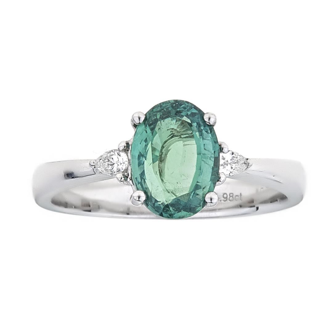 One Lady's Alexandrite and Diamond Ring. Setting: 18 Kt. White Gold Mounting. Additional: 2 Pear Cut Diamonds = 0.15 Cts. TWT (G-H/VS-SI). Center Gem Stone Information: Species: Natural Chrysoberyl, Variety: Alexandrite. Phenomenon: Color Change. Shape and Cut: Oval Mixed Cut. Measurements: 8.70 x 6.42 x 3.97 mm. Weight: 1.98 Carats. Transparency: Transparent. Color Hue: Green to Greyish Red. Saturation: Moderate. Total Weight: 2.36 grams.