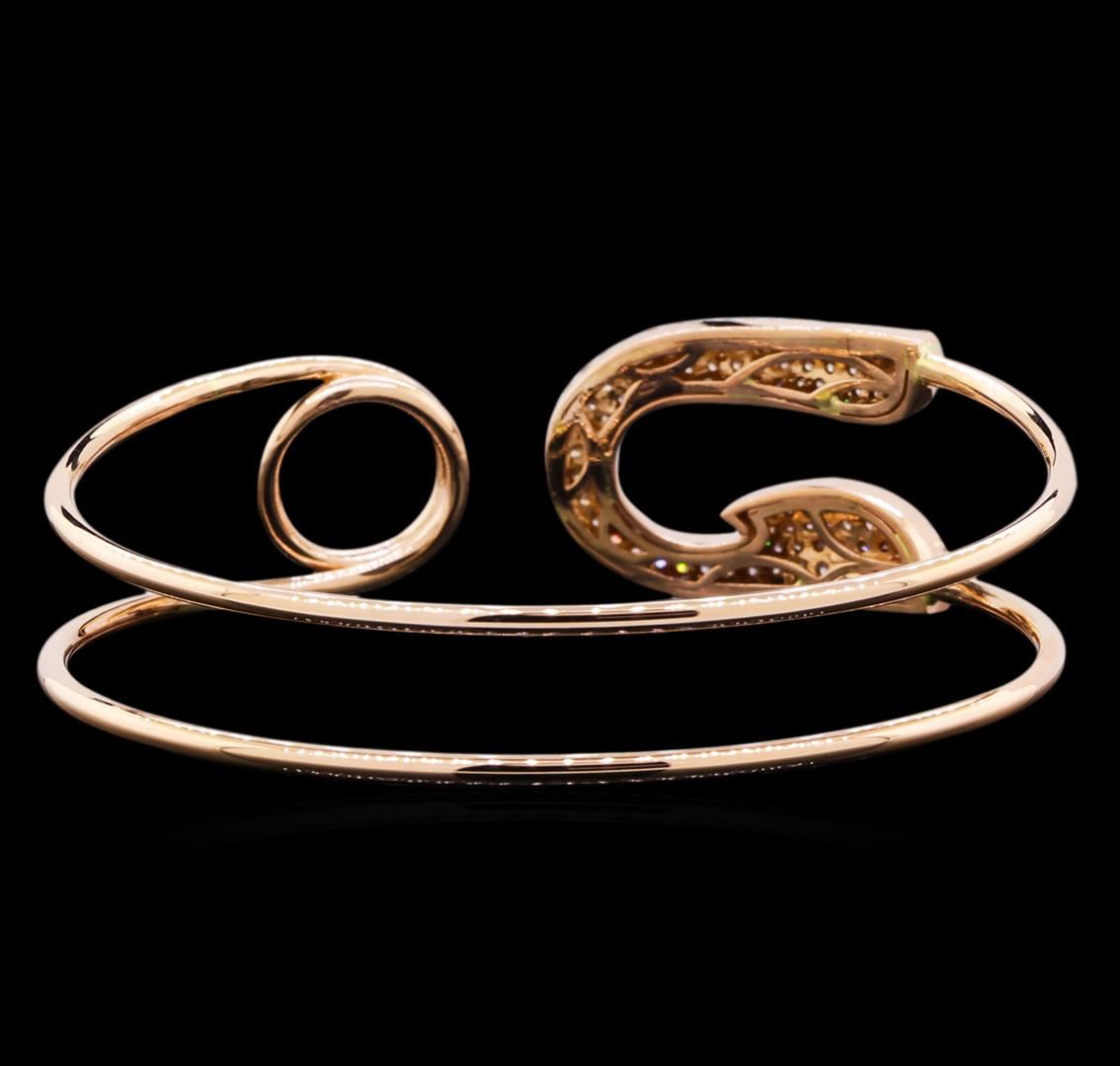 One electronically tested 14KT rose gold lady's combination cast & assembled fashion cuff bracelet with a bright polish finish. The featured lady's bracelet has a safety pin motif and measures 7 inches in length. Identified with markings of "K14". Condition is new, good workmanship. Containing: Forty prong set round brilliant cut diamonds, measuring 1.40 - 1.30 x 0.84mm (depth est.) approximate total weight of 40 Stones = 0.38ct. Graded in the setting. Clarity: SI-1 to SI-2. Color: H - I. Cut Good One Hundred Ten prong set round brilliant cut diamonds, measuring 1.60 - 1.55 x 0.96mm (depth est.) approximate total weight of 110 Stones = 1.60ct. Graded in the setting. Clarity: SI-1 to SI-2. Color: H - I. Cut Good. Total Weight of Diamonds 1.98ct. Total Weight of Cuff Bracelet 15.20gm. GAS Appraised at $7,950.00.