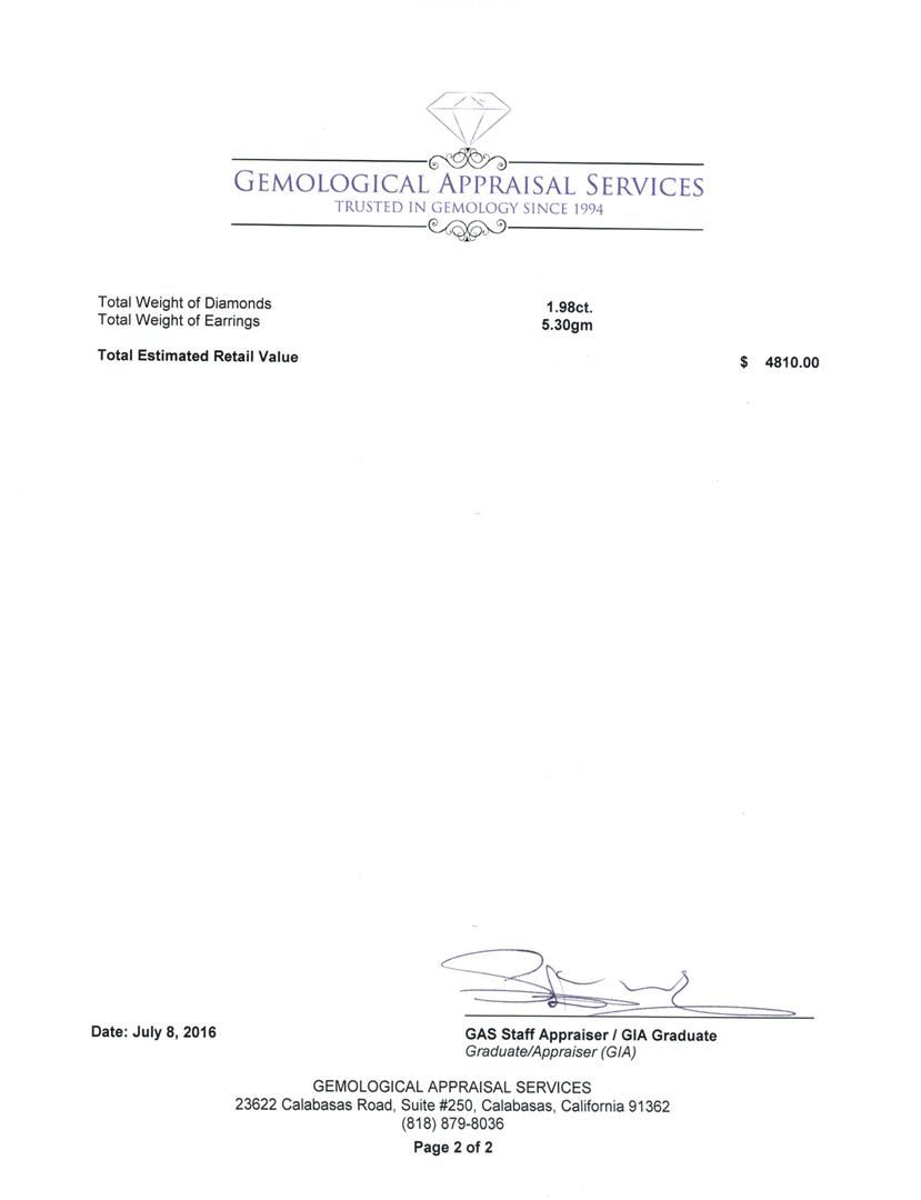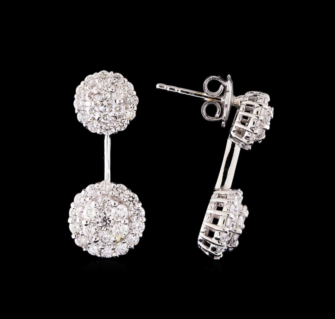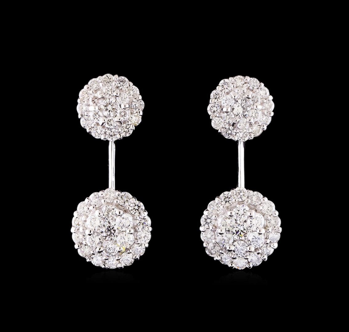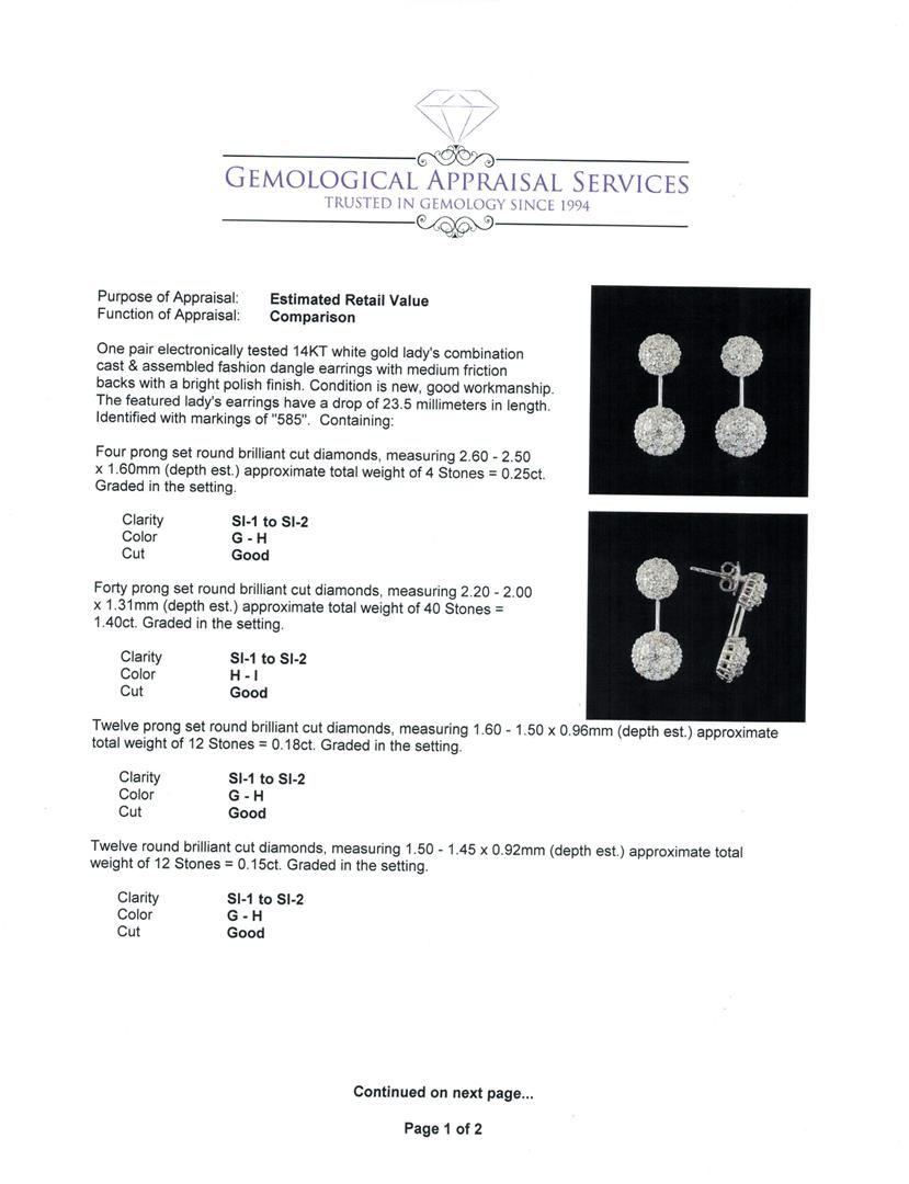 One pair electronically tested 14KT white gold lady's combination cast & assembled fashion dangle earrings with medium friction backs with a bright polish finish. The featured lady's earrings have a drop of 23.5 millimeters in length. Identified with markings of "585". Condition is new, good workmanship. Containing: Four prong set round brilliant cut diamonds, measuring 2.60 - 2.50 x 1.60mm (depth est.) approximate total weight of 4 Stones = 0.25ct. Graded in the setting. Clarity: SI-1 to SI-2. Color: G - Good Forty prong set round brilliant cut diamonds, measuring 2.20 - 2.00 x 1.31mm (depth est.) approximate total weight of 40 Stones = 1.40ct. Graded in the setting. Clarity: SI-1 to SI-2. Color: H - I. Cut Good Twelve prong set round brilliant cut diamonds, measuring 1.60 - 1.50 x 0.96mm (depth est.) approximate total weight of 12 Stones = 0.18ct. Graded in the setting. Clarity: SI-1 to SI-2. Color: G - Good Twelve round brilliant cut diamonds, measuring 1.50 - 1.45 x 0.92mm (depth est.) approximate total weight of 12 Stones = 0.15ct. Graded in the setting. Clarity: SI-1 to SI-2. Color: G - Good. Total Weight of Diamonds 1.98ct. Total Weight of Earrings 5.30gm. GAS Appraised at $4,810.00.