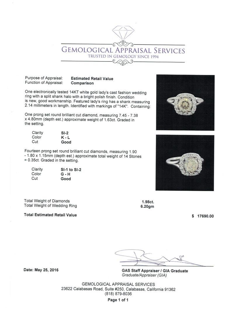 One electronically tested 14KT white gold lady's cast fashion wedding ring with a split shank halo with a bright polish finish. Featured lady's ring has a shank measuring 2.14 millimeters in width. Identified with markings of "14K". Condition is new, good workmanship. Containing: One prong set round brilliant cut diamond, measuring 7.45 - 7.38 x 4.80mm (depth est.) approximate weight of 1.63ct. Graded in the setting. Clarity: SI-2. Color: K - L. Cut Good Fourteen prong set round brilliant cut diamonds, measuring 1.90 - 1.80 x 1.15mm (depth est.) approximate total weight of 14 Stones = 0.35ct. Graded in the setting. Clarity: SI-1 to SI-2. Color: G - Good. Total Weight of Diamonds 1.98ct. Total Weight of Wedding Ring 6.20gm. GAS Appraised at $17,690.00.