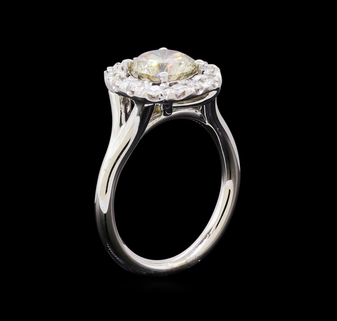One electronically tested 14KT white gold lady's cast fashion wedding ring with a split shank halo with a bright polish finish. Featured lady's ring has a shank measuring 2.14 millimeters in width. Identified with markings of "14K". Condition is new, good workmanship. Containing: One prong set round brilliant cut diamond, measuring 7.45 - 7.38 x 4.80mm (depth est.) approximate weight of 1.63ct. Graded in the setting. Clarity: SI-2. Color: K - L. Cut Good Fourteen prong set round brilliant cut diamonds, measuring 1.90 - 1.80 x 1.15mm (depth est.) approximate total weight of 14 Stones = 0.35ct. Graded in the setting. Clarity: SI-1 to SI-2. Color: G - Good. Total Weight of Diamonds 1.98ct. Total Weight of Wedding Ring 6.20gm. GAS Appraised at $17,690.00.