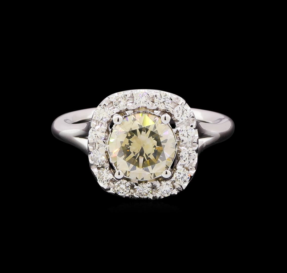 One electronically tested 14KT white gold lady's cast fashion wedding ring with a split shank halo with a bright polish finish. Featured lady's ring has a shank measuring 2.14 millimeters in width. Identified with markings of "14K". Condition is new, good workmanship. Containing: One prong set round brilliant cut diamond, measuring 7.45 - 7.38 x 4.80mm (depth est.) approximate weight of 1.63ct. Graded in the setting. Clarity: SI-2. Color: K - L. Cut Good Fourteen prong set round brilliant cut diamonds, measuring 1.90 - 1.80 x 1.15mm (depth est.) approximate total weight of 14 Stones = 0.35ct. Graded in the setting. Clarity: SI-1 to SI-2. Color: G - Good. Total Weight of Diamonds 1.98ct. Total Weight of Wedding Ring 6.20gm. GAS Appraised at $17,690.00.
