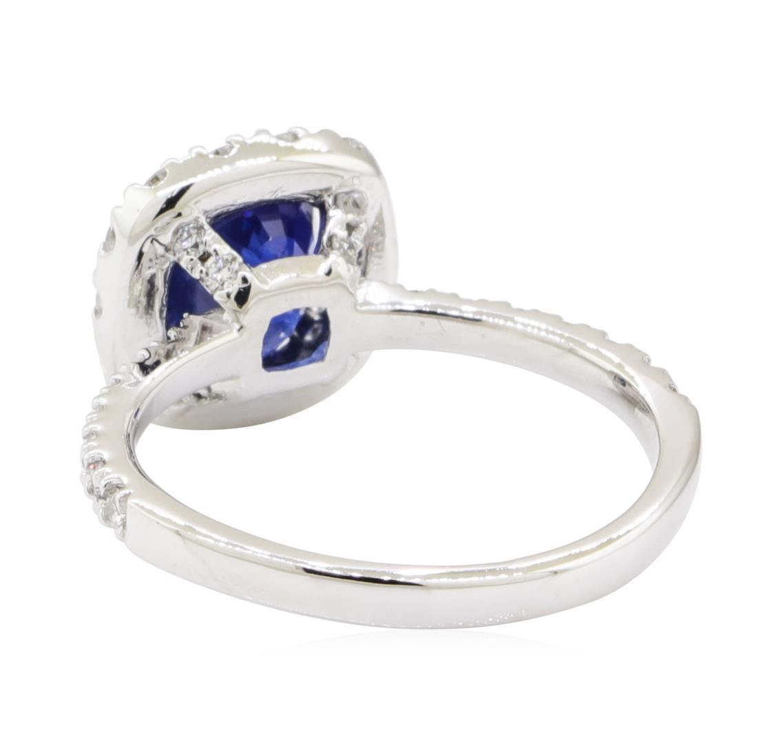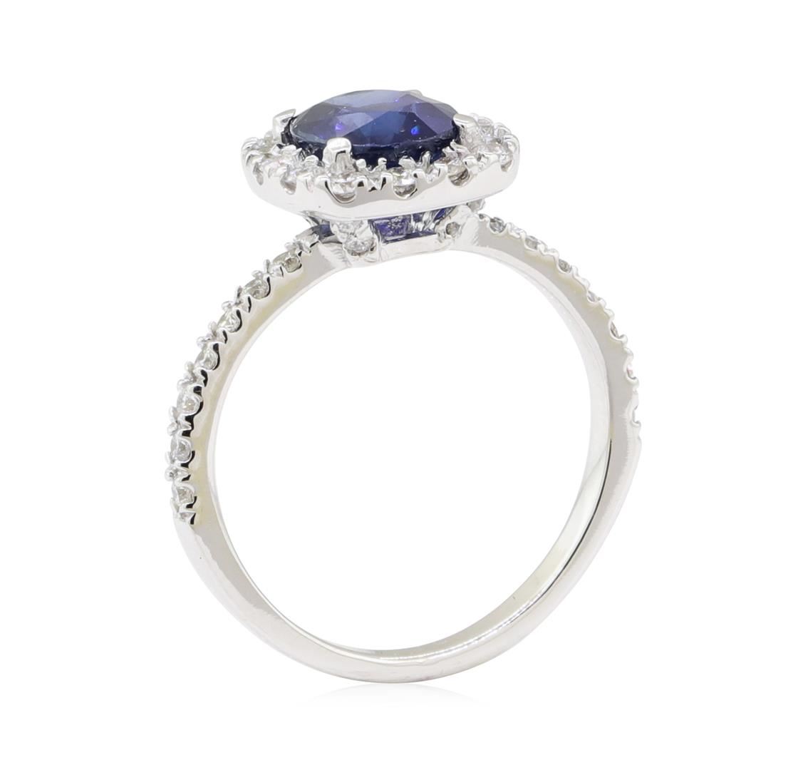 One electronically tested 14KT white gold lady's cast fashion ring with a basket halo with a bright polish finish. The featured lady's ring has a shank measuring 1.90 millimeters wide. Condition is new, good workmanship. Containing: One prong set oval mod
