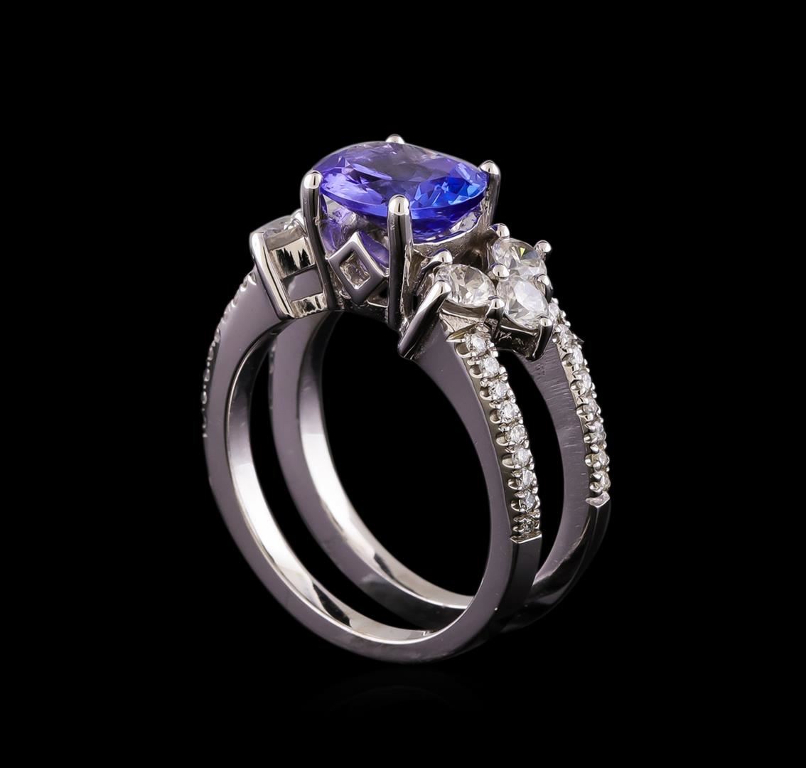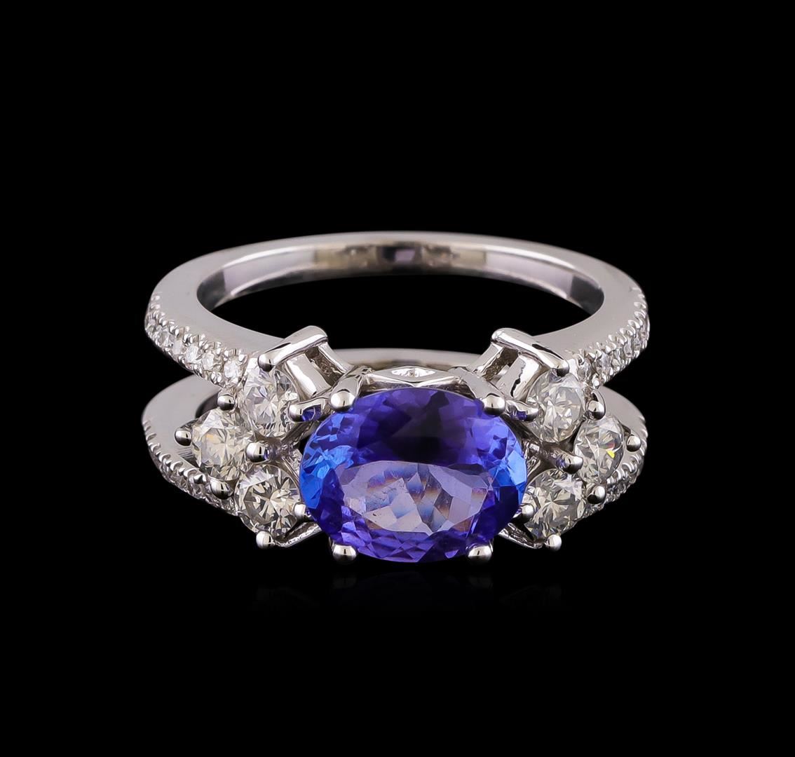 One electronically tested 14KT white gold lady's cast fashion ring with a double shank with a bright polish finish. The featured lady's ring has a double shank measuring 7.06 millimeters wide. Identified with markings of "14K". Condition is new, good workmanship. Containing: One prong set oval modified brilliant cut natural tanzanite, measuring 9.33 x 7.52 x 3.98mm, (depth est.) approximate weight of 1.98ct., clarity is eye clean, medium light, very slightly grayish, violetish blue color, (GIA vB 4/3), cut is good. Transmitting light with no distortion, transparent. Colored gemstones are presumed to have been subjected to commonly used enhancement processes. Graded in the setting. Six prong set round brilliant cut diamonds, measuring 3.20 - 3.10 x 1.89mm (depth est.) approximate total weight of 6 Stones = 0.66ct. Graded in the setting. Clarity: VS-2 to SI-1. Color: H - I. Cut Very Good Thirty-Two prong set round brilliant cut diamonds, measuring 1.25 - 1.15 x 0.72mm (depth est.) approximate total weight of 32 Stones = 0.20ct. Graded in the setting. Clarity: SI-1 to SI-2. Color: H - I. Cut Good. Total Weight of Colored Stones 1.98ct. Total Weight of Diamonds 0.86ct. Total Weight of Ring 6.70gm. GAS Appraised at $5,500.00.