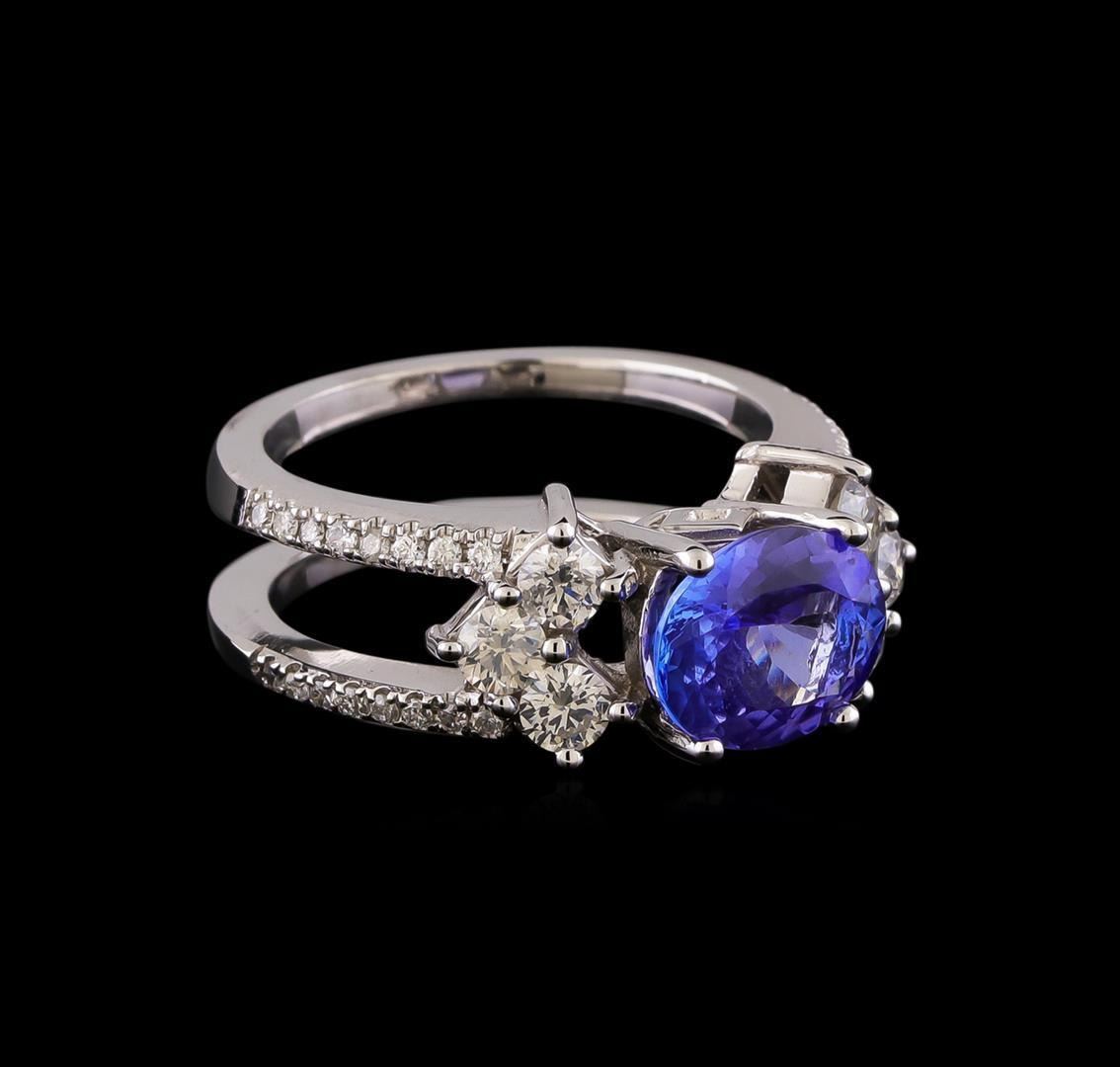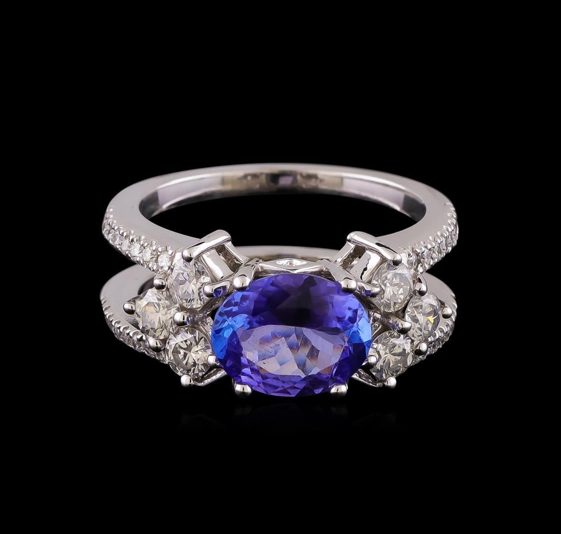 One electronically tested 14KT white gold lady's cast fashion ring with a double shank with a bright polish finish. The featured lady's ring has a double shank measuring 7.06 millimeters wide. Identified with markings of "14K". Condition is new, good workmanship. Containing: One prong set oval modified brilliant cut natural tanzanite, measuring 9.33 x 7.52 x 3.98mm, (depth est.) approximate weight of 1.98ct., clarity is eye clean, medium light, very slightly grayish, violetish blue color, (GIA vB 4/3), cut is good. Transmitting light with no distortion, transparent. Colored gemstones are presumed to have been subjected to commonly used enhancement processes. Graded in the setting. Six prong set round brilliant cut diamonds, measuring 3.20 - 3.10 x 1.89mm (depth est.) approximate total weight of 6 Stones = 0.66ct. Graded in the setting. Clarity: VS-2 to SI-1. Color: H - I. Cut Very Good Thirty-Two prong set round brilliant cut diamonds, measuring 1.25 - 1.15 x 0.72mm (depth est.) approximate total weight of 32 Stones = 0.20 ct. Graded in the setting. Clarity: SI-1 to SI-2. Color: H - I. Cut Good. Total Weight of Colored Stones 1.98ct. Total Weight of Diamonds 0.86ct. Total Weight of Ring 6.70gm.