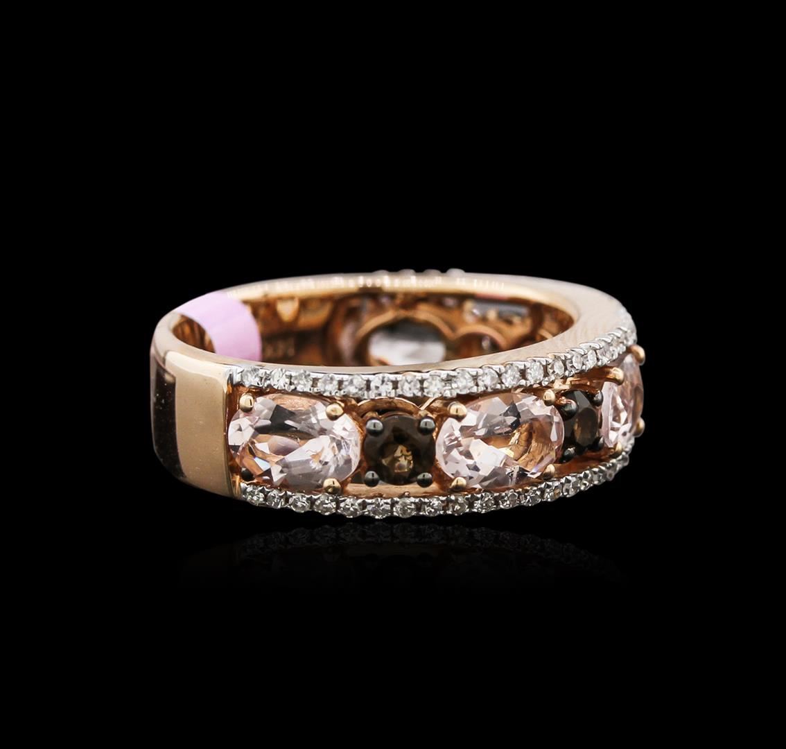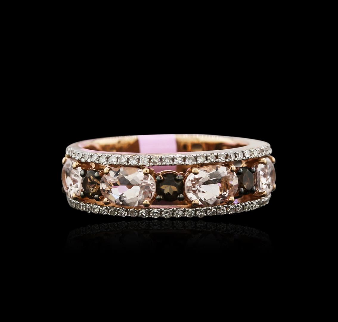 One ring featuring: 14KT rose gold weighing 5.90 grams containing morganites with a total weight of 1.98ct, smokey topaz with a total weight of 0.44ct and diamonds with a total weight of 0.33ct.