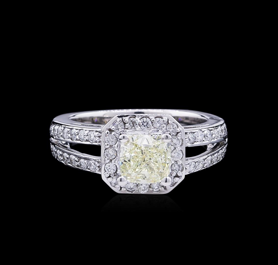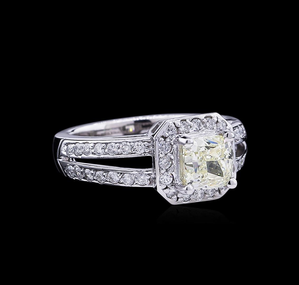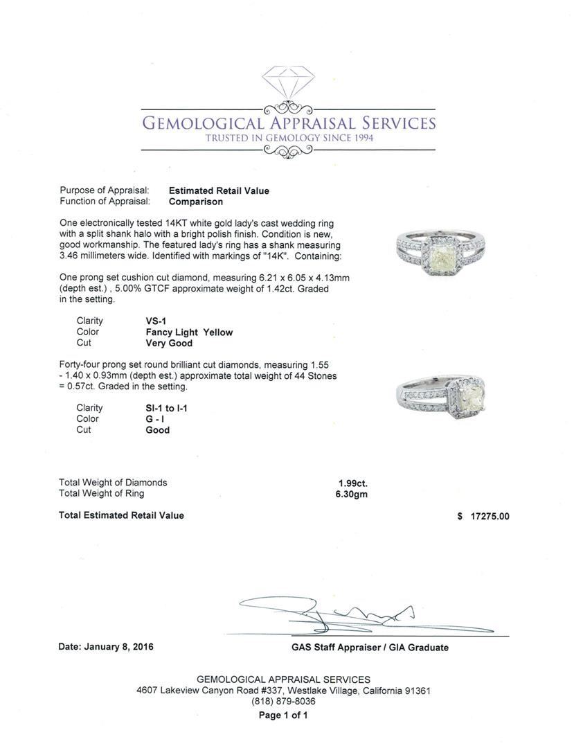 One electronically tested 14KT white gold lady's cast wedding ring with a split shank halo with a bright polish finish. The featured lady's ring has a shank measuring 3.46 millimeters wide. Identified with markings of "14K". Condition is new, good workmanship. Containing: One prong set cushion cut diamond, measuring 6.21 x 6.05 x 4.13mm (depth est.) , 5.00.%. GTCF approximate weight of 1.42ct. Graded in the setting. Clarity: VS-1 Cut Very Good Forty-Four prong set round brilliant cut diamonds, measuring 1.55 - 1.40 x 0.93mm (depth est.) approximate total weight of 44 Stones = 0.57ct. Graded in the setting. Clarity: SI-1 to I-1. Color: G - I. Cut Good. Total Weight of Diamonds 1.99ct. Total Weight of Ring 6.30gm. GAS Appraised at $17,275.00.