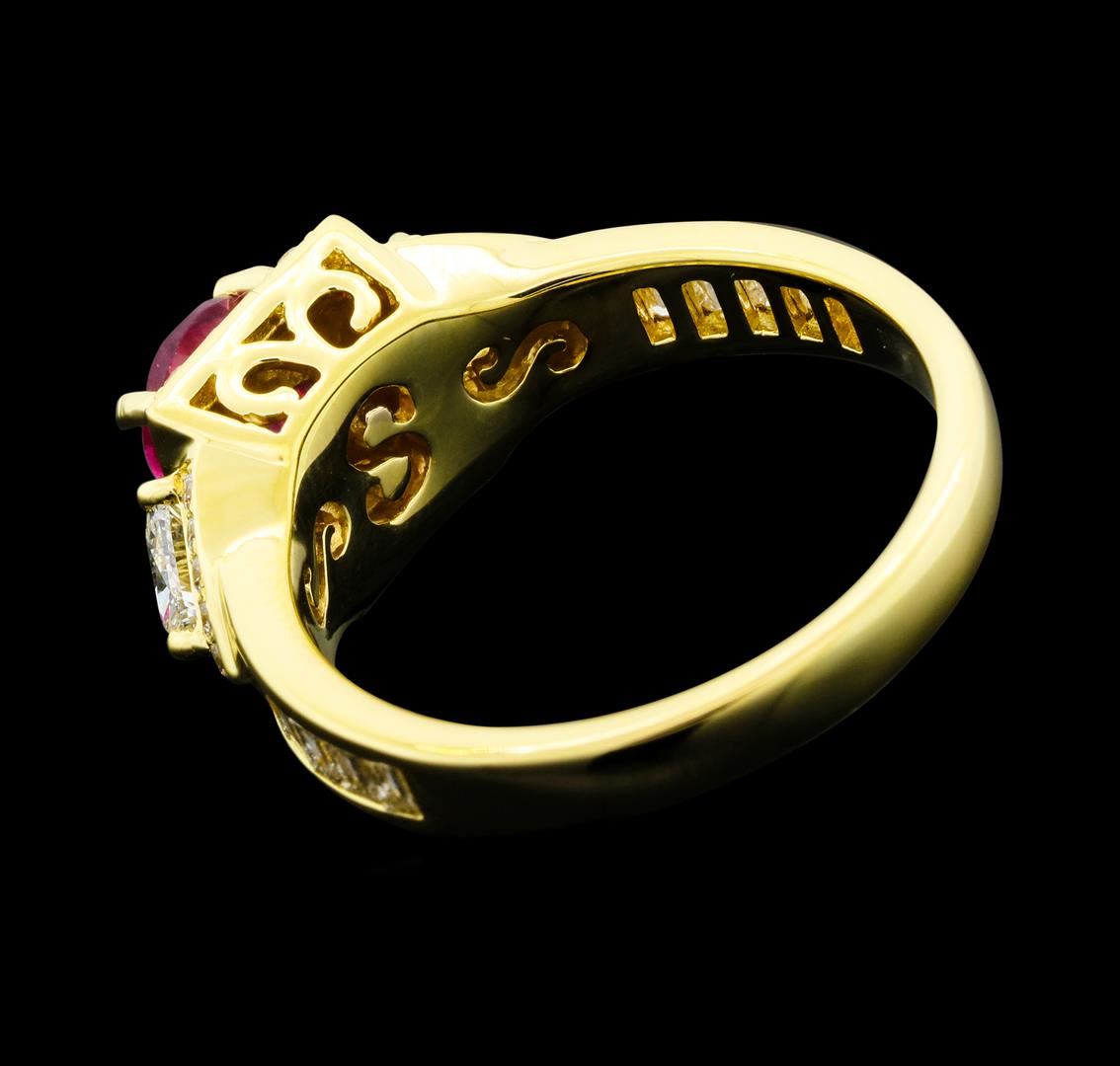 One electronically tested 18KT yellow gold lady's cast fashion ring with a tapered cathedral shank with a bright polish finish. The featured lady's ring has a shank measuring 2.68 millimeters wide. Identified with markings of '18K'. Condition is new, good workmanship. Containing: One prong set round modified mixed cut natural pink tourmaline, measuring 5.92 - 5.80 x 3.81 mm, (depth est.) approximate weight of 0.82ct., clarity is heavily included, medium, moderately strong, strongly purplish red color, (GIA stpR 5/4), cut is good. Transmitting light somewhat diffusely, semi-transparent to translucent. Naturally occurring internal & external characteristics are present. Colored gemstones are presumed to have been subjected to commonly used enhancement processes. Graded in the setting. Two prong set triangle brilliant cut diamonds, measuring 4.30 x 4.00 x 2.48mm (depth est.) approximate total weight of 2 Stones = 0.50ct. Graded in the setting. Color H - I Clarity VS-2 to SI-1 Cut Very Good Ten channel set baguette cut diamonds, measuring from 1.90 x 1.40 x 1.19mm (depth est.) to 2.10 x 1.60 x 1.36mm (depth est.) approximate total weight of 10 Stones = 0.35ct. Graded in the setting. Color H - I Clarity VS-1 to VS-2 Cut Very Good Sixteen prong set round brilliant cut diamonds, measuring 1.60 - 1.50 x 0.96mm (depth est.) approximate total weight of 16 Stones = 0.22ct. Graded in the setting. Color G - H Clarity VS-1 to VS-2 Cut Very Good Eighteen prong set round brilliant cut diamonds, measuring 1.20 - 1.10 x 0.71mm (depth est.) approximate total weight of 18 Stones = 0.10ct. Graded in the setting. Color G - H Clarity VS-1 to VS-2 Cut Very Good. Total Weight of Colored Stones 0.82ct.. Total Weight of Diamonds 1.17ct.. Total Weight of Ring 6.00gm. GAS Appraised at $4,840.00.