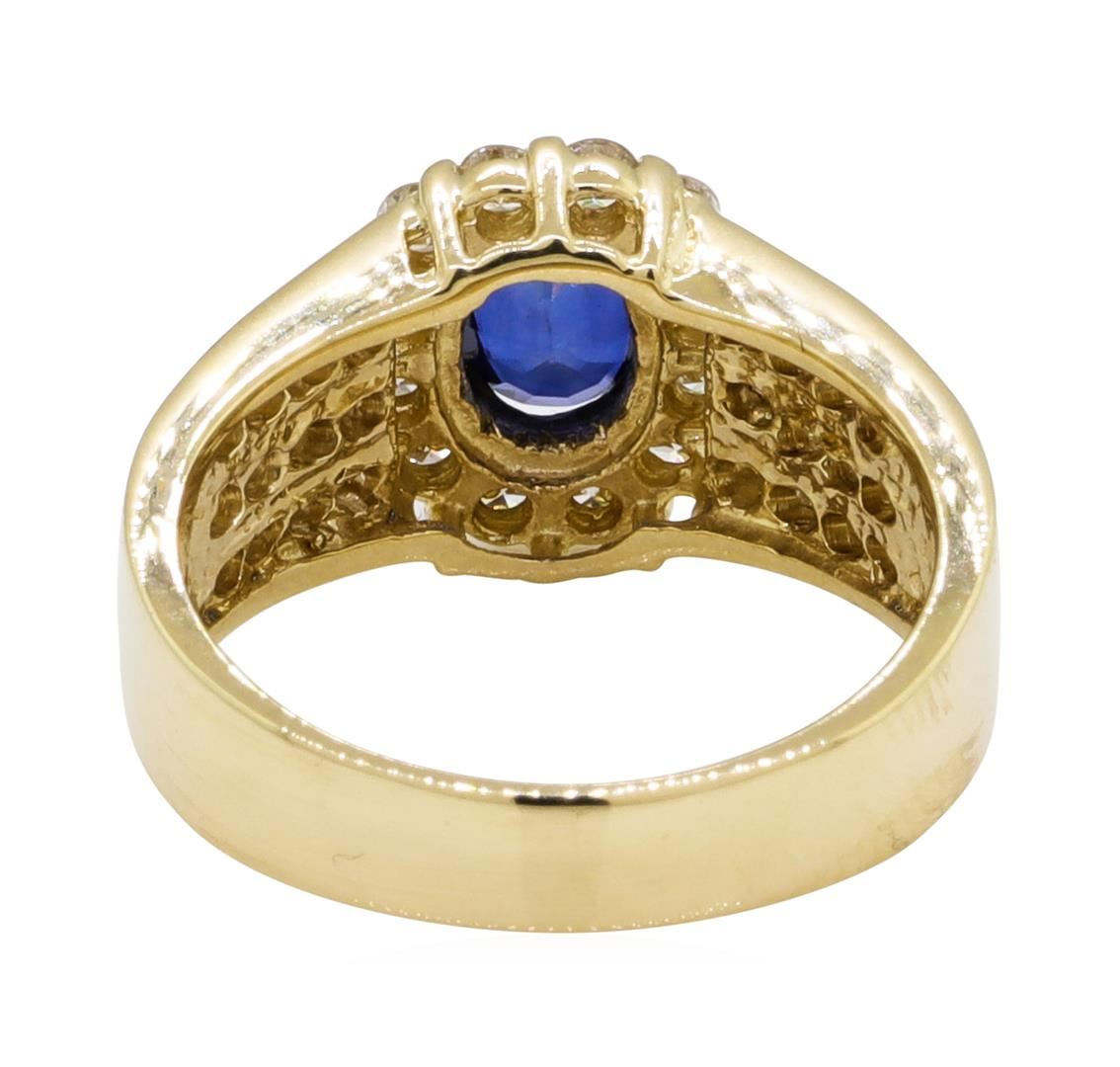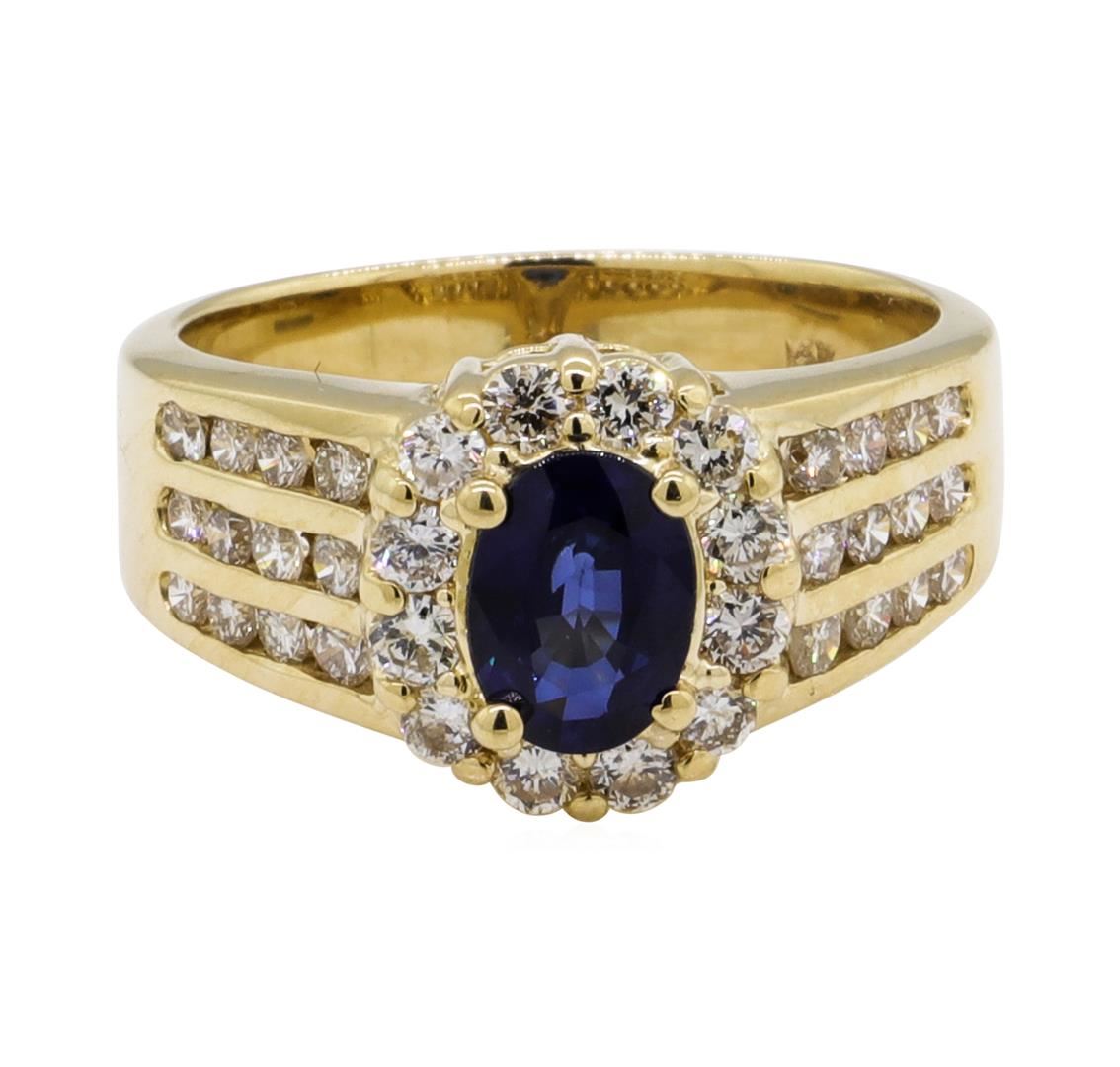 One electronically tested 14KT yellow gold lady's cast fashion wide band three row ring with a cathedral halo with a bright polish finish. This featured lady's ring has a shank measuring 4.01 millimeters in width. Identified with markings of '14K'. Condition is new, good workmanship. Containing: Twelve prong set round brilliant cut diamonds, measuring 2.10 - 2.00 x 1.27mm (depth est.) approximate total weight of 12 Stones = 0.40ct. Graded in the setting. Color H - I Clarity SI-1 to SI-2 Cut Good One prong set oval modified mixed cut natural blue sapphire, measuring 7.07 x 5.18 x 2.96mm, (depth est.) 5%. bulge factor, approximate weight of 1.00ct., clarity is eye clean, medium dark, moderately strong, blue color, (GIA B 6/4), cut is good. Transmitting light with no distortion, transparent. Colored gemstones are presumed to have been subjected to commonly used enhancement processes. Graded in the setting. Twenty-Four channel set round brilliant cut diamonds, measuring 1.80 - 1.70 x 1.09mm (depth est.) approximate total weight of 24 Stones = 0.50ct. Graded in the setting. Color H - I Clarity SI-1 to SI-2 Cut Good. Total Weight of Colored Stones 1.00ct.. Total Weight of Diamonds 0.90ct.. Total Weight of Ring 6.50gm GAS Appraised at $4165.00. GAS Appraised.