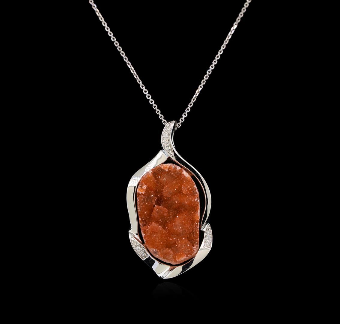 One electronically tested 14KT white gold lady's cast fashion pendant & chain 18.0' long, 1mm diamond cut oval cable link with a spring ring clasp with a bright polish finish. Identified with markings of '14K'. Condition is new, good workmanship. Containing: One free-form cut natural citrine quartz, measuring 20.00 x 12.30 x 3.20mm, (depth est.) approximate weight of 10.00ct.The featured citrine quartz has a brownish orange hue and features natural crystalline structures. Graded in the setting. Ten bead set round brilliant cut diamonds, measuring 1.40 - 1.35 x 0.86mm (depth est.) approximate total weight of 10 Stones = 0.10ct. Graded in the setting. Clarity VS-2 to SI-1. Color: H - I Cut Good. Total Weight of Colored Stones 10.00ct.. Total Weight of Diamonds 0.10ct.. Total Weight of Pendant & Chain 5.70gm. GAS Appraised at $1,040.00.