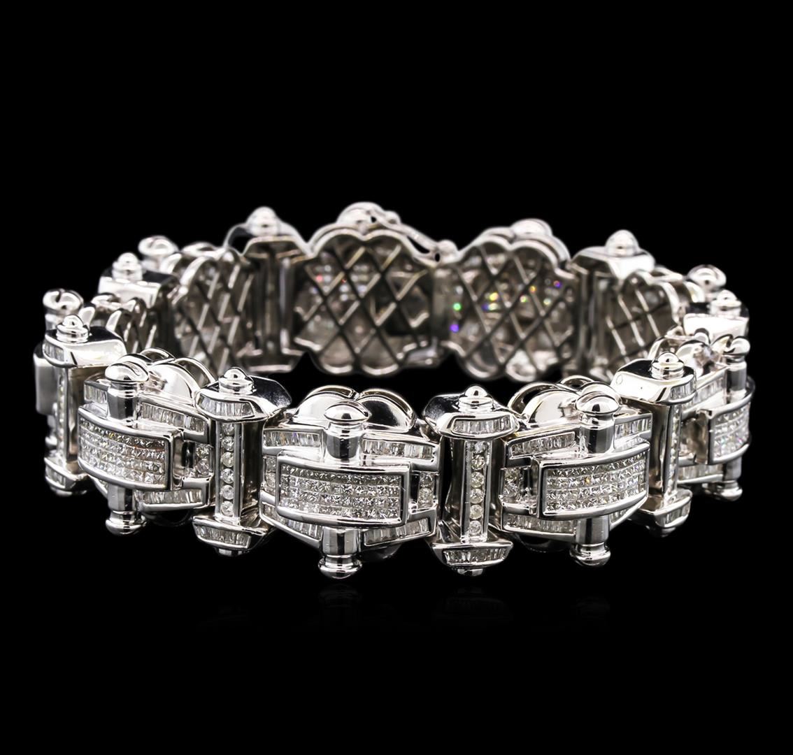 One electronically tested 14KT white gold man's combination cast & assembled fashion bracelet with a tongue clasp with foldover safety with a bright polish finish. The featured man's bracelet measures 8 inches in length. Identified with markings of "14K". Condition is new, good workmanship. Containing: Three Hundred Ninety-Six invisible set princess cut diamonds, measuring 1.20 x 1.15 x 0.86mm (depth est.) approximate total weight of 396 Stones = 3.95ct. Graded in the setting. Clarity: SI-1 to I-1. Color: G - I. Cut Good Four Hundred channel set baguette cut diamonds, measuring from 1.30 x 0.90 x 0.77mm (depth est.) to 1.50 x 1.00 x 0.85mm (depth est.) approximate total weight of 400 Stones = 4.04ct. Graded in the setting. Clarity: SI-2 to I-1. Color: H - Good Eighty-Four channel set round brilliant cut diamonds, measuring 1.90 - 1.70 x 1.17mm (depth est.) approximate total weight of 84 Stones = 2.01ct. Graded in the setting. Clarity: I-1 to I-2. Color: H - Good. Total Weight of Diamonds 10.00ct. Total Weight of Bracelet120.00gm. GAS Appraised at $25,130.00.