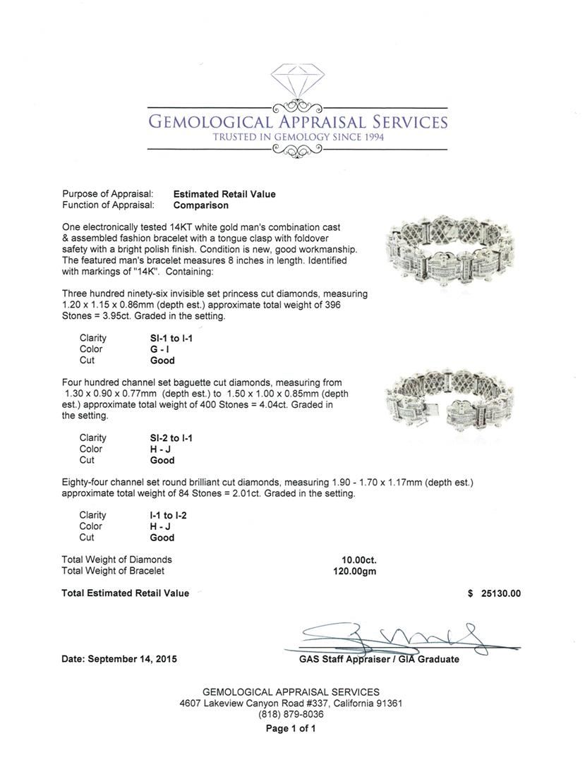 One electronically tested 14KT white gold man's combination cast & assembled fashion bracelet with a tongue clasp with foldover safety with a bright polish finish. The featured man's bracelet measures 8 inches in length. Identified with markings of "14K". Condition is new, good workmanship. Containing: Three Hundred Ninety-Six invisible set princess cut diamonds, measuring 1.20 x 1.15 x 0.86mm (depth est.) approximate total weight of 396 Stones = 3.95ct. Graded in the setting. Clarity: SI-1 to I-1. Color: G - I. Cut Good Four Hundred channel set baguette cut diamonds, measuring from 1.30 x 0.90 x 0.77mm (depth est.) to 1.50 x 1.00 x 0.85mm (depth est.) approximate total weight of 400 Stones = 4.04ct. Graded in the setting. Clarity: SI-2 to I-1. Color: H - Good Eighty-Four channel set round brilliant cut diamonds, measuring 1.90 - 1.70 x 1.17mm (depth est.) approximate total weight of 84 Stones = 2.01ct. Graded in the setting. Clarity: I-1 to I-2. Color: H - Good. Total Weight of Diamonds 10.00ct. Total Weight of Bracelet120.00gm. GAS Appraised at $25,130.00.