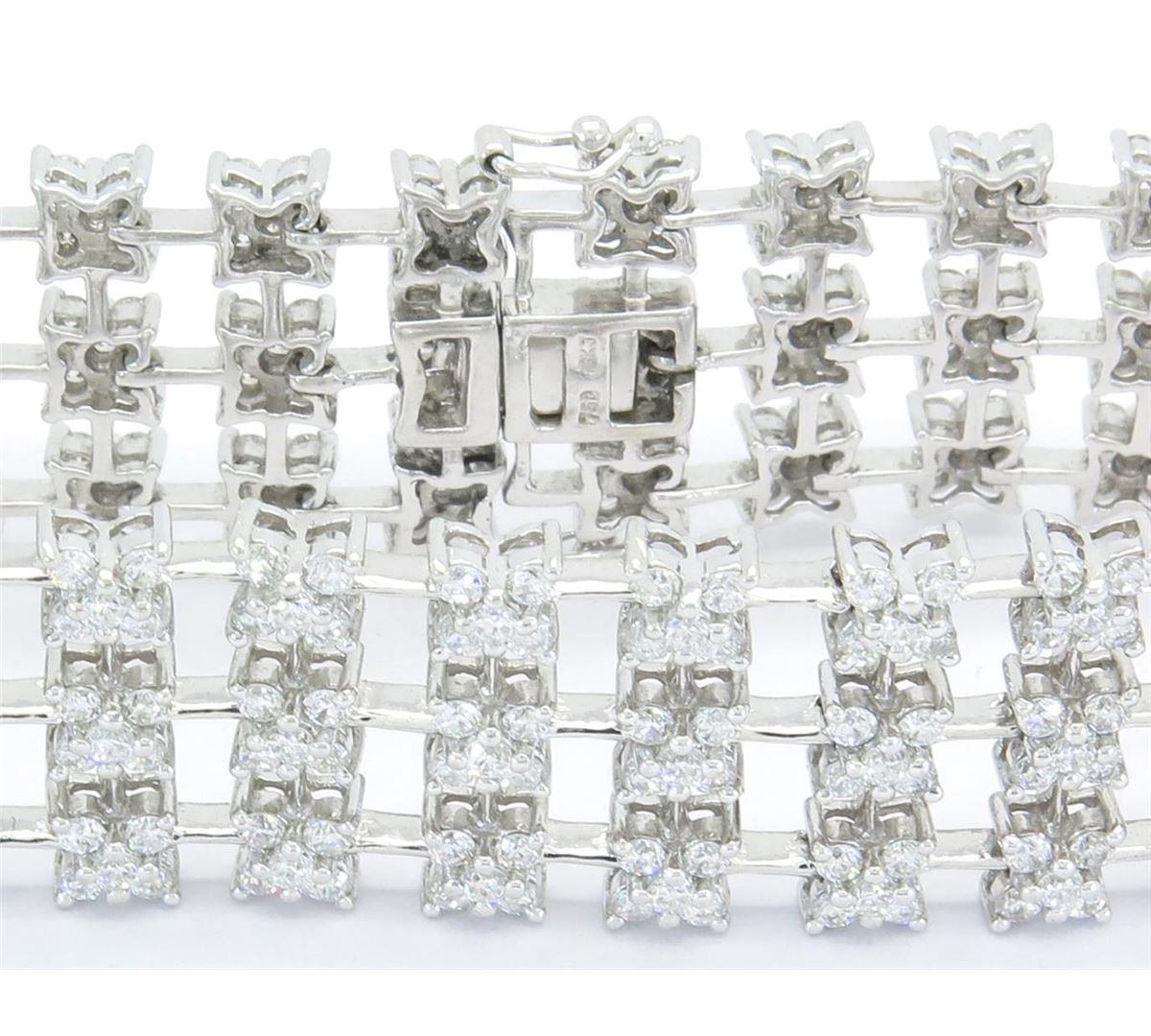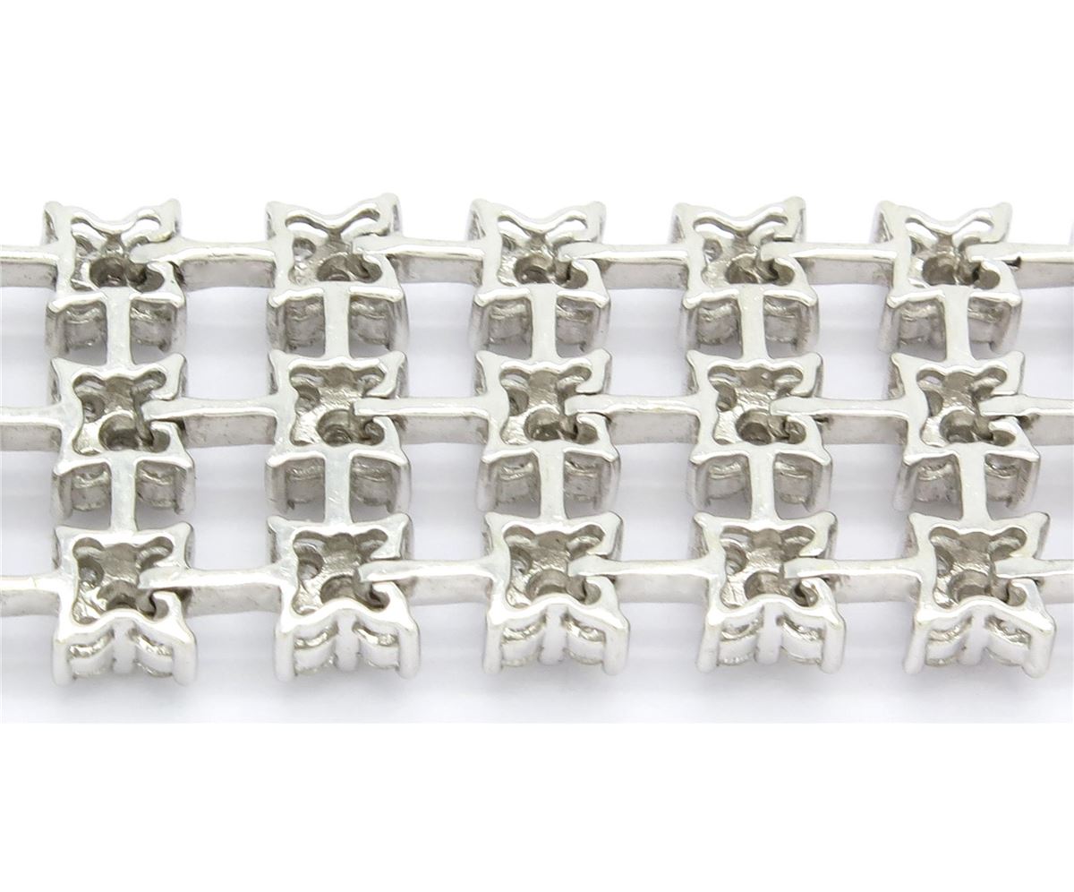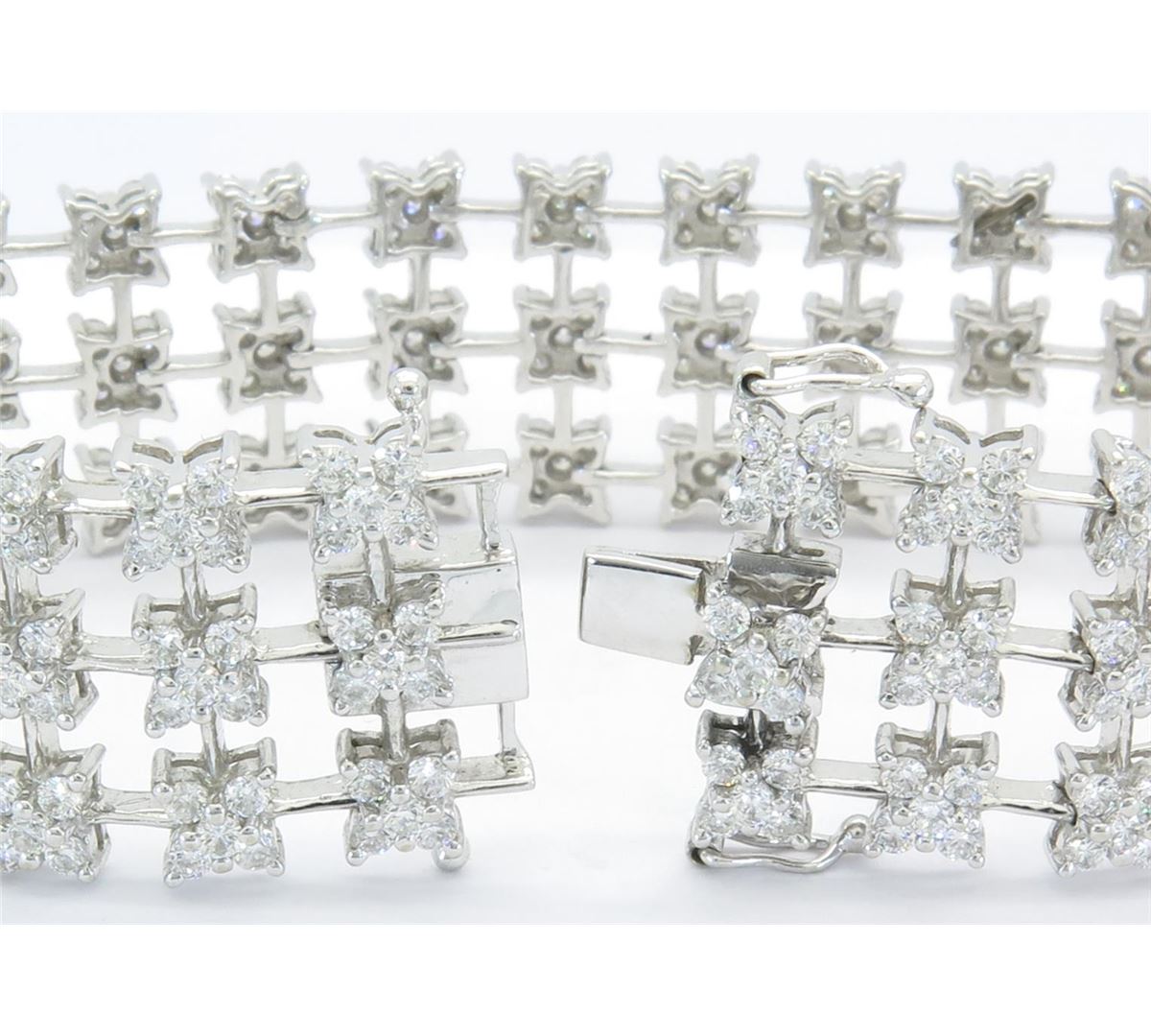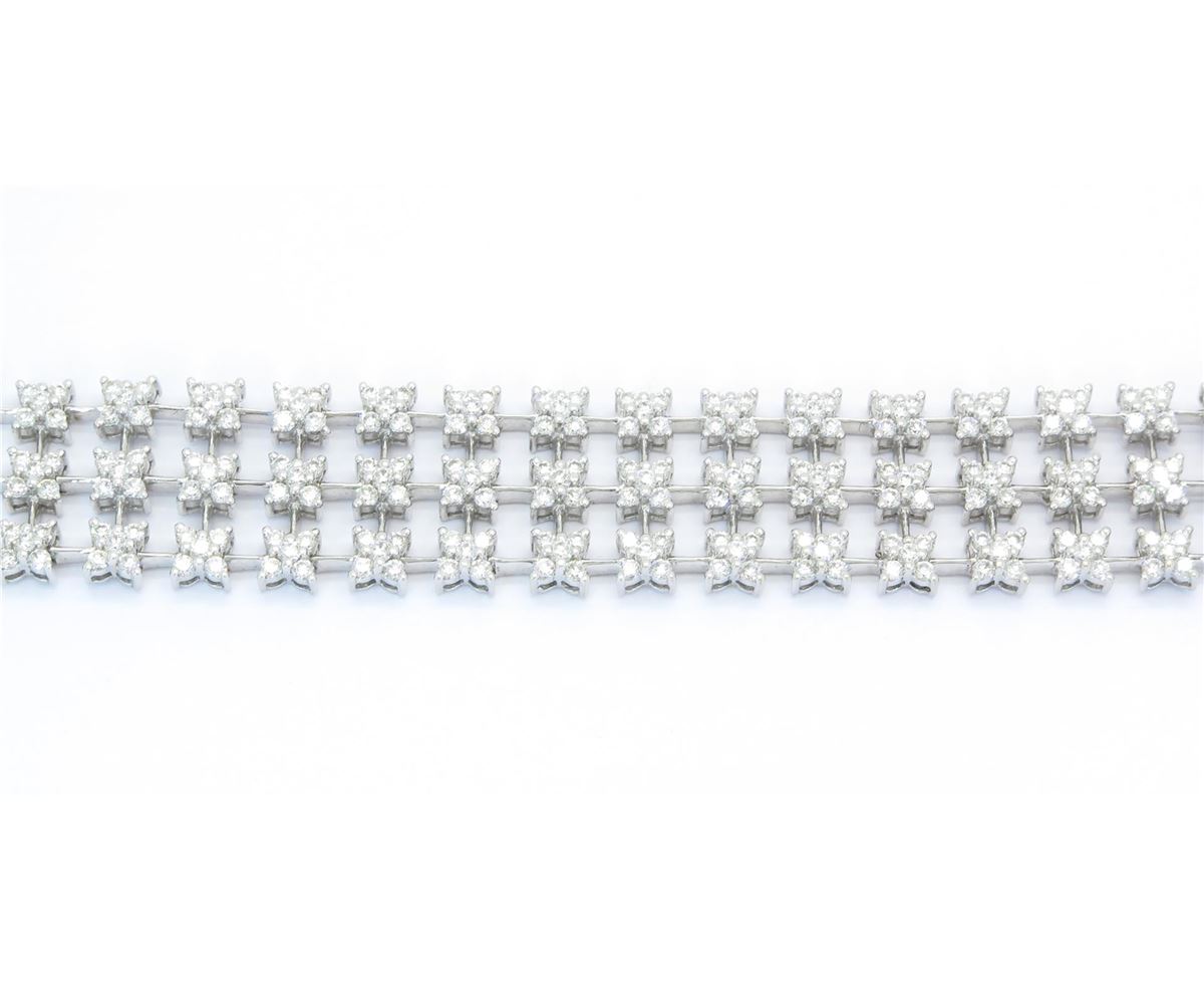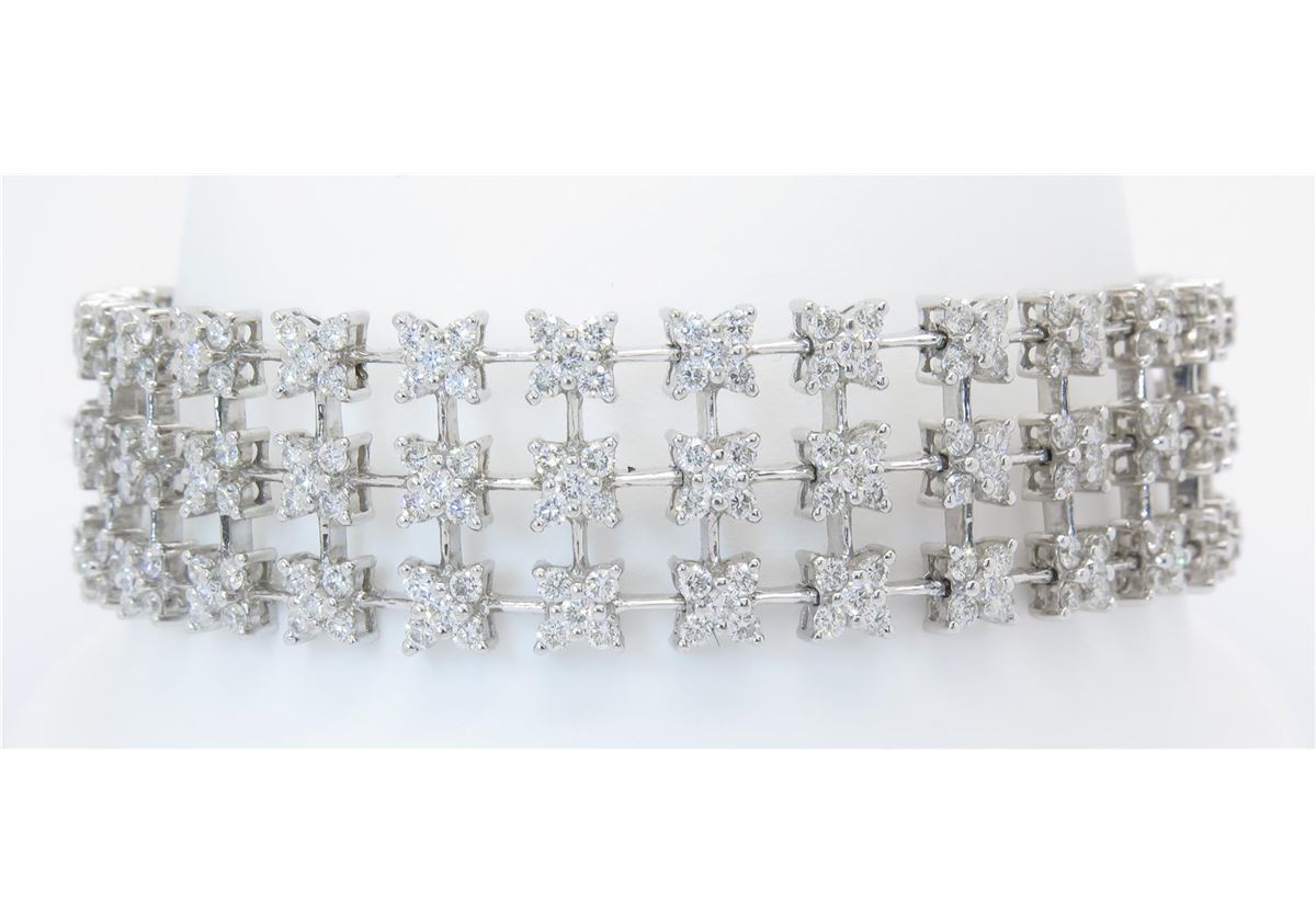 One tested 18K white gold diamond bracelet. Containing: 420 Round Brilliant Cut Diamonds. Clarity: VS-SI, Color: F-H. Approximate total diamond weight: 10CTW. Diamonds are graded in the mounting, unless otherwise stated. Weight of bracelet: 35.6 grams. Size: 7" long.