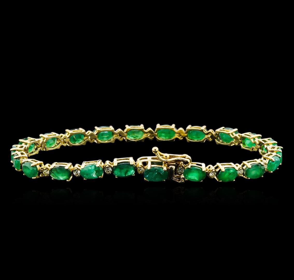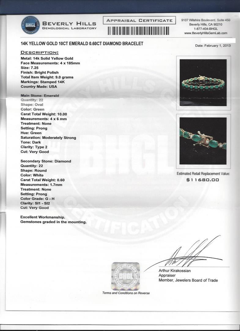 14K Yellow Gold 10CT Emerald 0.60CT Diamond Bracelet. Description: Meal: 14k solid yellow gold. Face Measurements: 4 x 185mm. Size: 7.25. Finish: bright polish. Total Item Weight: 9.0 grams. Markings: stamped 14K. Country Made: USA. Main Stone: emerald. Quantity: 22. Shape: oval. Color: green. Carat Total Weight: 10.00. Measurements: 4 x 6 mm. Treatment: none. Setting: prong. Hue: green. Saturation: moderately strong. Tone: dark. Clarity: type 2. Cut: very good. Secondary Stone: diamond. Quantity: 22. Shape: round. Color: white. Carat Total Weight: 0.60. Measurements: 1.7mm. Treatment: none Setting: prong. Color Grade: G-H. Clarity: SI1-SI2. Cut: very good. Excellent Workmanship. Gemstones graded in the mounting. BHGL Appraised at $11,680.00.