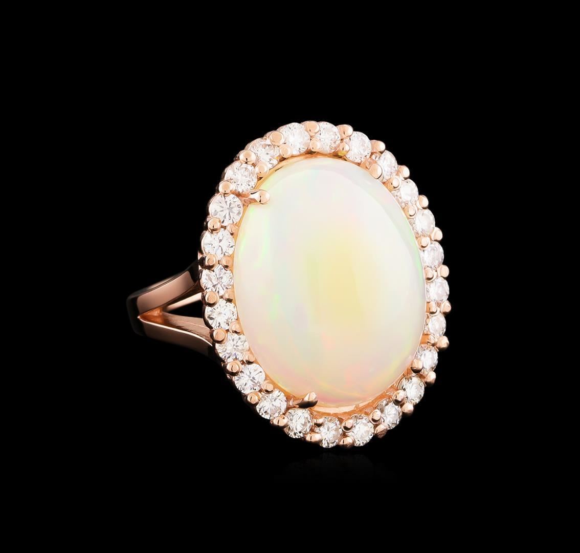 One electronically tested 14KT rose gold lady's cast fashion ring with a basket halo with a bright polish finish. The featured lady's ring has a shank measuring 2.30 millimeters wide. Identified with markings of "14K". Condition is new, good workmanship. Containing: One semi crystal opal that is cut in a oval shaped cabochon and is prong set, measuring 18.56 mm long x 15.16 mm wide, and 7.94 mm thick and the approximate weight is 10.00 carats. The opal has a somewhat bright, orange-green play of color (fire) in a rolling flashfire pattern; a medium dome; a good cut; no inclusions; distracting variation in base in its brightness and pattern; and is not directional. Graded in the setting. Twenty-Four prong set round brilliant cut diamonds, measuring 2.40 - 2.30 x 1.46mm (depth est.) approximate total weight of 24 Stones = 1.20 ct. Graded in the setting. Clarity: VS-2 to SI-2. Color: H - I. Cut Good. Total Weight of Diamonds 1.20 ct. Total Weight of Opals 10.00 ct. Total Weight of Ring 10.10gm. GAS Appraised.