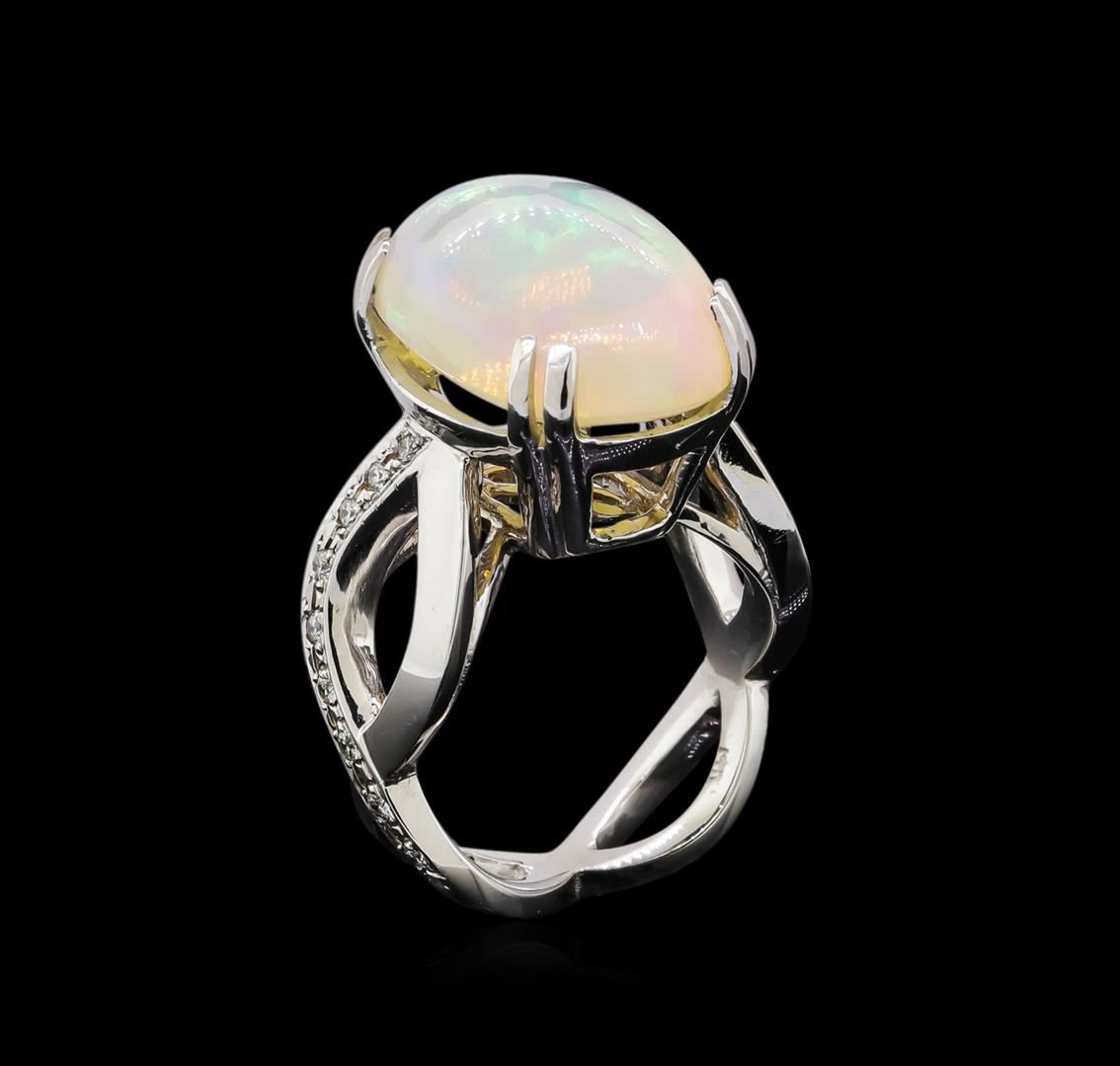 One electronically tested 14KT white gold lady's cast fashion ring with a twisted cathedral shank with a bright polish finish. The featured lady's ring has a shank measuring 2.6 millimeters in width. Identified with markings of '14K'. Condition is new, good workmanship. Containing: One crystal opal that is cut in a oval shaped cabochon and is prong set, measuring 18.73 mm long x 12.90 mm wide, and 8.90 mm thick and the approximate weight is 10.00 carats. The opal has a somewhat bright, multicolor play of color (fire) in a rolling flashfire pattern; a high dome; a good cut; no inclusions; slight variation in base in its brightness and pattern; and is not directional. Graded in the setting. Eighteen prong set round brilliant cut diamonds, measuring 1.50 - 1.40 x 0.87mm (depth est.) approximate total weight of 18 Stones = 0.20ct. Graded in the setting. Clarity SI-1 to SI-2. Color: H - I Cut Good. Total Weight of Diamonds 0.20ct.. Total Weight of Opals 10.00ct.. Total Weight of Ring 11.90gm. GAS Appraised at $5,040.00.