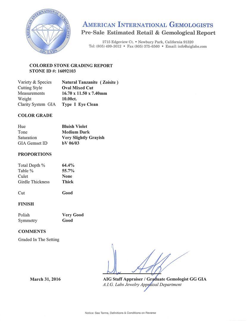 One electronically tested 14KT white gold ladies cast tanzanite and diamond ring with a bright polish finish. The featured tanzanite is set within a stylized diamond floret supported by a ribbed under gallery, completed by a three millimeter wide band. Identified with markings of "K14". Condition is new, good workmanship. Containing: One prong set oval mixed cut natural tanzanite, measuring 16.70 x 11.50 x 7.40mm, approximate weight of 10.00ct., clarity is eye clean, type I, medium dark, very slightly grayish, bluish violet color, (GIA bV 6/3), cut is good. Transmitting light with no distortion, transparent. Colored Stone Grading Report attached. Graded in the setting. Tanzanite is a very rare gemstone that is only found in the country of Tanzania. Originally discovered in 1967. Tiffany & Company, named the stone Tanzanite. It is found in the Usumburu Mountains that border the Umba Valley of northern Tanzania. Tanzanite occurs in gray, brown, violet, blue, reddish-purple, & green. The gem is interesting because of its exceptional pleochroism. Rotated in different directions a tanzanite will exhibit multiple changes of color. Tanzanite has a low tolerance to ultrasonic cleaning, and should not be cleaned using this method. Eight prong set round brilliant cut diamonds, measuring 2.40 - 2.40 x 1.44mm (depth est.) approximate total weight of 8 Stones = 0.41ct. Graded in the setting. Clarity: SI-2 to I-1. Color: G - I Sixteen prong set round brilliant cut diamonds, measuring 1.50 - 1.50 x 0.90mm (depth est.) approximate total weight of 16 Stones = 0.20ct. Graded in the setting. Clarity: SI-2 to I-2. Color: G - I Forty prong set round brilliant cut diamonds, measuring 1.20 - 1.20 x 0.72mm (depth est.) approximate total weight of 40 Stones = 0.25ct. Graded in the setting. Clarity: SI-2 to I-2. Color: G - I. Total Weight of Colored Stones 10.00ct. Total Weight of Diamonds 0.86ct. Total Weight of Ring 9.68gm. AIG Appraised at $26,440.00.