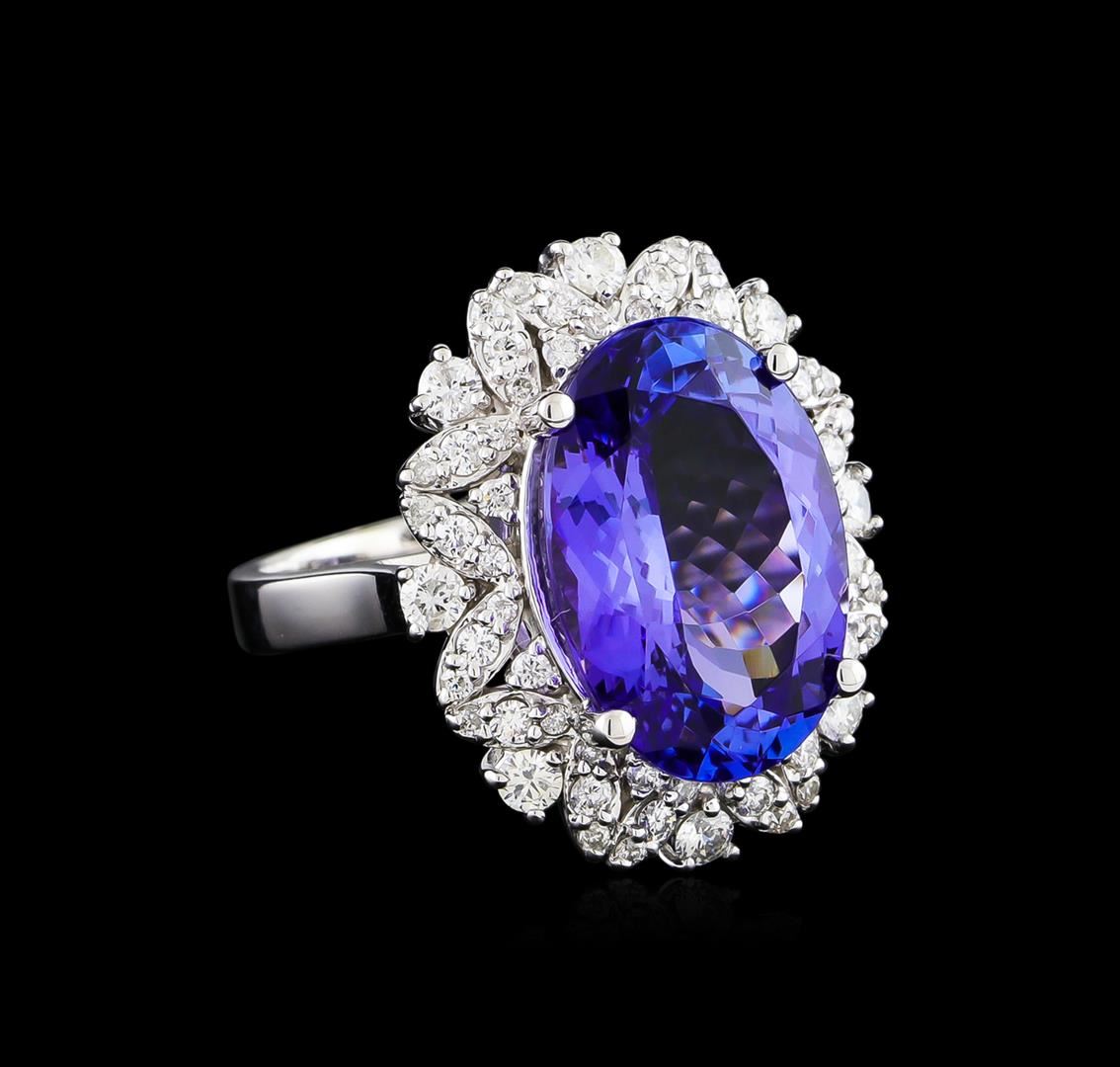 One electronically tested 14KT white gold ladies cast tanzanite and diamond ring with a bright polish finish. The featured tanzanite is set within a stylized diamond floret supported by a ribbed under gallery, completed by a three millimeter wide band. Identified with markings of "K14". Condition is new, good workmanship. Containing: One prong set oval mixed cut natural tanzanite, measuring 16.70 x 11.50 x 7.40mm, approximate weight of 10.00ct., clarity is eye clean, type I, medium dark, very slightly grayish, bluish violet color, (GIA bV 6/3), cut is good. Transmitting light with no distortion, transparent. Colored Stone Grading Report attached. Graded in the setting. Tanzanite is a very rare gemstone that is only found in the country of Tanzania. Originally discovered in 1967. Tiffany & Company, named the stone Tanzanite. It is found in the Usumburu Mountains that border the Umba Valley of northern Tanzania. Tanzanite occurs in gray, brown, violet, blue, reddish-purple, & green. The gem is interesting because of its exceptional pleochroism. Rotated in different directions a tanzanite will exhibit multiple changes of color. Tanzanite has a low tolerance to ultrasonic cleaning, and should not be cleaned using this method. Eight prong set round brilliant cut diamonds, measuring 2.40 - 2.40 x 1.44mm (depth est.) approximate total weight of 8 Stones = 0.41ct. Graded in the setting. Clarity: SI-2 to I-1. Color: G - I Sixteen prong set round brilliant cut diamonds, measuring 1.50 - 1.50 x 0.90mm (depth est.) approximate total weight of 16 Stones = 0.20ct. Graded in the setting. Clarity: SI-2 to I-2. Color: G - I Forty prong set round brilliant cut diamonds, measuring 1.20 - 1.20 x 0.72mm (depth est.) approximate total weight of 40 Stones = 0.25ct. Graded in the setting. Clarity: SI-2 to I-2. Color: G - I. Total Weight of Colored Stones 10.00ct. Total Weight of Diamonds 0.86ct. Total Weight of Ring 9.68gm. AIG Appraised at $26,440.00.