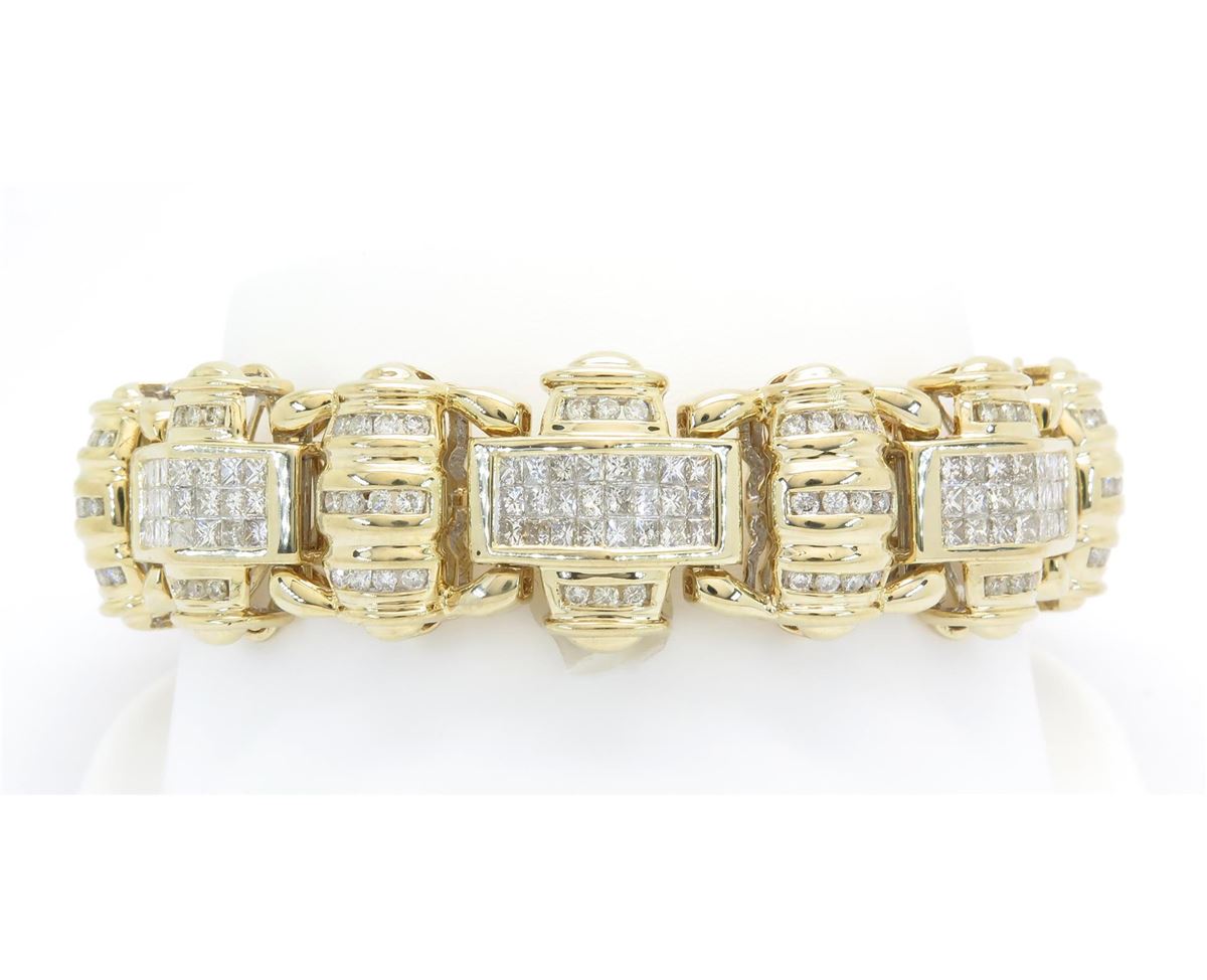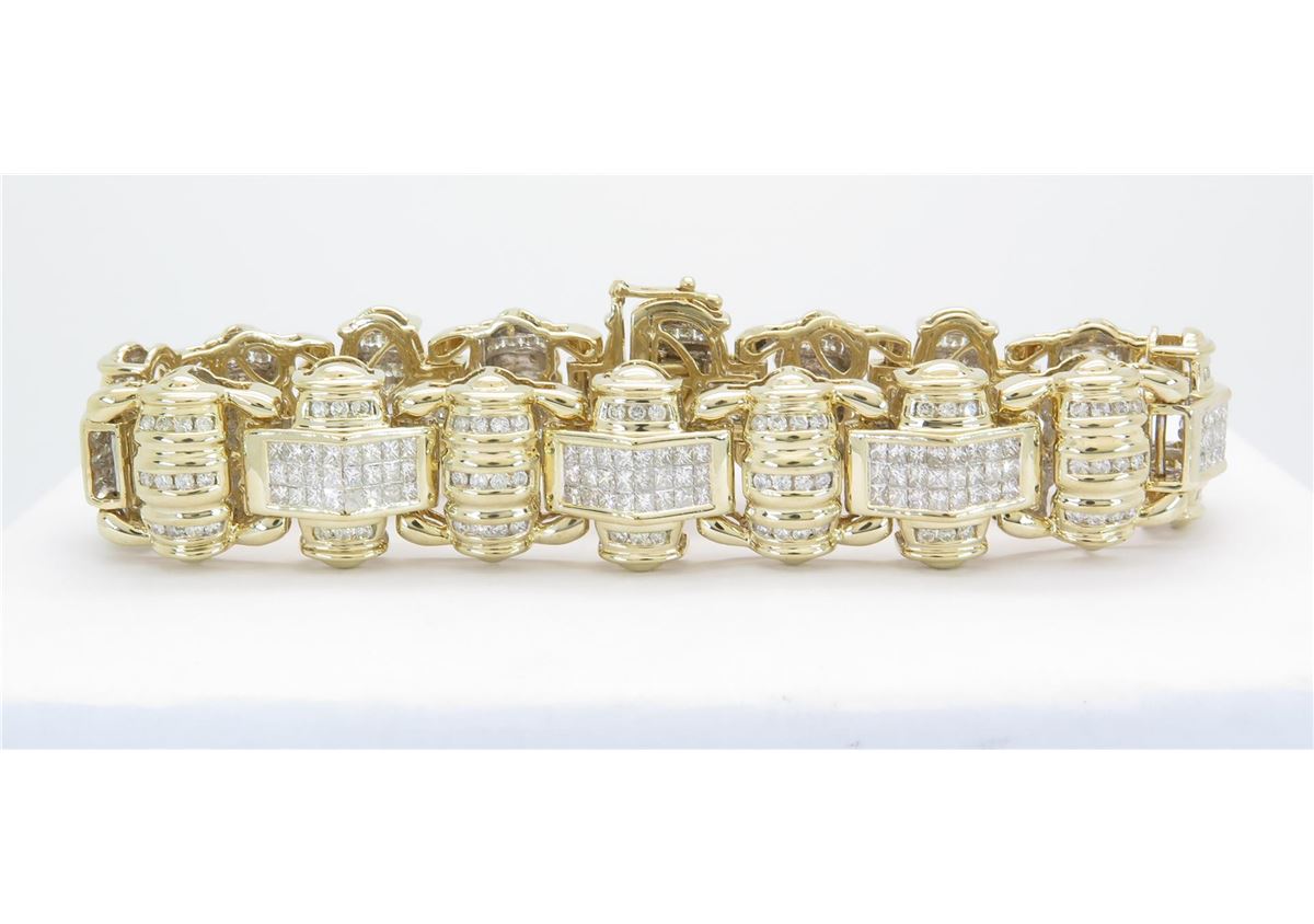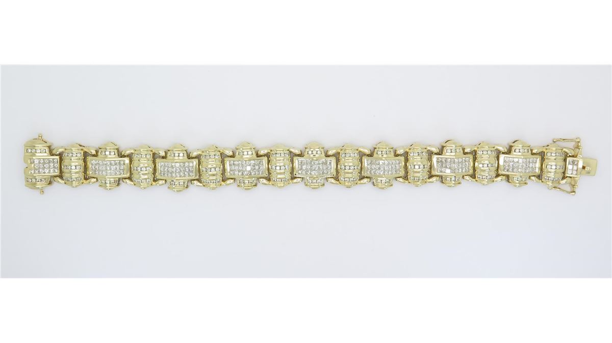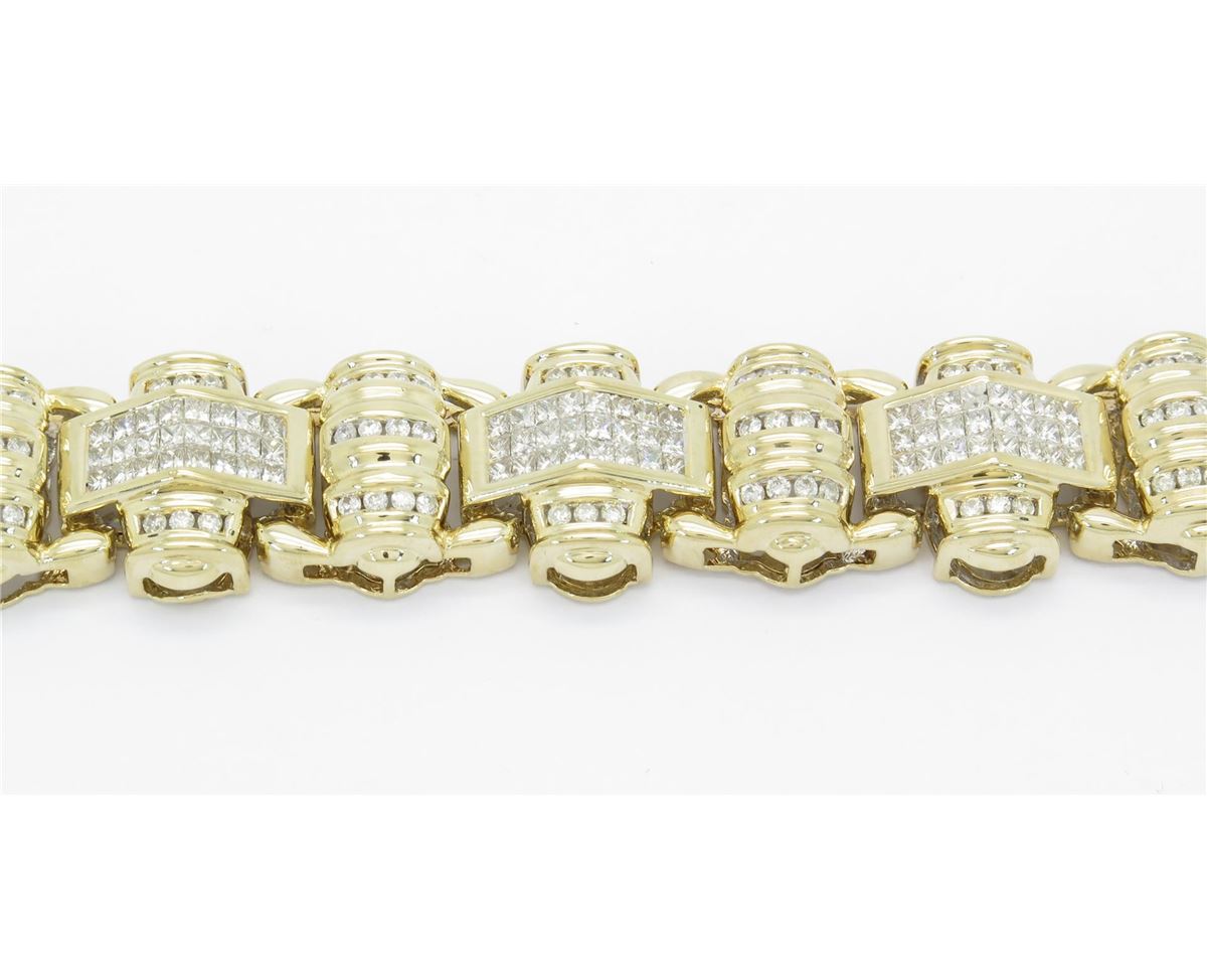 One tested 14K yellow gold mens diamond bracelet. Condition is new. Containing: 146 Round Brilliant Cut Diamonds, 191 Princess Cut Diamonds. Clarity: I-VS, Color: G-I. Approximate Total diamond weight: 10CTW. Diamonds are graded in the mounting, unless otherwise stated. Weight of bracelet: 64.0 grams. Size: 8.25"