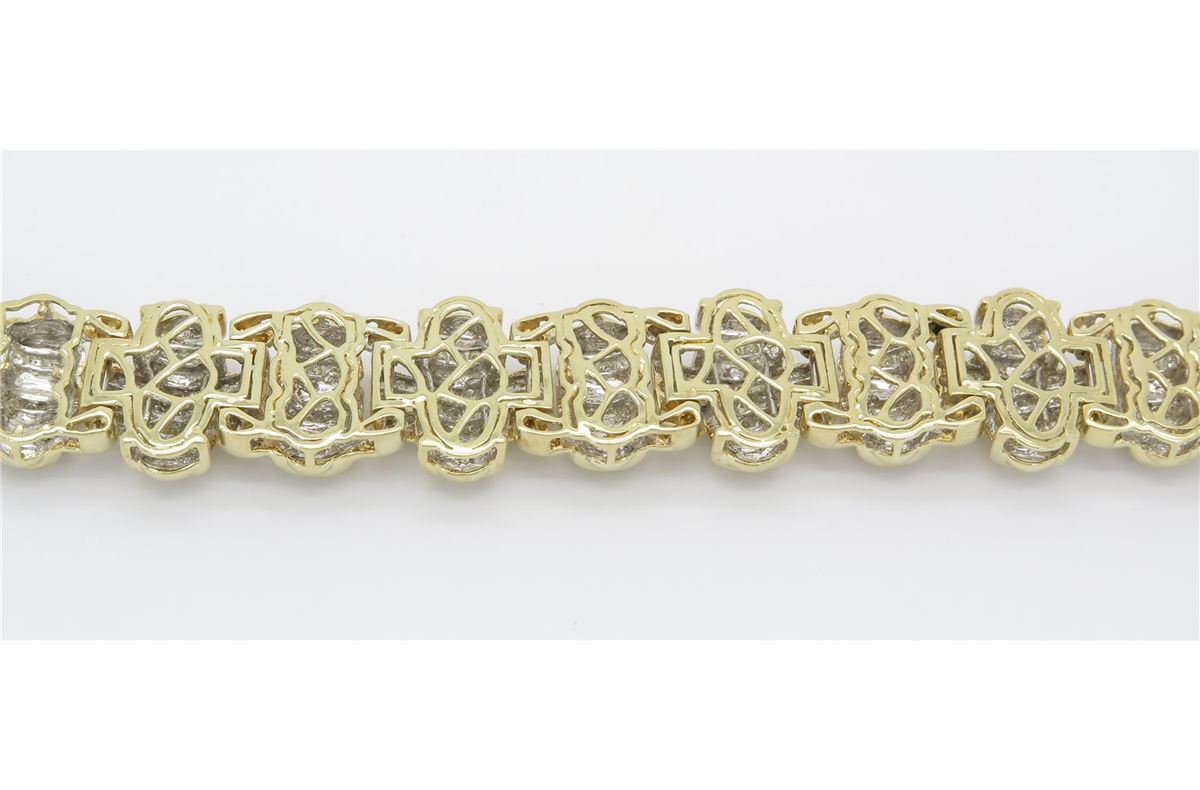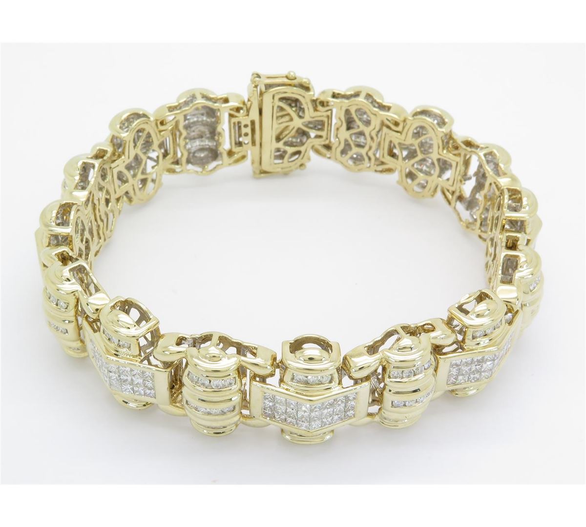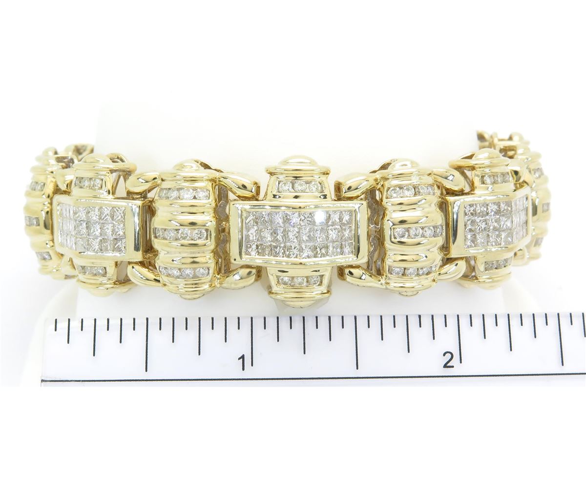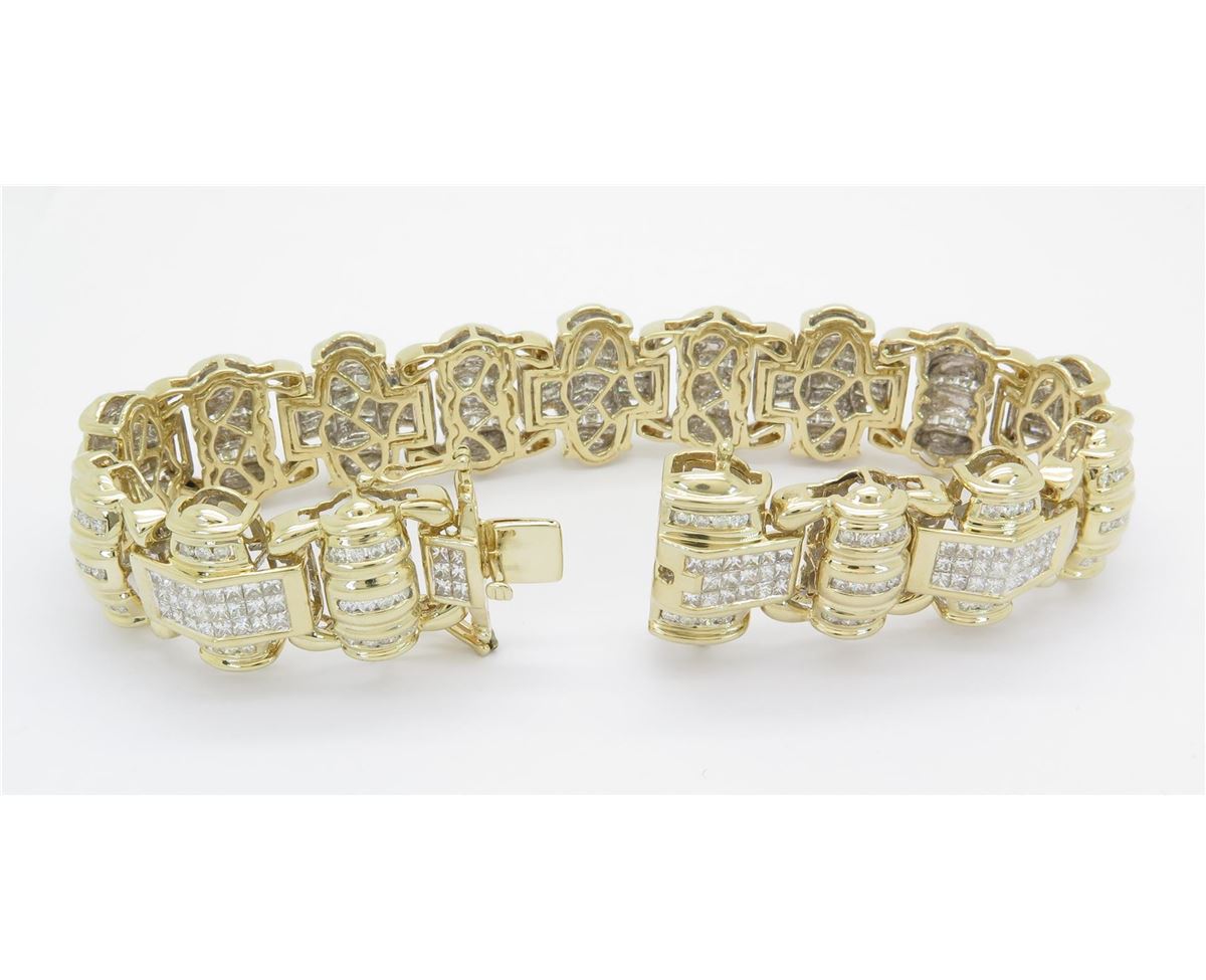 One tested 14K yellow gold mens diamond bracelet. Condition is new. Containing: 146 Round Brilliant Cut Diamonds, 191 Princess Cut Diamonds. Clarity: I-VS, Color: G-I. Approximate Total diamond weight: 10CTW. Diamonds are graded in the mounting, unless otherwise stated. Weight of bracelet: 64.0 grams. Size: 8.25"