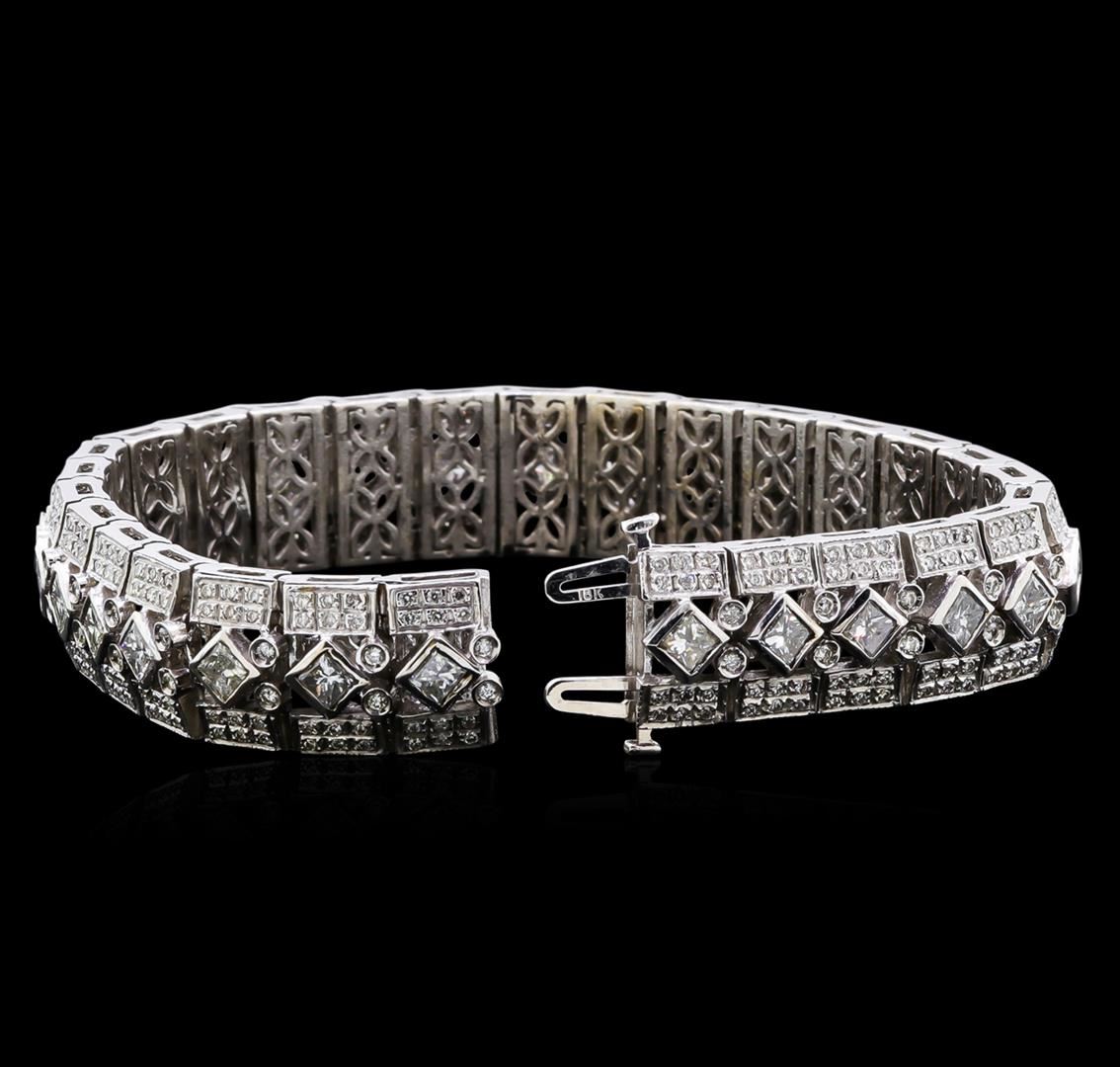 One stamped 18 karat white gold cast and assembled diamond bracelet. The bracelet weights 60 grams including the diamonds. The overall motif is that of a straight link style with each link joined to one another by a three part tub hinged system. There are 28 links including both the female and male catch that match the other 26 links, the catch is a double tongue box style. Each links focal point is a 3.5mm princess cut diamond "I" clarity; "H,I,J" color range; set in a full bezel on a diagonal so that it appears as a diamond shape. Straddling the princess cut there is a double row of 3 diamonds measuring approximately 1mm each that are bead and bright cut set for a total of 6 diamonds on each side for a total of 12 diamond on the two sides. On the opposite side of the female end of the catch on each link there are 2; 1.5mm round diamonds French curl set in a tube. Under each of the links there is cast floral under gallery that was solder in place. Estimated total diamond weight is 10.00ct.