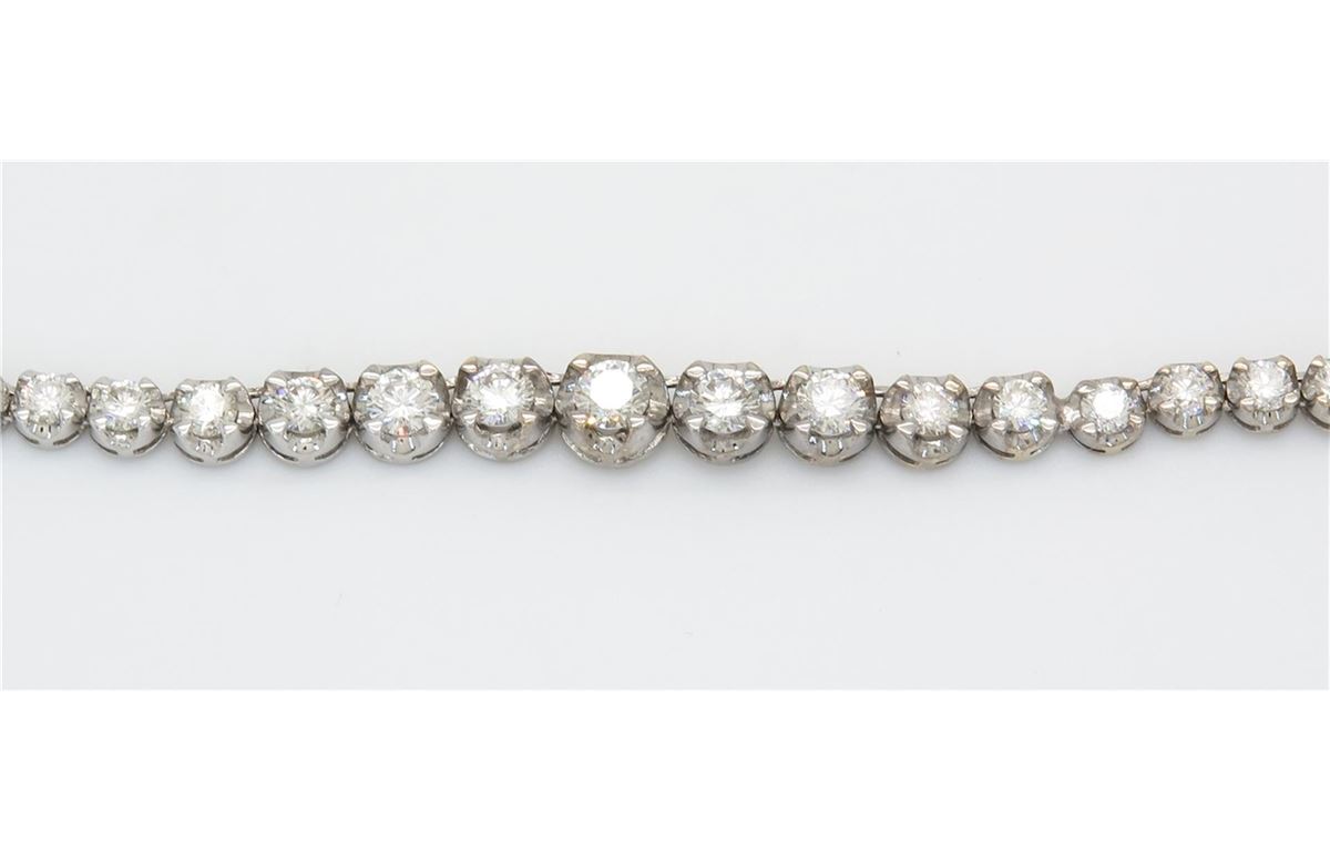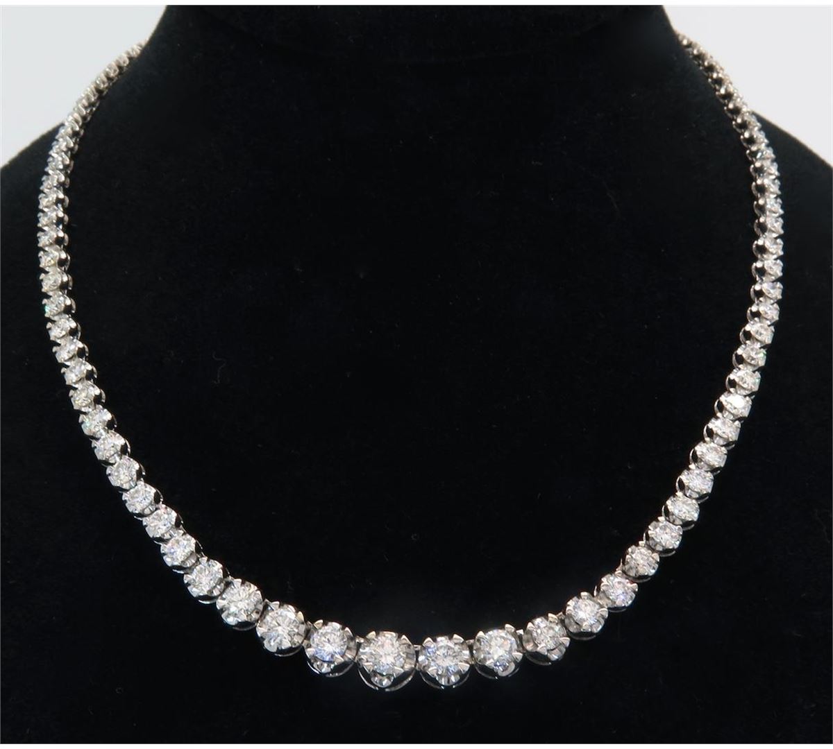 One tested 18K white gold diamond necklace. Containing: 95 Round Brilliant Cut Diamonds, Clarity: VS, Color: F-H. Approximate total diamond weight: 10.00CTW. All diamonds are graded in the mounting unless otherwise stated. Weight of necklace: 29.9 grams, Size: 16.5 inches.