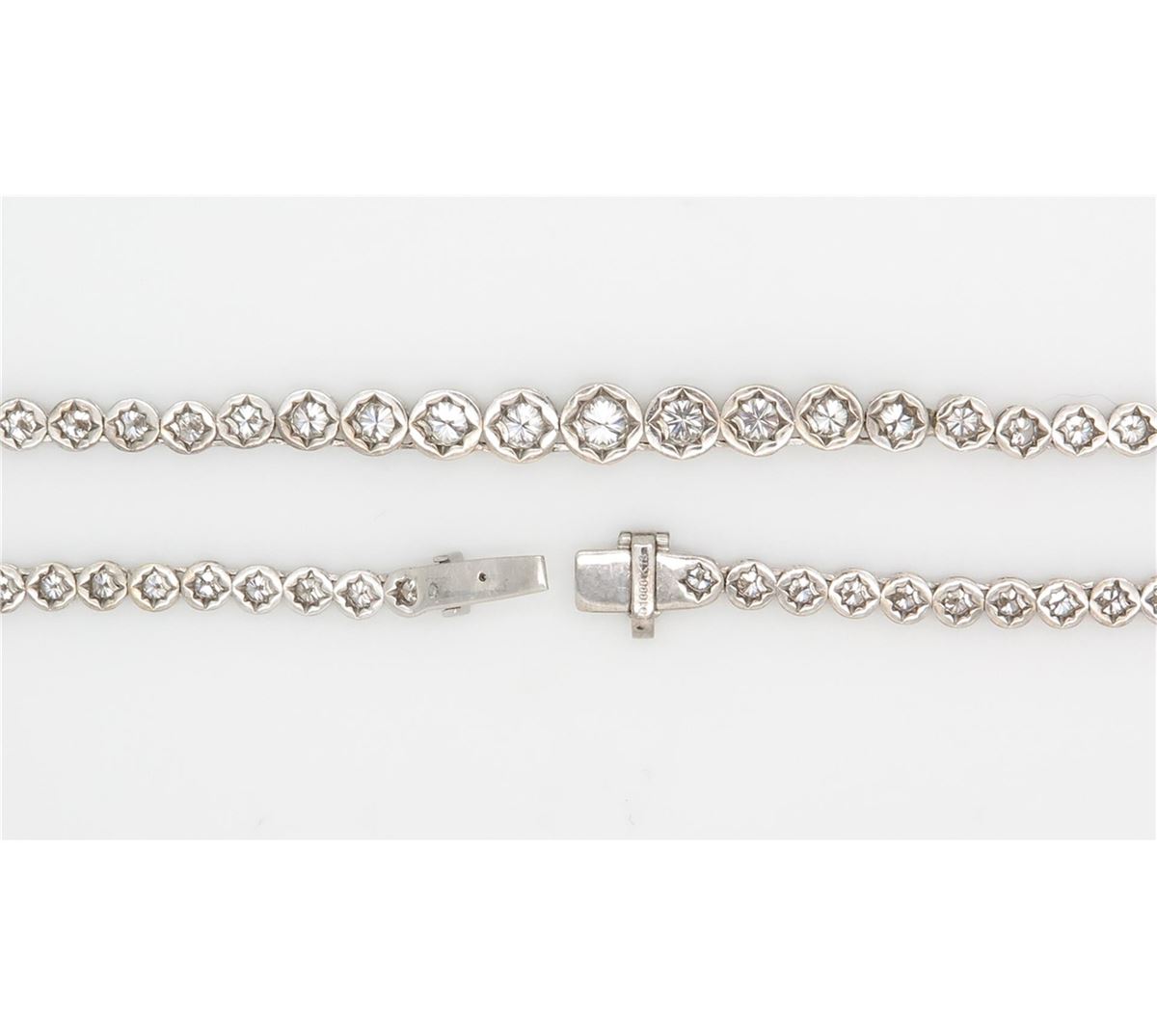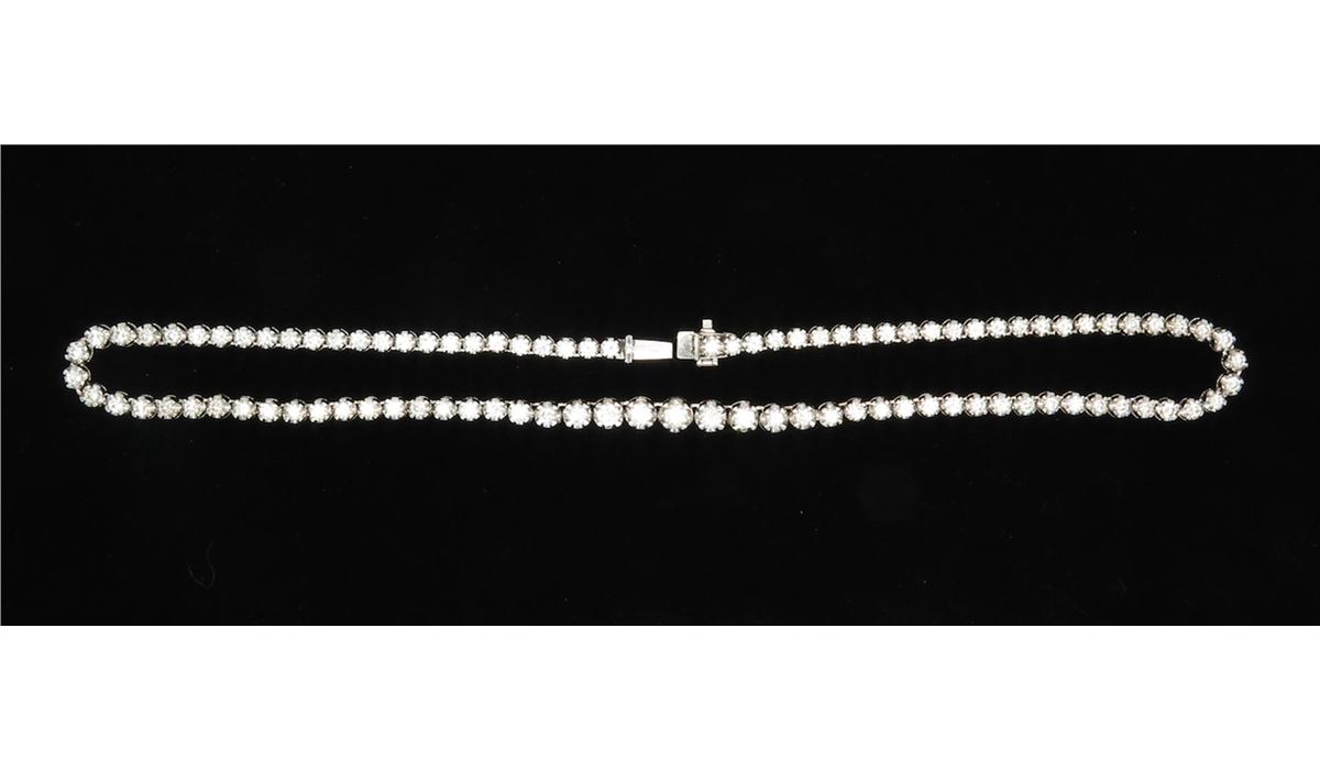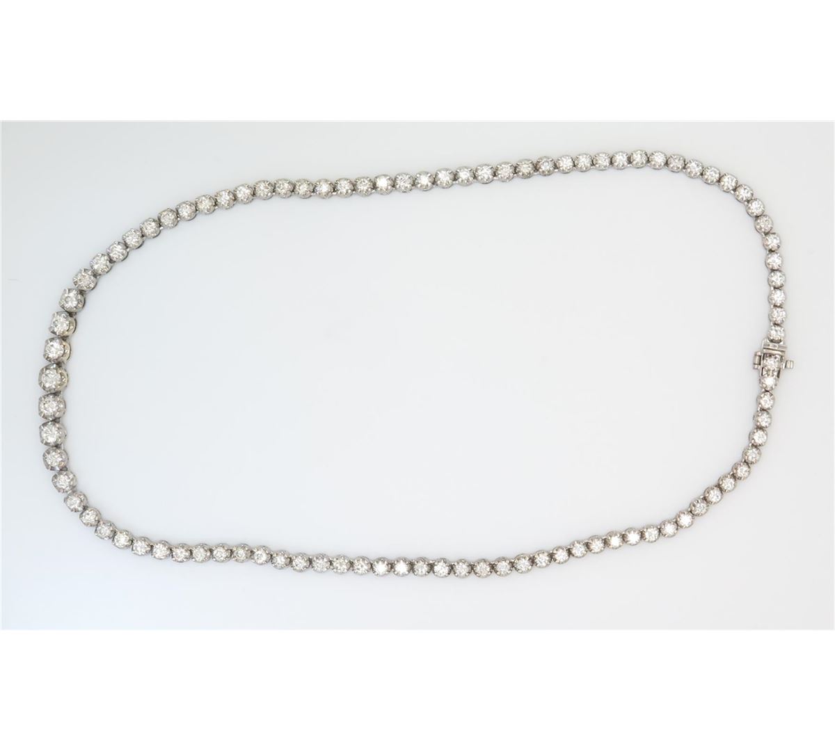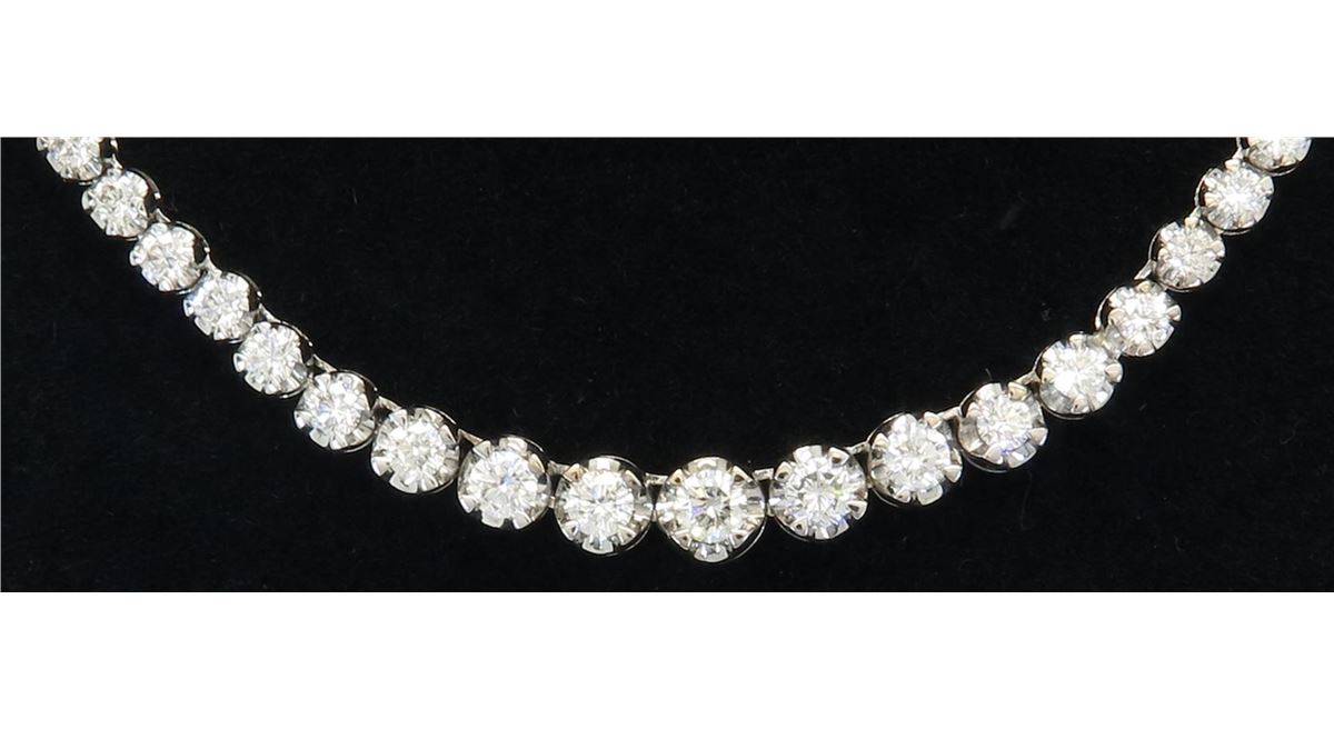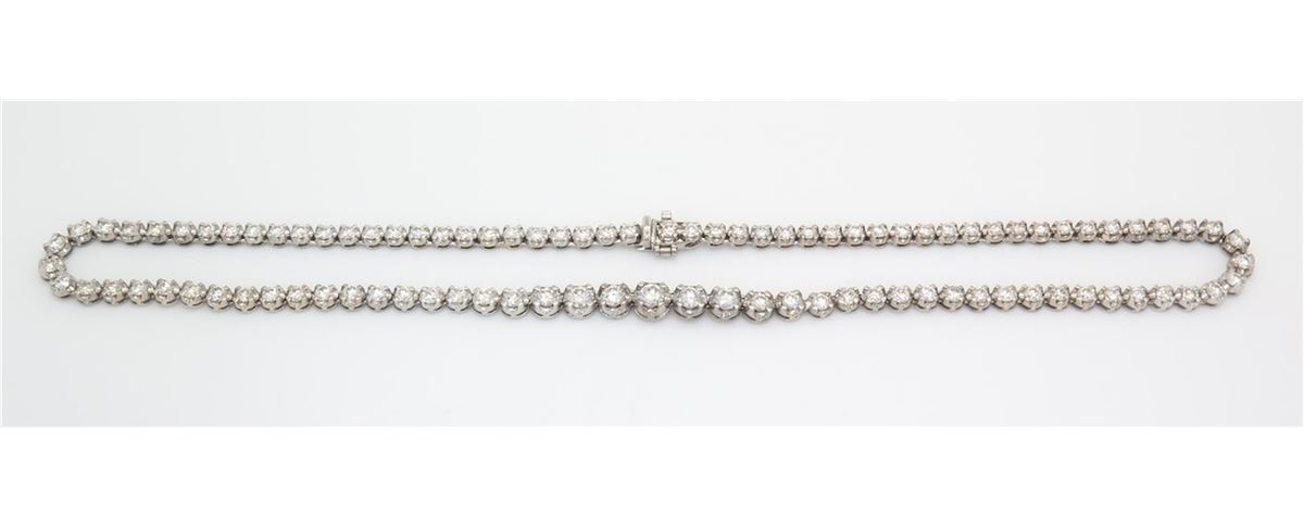 One tested 18K white gold diamond necklace. Containing: 95 Round Brilliant Cut Diamonds, Clarity: VS, Color: F-H. Approximate total diamond weight: 10.00CTW. All diamonds are graded in the mounting unless otherwise stated. Weight of necklace: 29.9 grams, Size: 16.5 inches