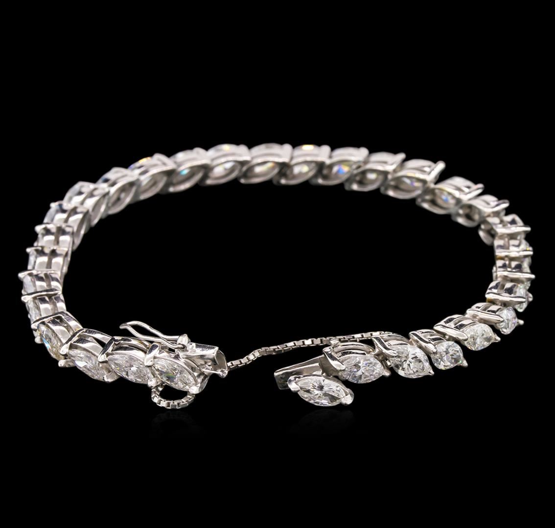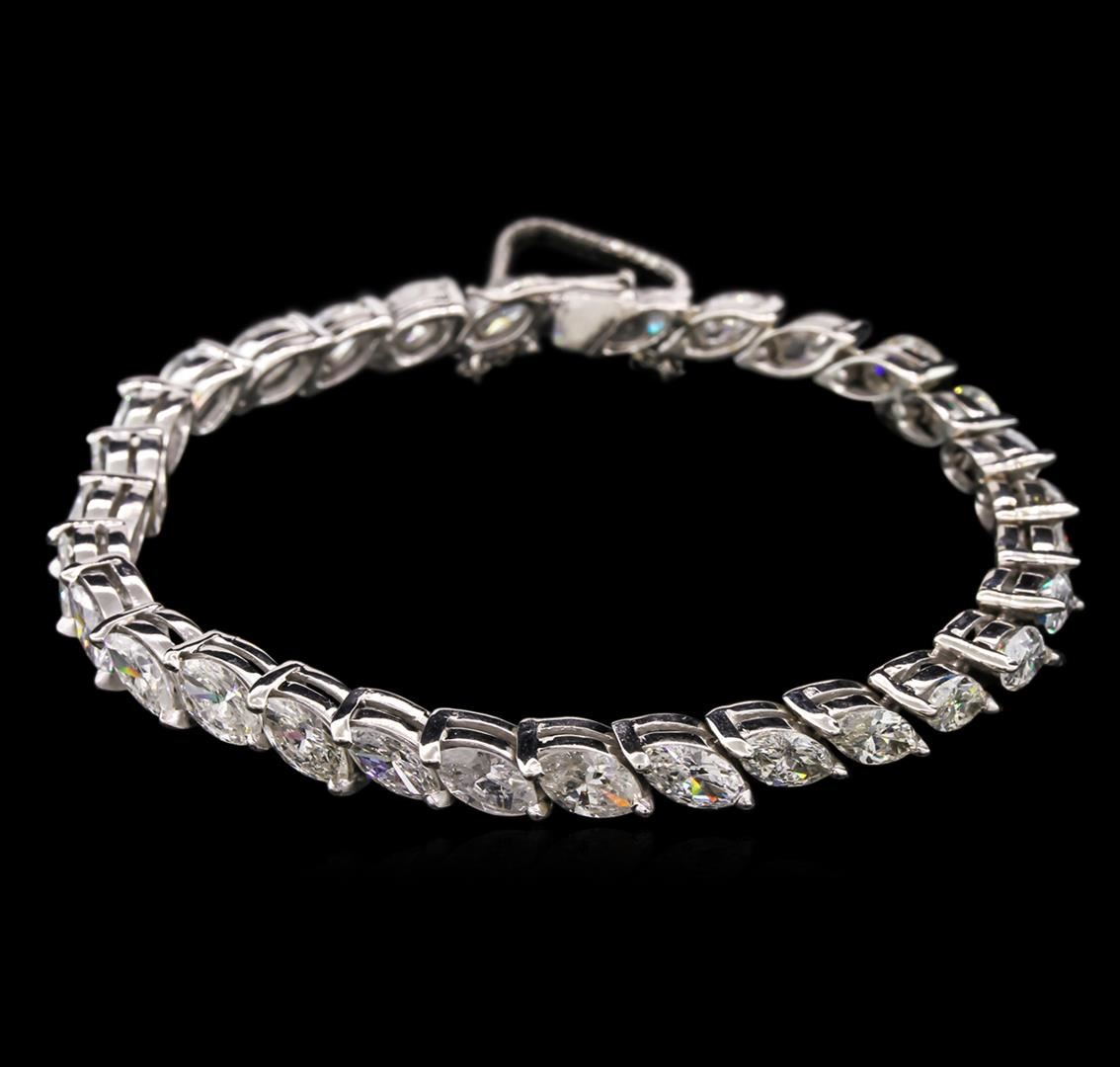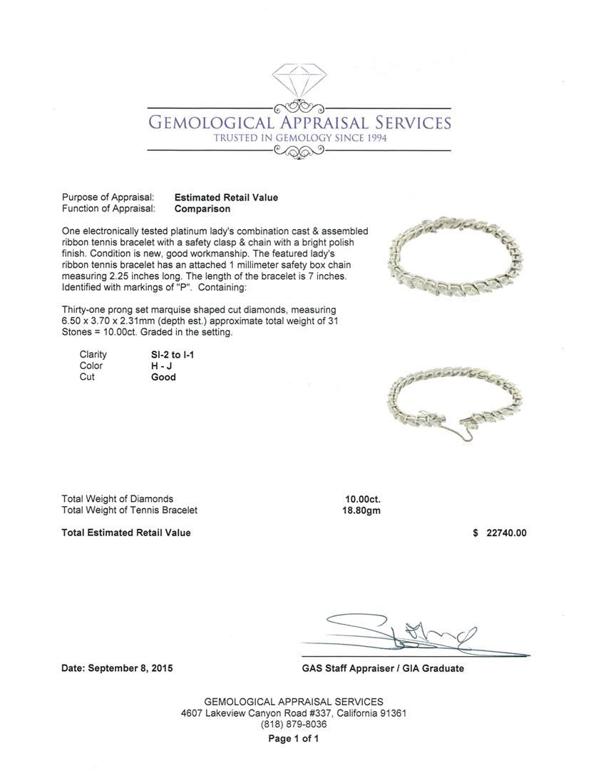 One electronically tested platinum lady's combination cast & assembled ribbon tennis bracelet with a safety clasp & chain with a bright polish finish. The featured lady's ribbon tennis bracelet has an attached 1 millimeter safety box chain measuring 2.25 inches long. The length of the bracelet is 7 inches. Identified with markings of "P". Condition is new, good workmanship. Containing: Thirty-One prong set marquise shaped cut diamonds, measuring 6.50 x 3.70 x 2.31mm (depth est.) approximate total weight of 31 Stones = 10.00ct. Graded in the setting. Clarity: SI-2 to I-1. Color: H - Good. Total Weight of Diamonds 10.00ct. Total Weight of Tennis Bracelet 18.80gm. GAS Appraised at $22,740.00.