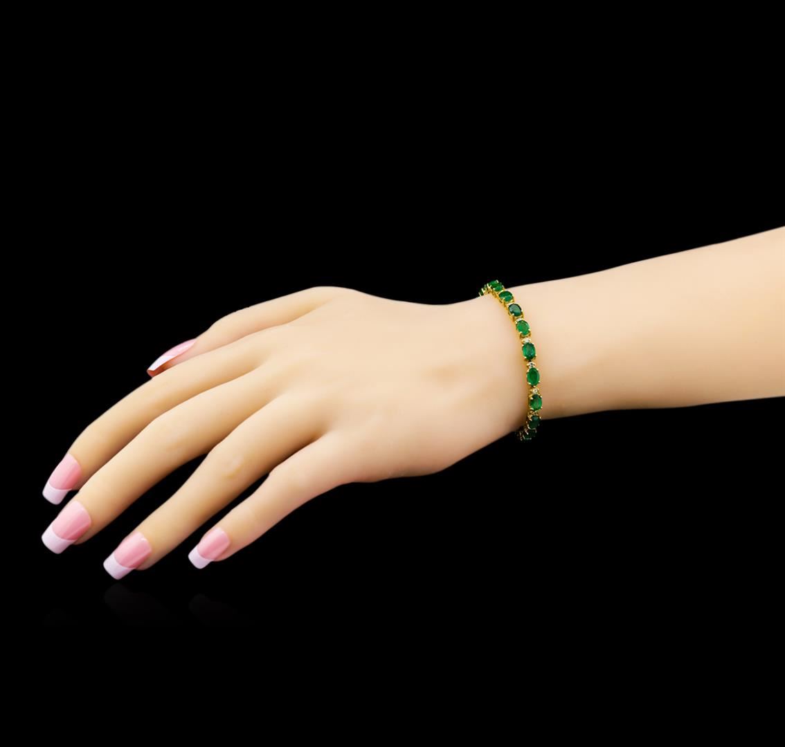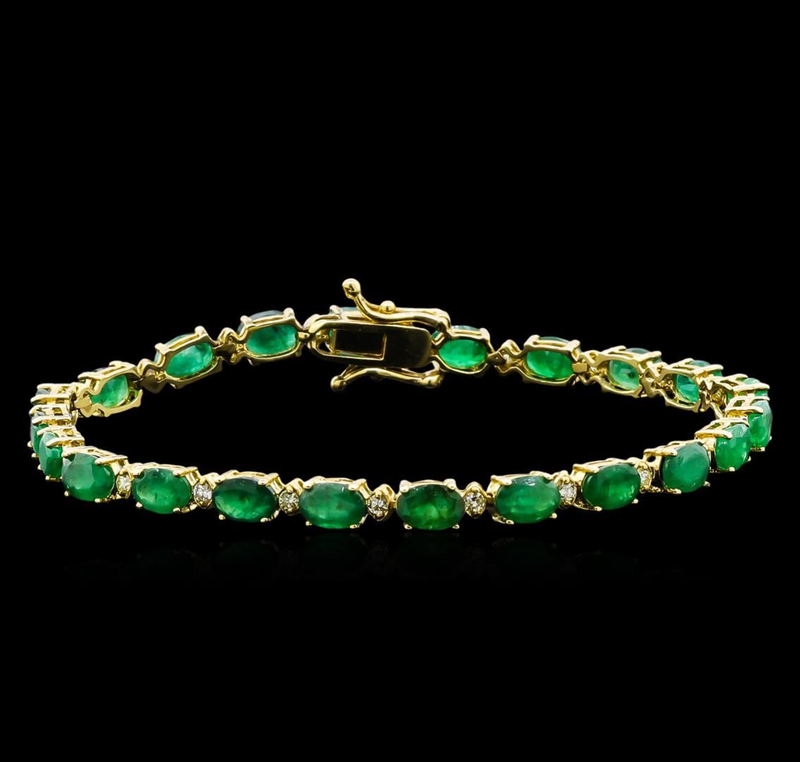 14K Yellow Gold 10CT Emerald 0.60CT Diamond Bracelet. Description: Meal: 14k solid yellow gold. Face Measurements: 4 x 185mm. Size: 7.25. Finish: bright polish. Total Item Weight: 9.0 grams. Markings: stamped 14K. Country Made: USA. Main Stone: emerald. Quantity: 22. Shape: oval. Color: green. Carat Total Weight: 10.00. Measurements: 4 x 6 mm. Treatment: none. Setting: prong. Hue: green. Saturation: moderately strong. Tone: dark. Clarity: type 2. Cut: very good. Secondary Stone: diamond. Quantity: 22. Shape: round. Color: white. Carat Total Weight: 0.60. Measurements: 1.7mm. Treatment: none Setting: prong. Color Grade: G-H. Clarity: SI1-SI2. Cut: very good. Excellent Workmanship. Gemstones graded in the mounting. BHGL Appraised at $11,680.00.