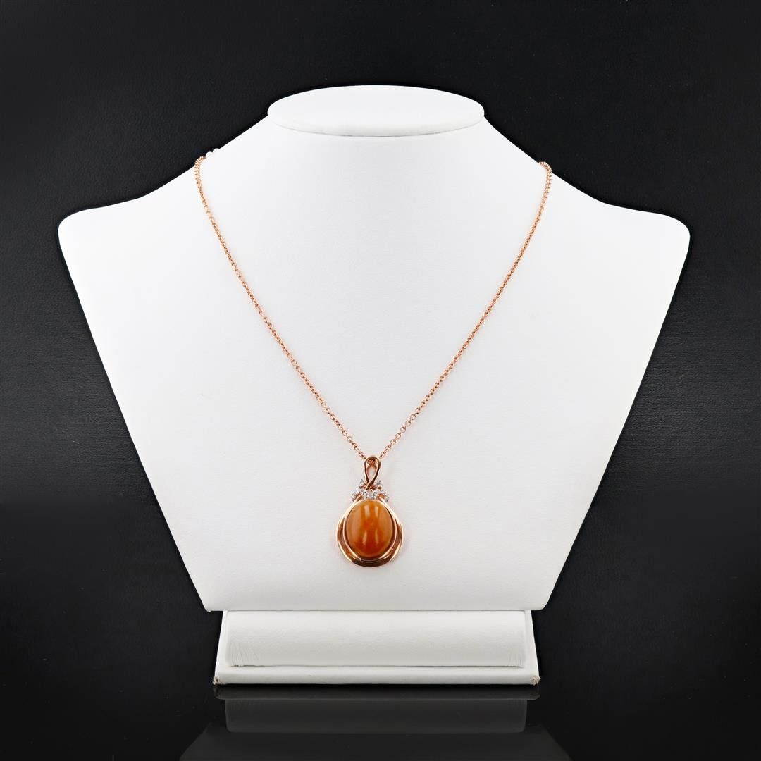 10.01ct Opal and 0.15ctw Diamond 14K Rose Gold Pendant. One electronically tested 14KT rose gold ladies cast and assembled opal and diamond pendant with chain. Condition is new, good workmanship. The pendant features an opal cabochon set within rose gold bezels, completed by a diamond accented bail. The pendant is supported by an eighteen inch length 14KT rose gold link chain, terminating in a lobster claw clasp. Bright polish finish with rhodium accents. Trademark is A. I. Identified with markings of "14K". One bezel set oval cabochon cut natural ethiopian opal, measuring 16.50 x 12.50 x 8.95mm, approximate weight of 10.01ct. The opal has a dull, multicolor play of color (fire) in a harlequin pattern a high dome a good cut no inclusions major dull spot in its brightness and pattern and is slightly directional. Graded in the setting. Ten prong set round brilliant cut diamonds approximate total weight of 10 Stones = 0.15ct. Graded in the setting. Clarity: I-1 to I-2 Color: F - G Total Weight of Colored Stones: 10.01ct. Total Weight of Diamonds: 0.15ct. Total Weight of Pendant With Chain: 8.71 gm