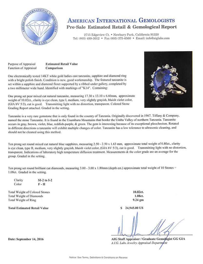 One electronically tested 14KT white gold ladies cast tanzanite, sapphire and diamond ring with a bright polish finish. The featured tanzanite is set within a sapphire and diamond floret supported by a ribbed under gallery, completed by a two millimeter wide band. Identified with markings of 'K14'. Condition is new, good workmanship. Containing: One prong set pear mixed cut natural tanzanite, measuring 17.30 x 13.10 x 6.60mm, approximate weight of 10.02ct., clarity is eye clean, type I, medium, very slightly grayish, bluish violet color, (GIA bV 5/3), cut is good. Transmitting light with no distortion, transparent. Colored Stone Grading Report attached. Graded in the setting. Tanzanite is a very rare gemstone that is only found in the country of Tanzania. Originally discovered in 1967. Tiffany & Company, named the stone Tanzanite. It is found in the Usumburu Mountains that border the Umba Valley of northern Tanzania. Tanzanite occurs in gray, brown, violet, blue, reddish-purple, & green. The gem is interesting because of its exceptional pleochroism. Rotated in different directions a tanzanite will exhibit multiple changes of color. Tanzanite has a low tolerance to ultrasonic cleaning, and should not be cleaned using this method. Ten prong set round mixed cut natural blue sapphires, measuring 2.50 - 2.50 x 1.63 mm, approximate total weight of 0.80ct., clarity is eye clean, type II, medium, very slightly grayish, bluish violet color, (GIA bV 5/3), cut is good. Transmitting light with no distortion, transparent. Indications of laboratory high temperature diffusion treatment. Measurements & the color grade are an average for the group. Graded in the setting. Ten prong set round brilliant cut diamonds, measuring 3.00 - 3.00 x 1.80mm (depth est.) approximate total weight of 10 Stones = 1.08ct. Graded in the setting. Clarity SI-2 to I-2. Color: F - H. Total Weight of Colored Stones 10.82ct.. Total Weight of Diamonds 1.08ct.. Total Weight of Ring 9.24gm. AIG Appraised at $24,945.00.