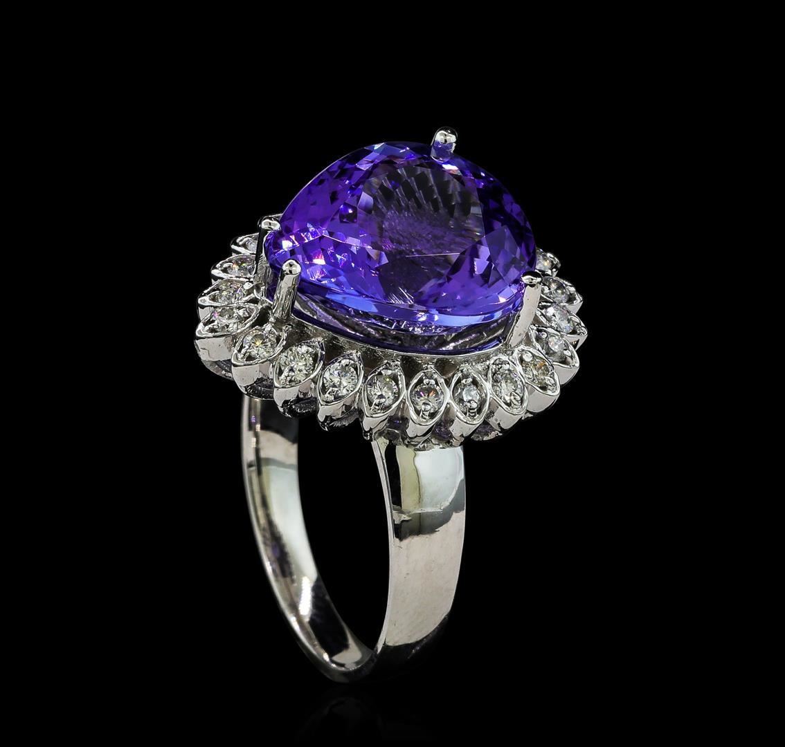 One electronically tested 14KT white gold ladies cast tanzanite and diamond ring with a bright polish finish. The featured tanzanite is set within a diamond floret supported by a ribbed under gallery and tapering shoulders, completed by a two and one-half millimeter wide band. Identified with markings of 'K14'. Condition is new, good workmanship. Containing: One prong set pear mixed cut natural tanzanite, measuring 14.40 x 12.30 x 7.85mm, 8%. bulge factor, approximate weight of 10.06ct., clarity is eye clean, type I, medium, very slightly grayish, bluish violet color, (GIA bV 5/3), cut is good. Transmitting light with no distortion, transparent. Colored Stone Grading Report attached. Graded in the setting. Tanzanite is a very rare gemstone that is only found in the country of Tanzania. Originally discovered in 1967. Tiffany & Company, named the stone Tanzanite. It is found in the Usumburu Mountains that border the Umba Valley of northern Tanzania. Tanzanite occurs in gray, brown, violet, blue, reddish-purple, & green. The gem is interesting because of its exceptional pleochroism. Rotated in different directions a tanzanite will exhibit multiple changes of color. Tanzanite has a low tolerance to ultrasonic cleaning, and should not be cleaned using this method. Twenty-Three prong set round brilliant cut diamonds, measuring 1.70 - 1.70 x 1.02mm (depth est.) approximate total weight of 23 Stones = 0.51ct. The clarity grade reflects the entire range of clarity for this group. Graded in the setting. Clarity SI-1 to I-2. Color: F - H. Total Weight of Colored Stones 10.06ct.. Total Weight of Diamonds 0.51ct.. Total Weight of Ring 8.74gm. AIG Appraised.