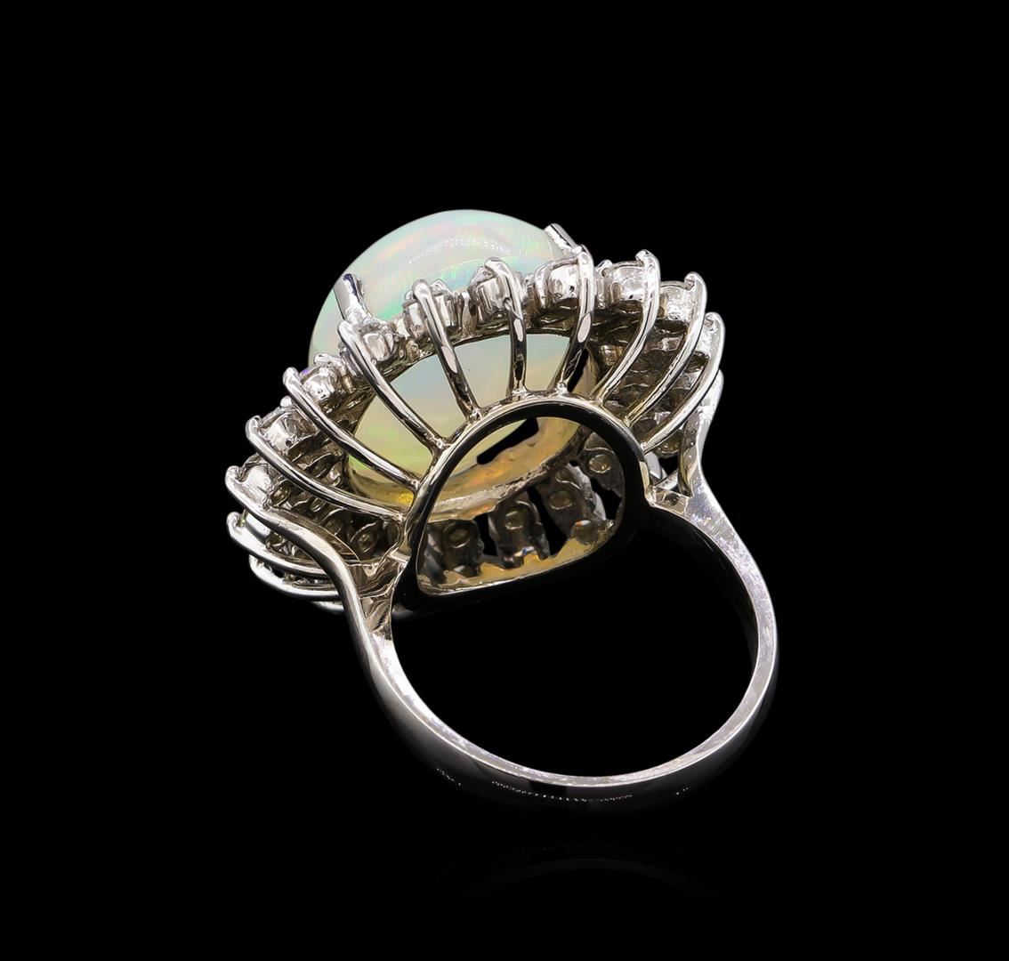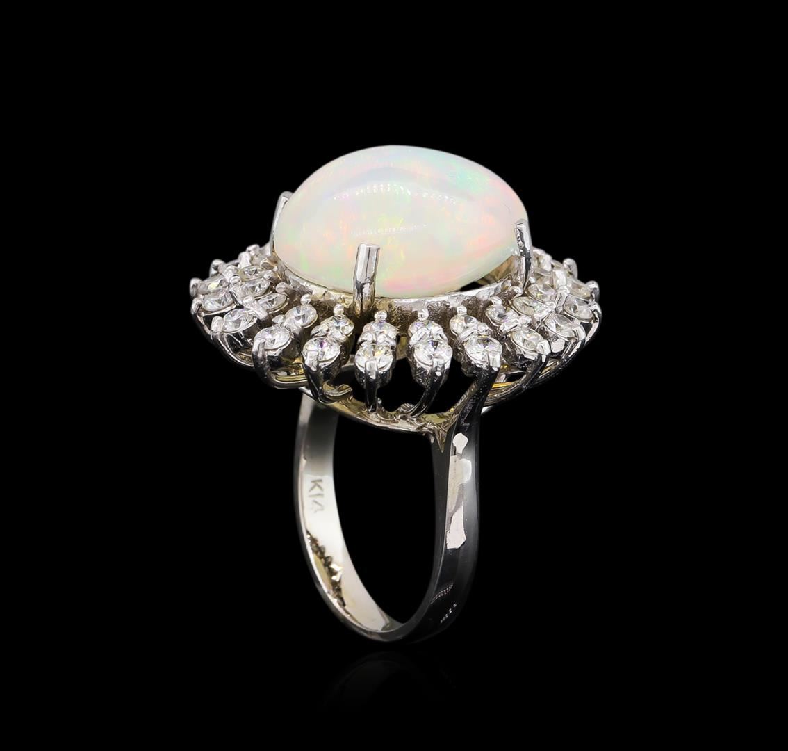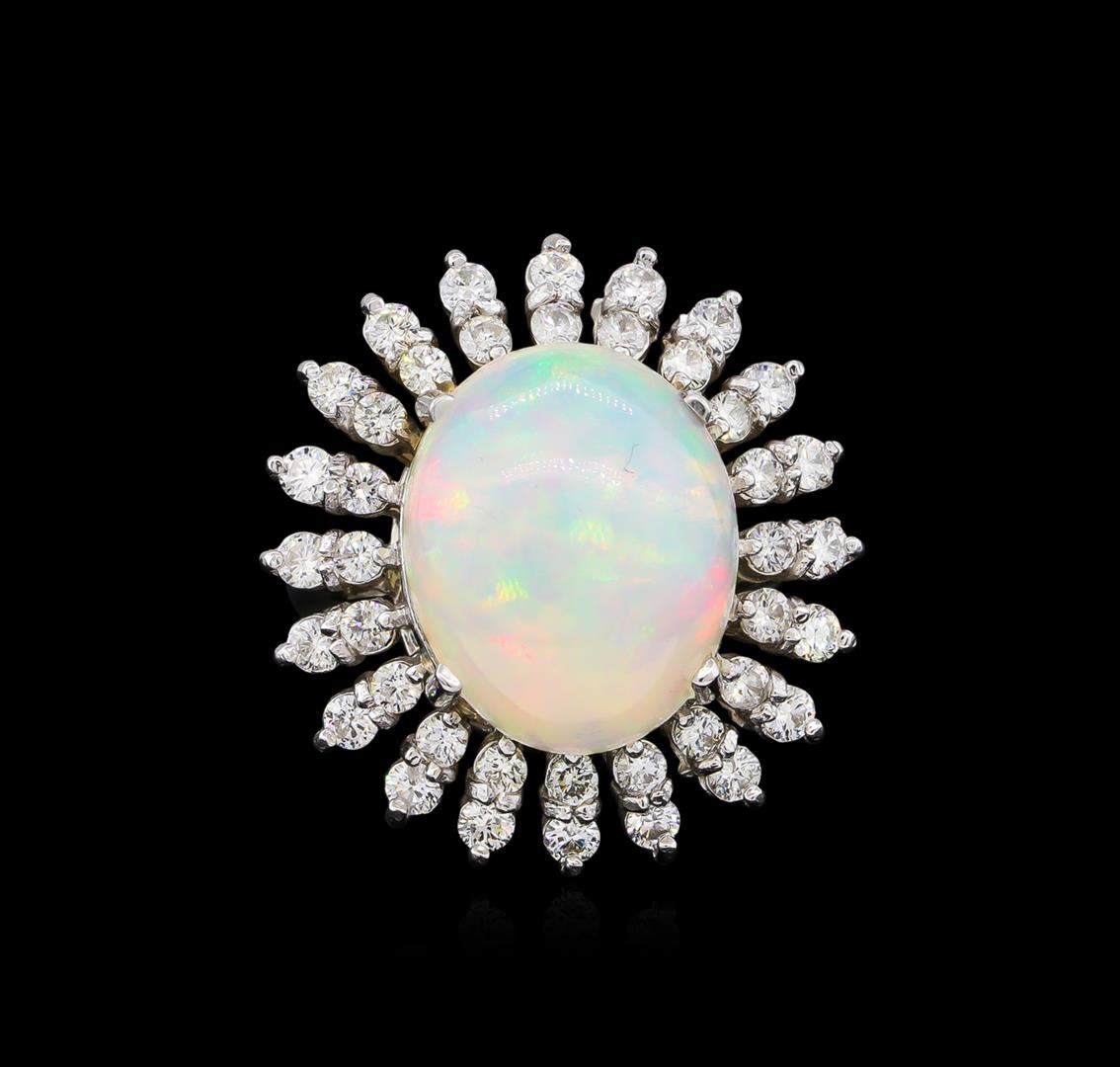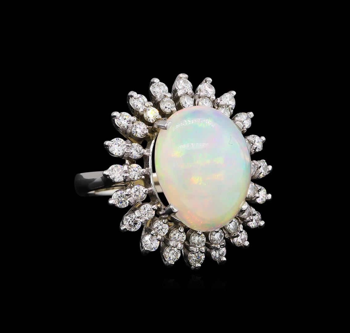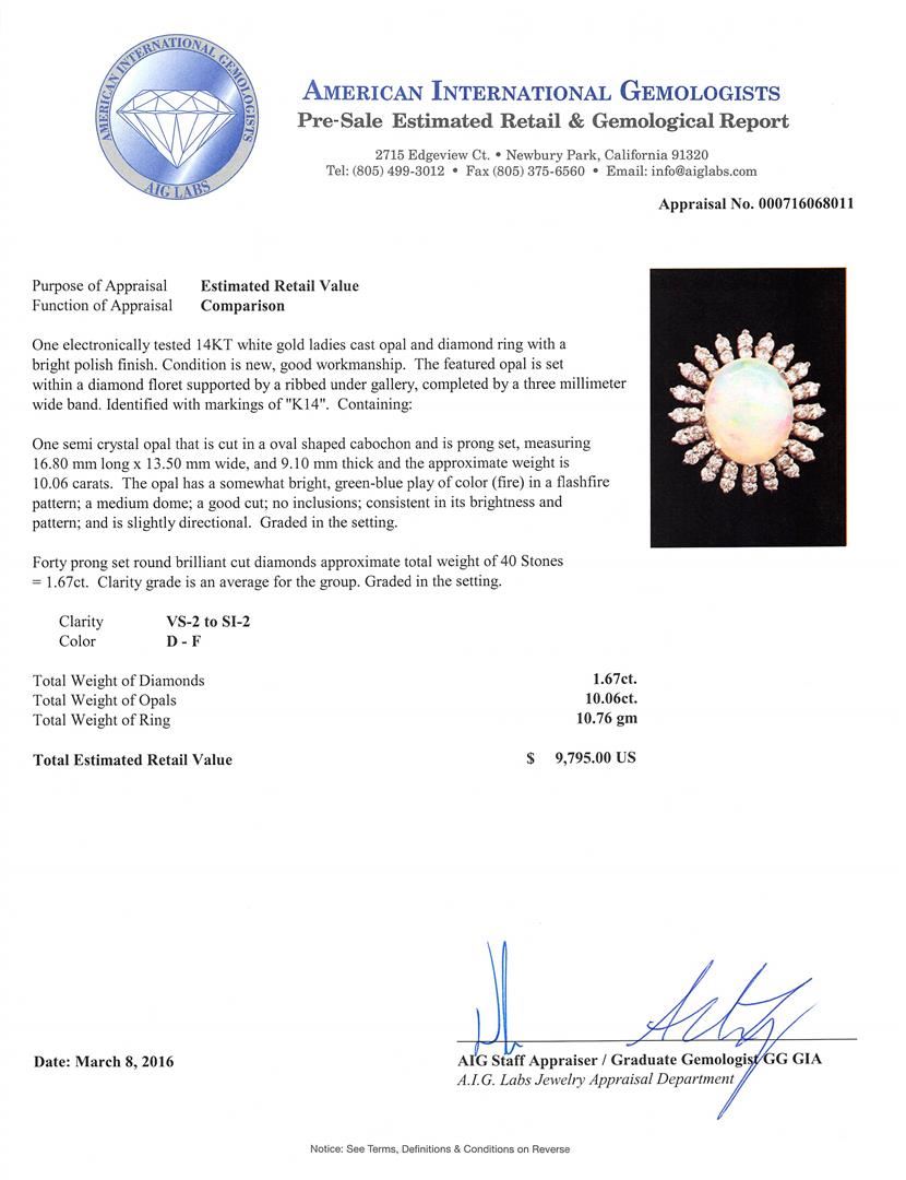 One electronically tested 14KT white gold ladies cast opal and diamond ring with a bright polish finish. The featured opal is set within a diamond floret supported by a ribbed under gallery, completed by a three millimeter wide band. Identified with markings of "K14". Condition is new, good workmanship. Containing: One semi crystal opal that is cut in a oval shaped cabochon and is prong set, measuring 16.80 mm long x 13.50 mm wide, and 9.10 mm thick and the approximate weight is 10.06 carats. The opal has a somewhat bright, green-blue play of color (fire) in a flashfire pattern; a medium dome; a good cut; no inclusions; consistent in its brightness and pattern; and is slightly directional. Graded in the setting. Forty prong set round brilliant cut diamonds approximate total weight of 40 Stones = 1.67ct. Clarity grade is an average for the group. Graded in the setting. Clarity: VS-2 to SI-2. Color: D - F. Total Weight of Diamonds 1.67ct. Total Weight of Opals 10.06ct. Total Weight of Ring 10.76gm. AIG Appraised at $9,795.00.
